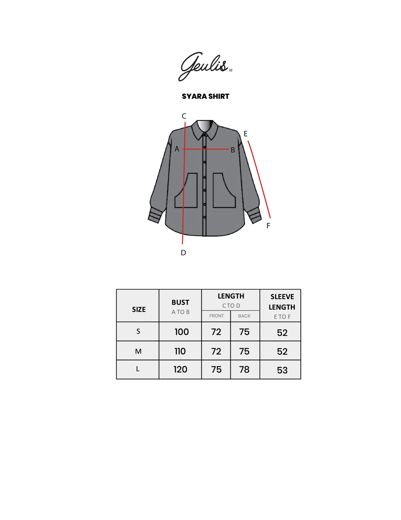 Syara Shirt hadir dengan look clean namun standout melalui front pockets yang membuat siluetnya lebih modern dan bold. Dibuat dari bahan premium cotton yang ringan, lembut dan nyaman, kemeja ini cocok untuk daily wear maupun office look yang ingin tetap terlihat polished tanpa effort. Cutting relaxed-nya membuat mudah di-style β€” bisa dipakai sebagai shirt ataupun outer tipis.