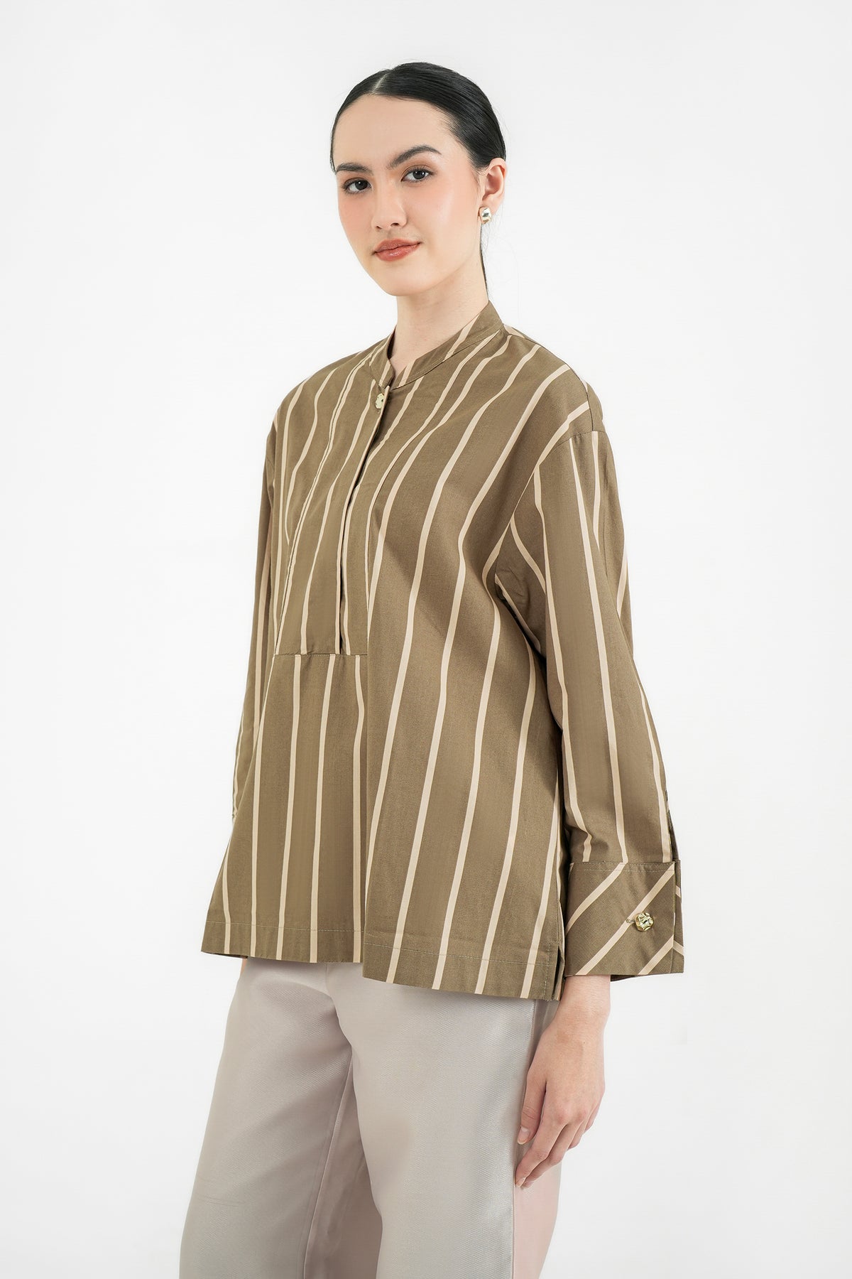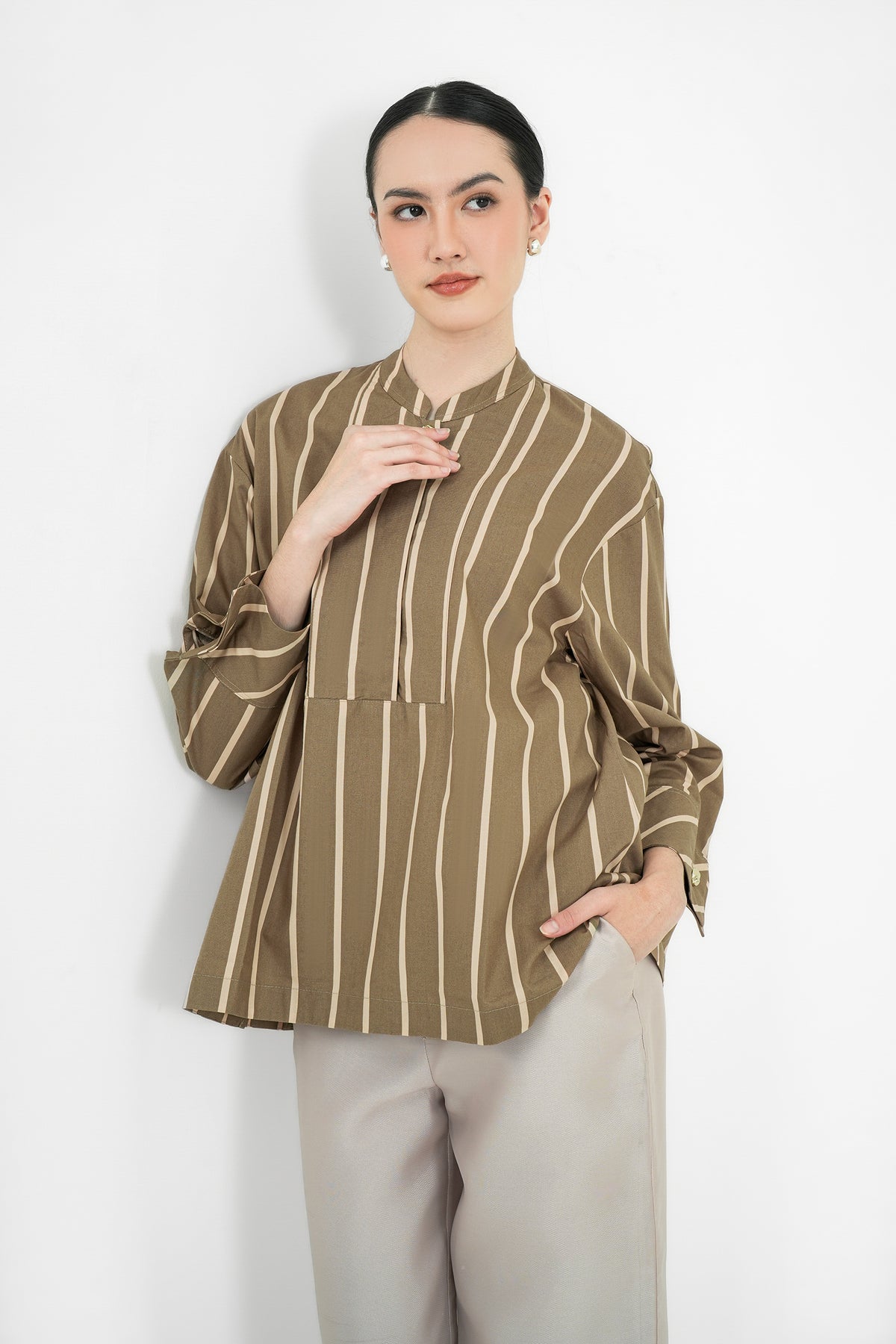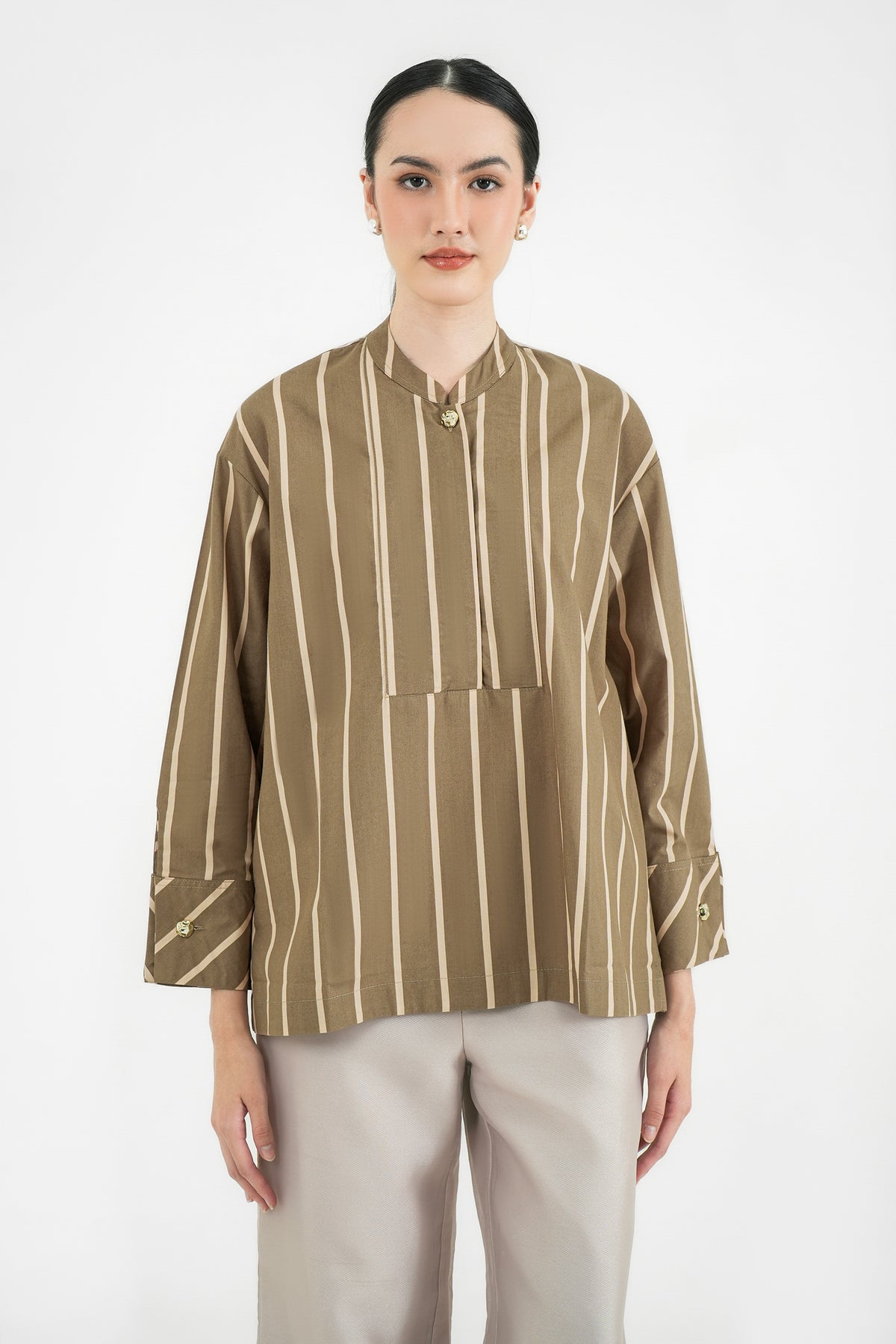 Atasan bergaris dengan cutting relaxed yang nyaman dan clean. Dibuat dari premium cotton yang adem dipakai seharian. Motif stripe vertikal memberi efek tampak lebih jenjang, sementara detail kerah modern dan siluet loose membuatnya effortless namun tetap polished. Cocok untuk office look maupun casual day-out.