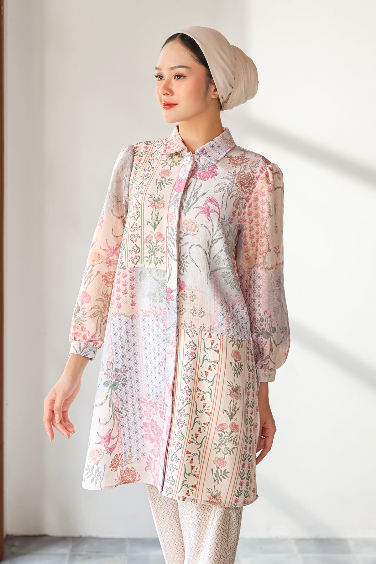 Tunic berbahan Polytextured mix dengan lengan di lapis dengan polysheer