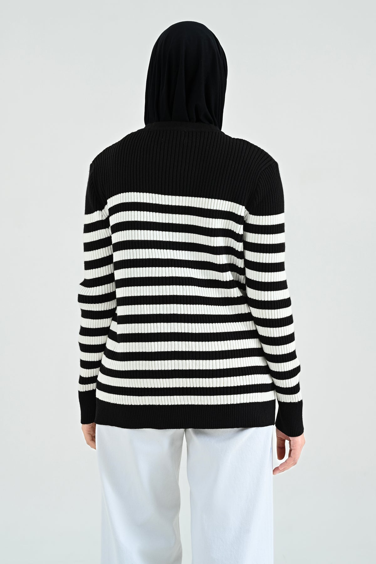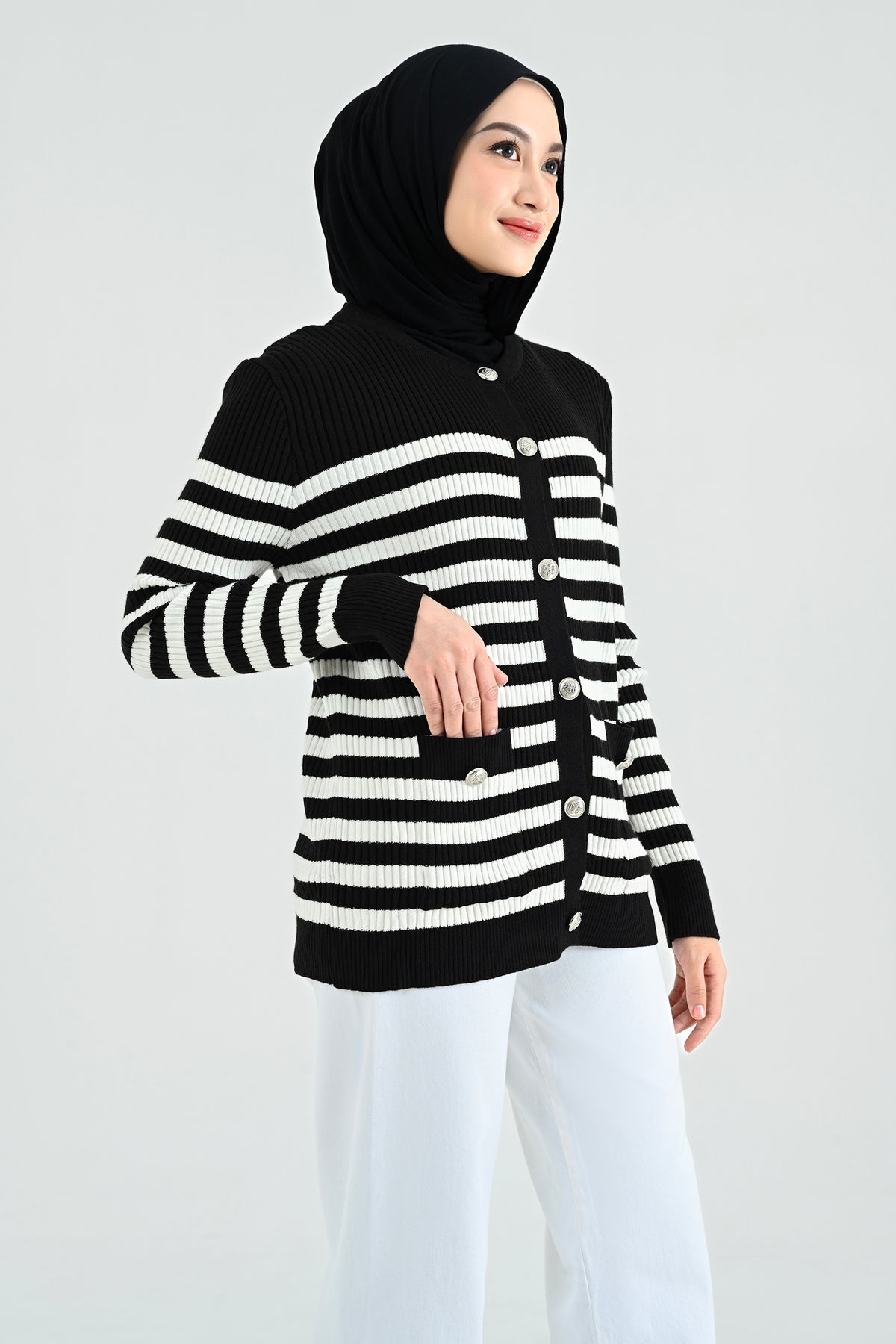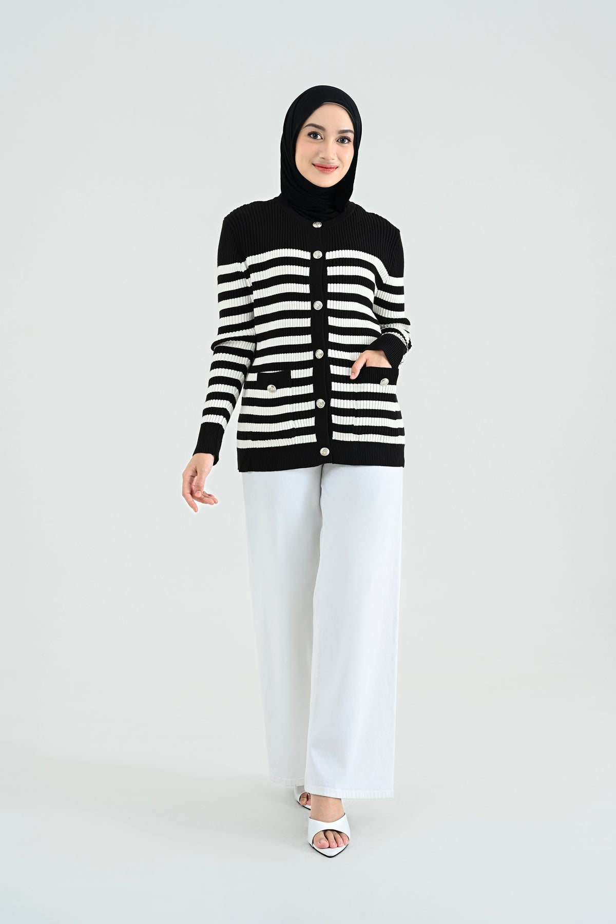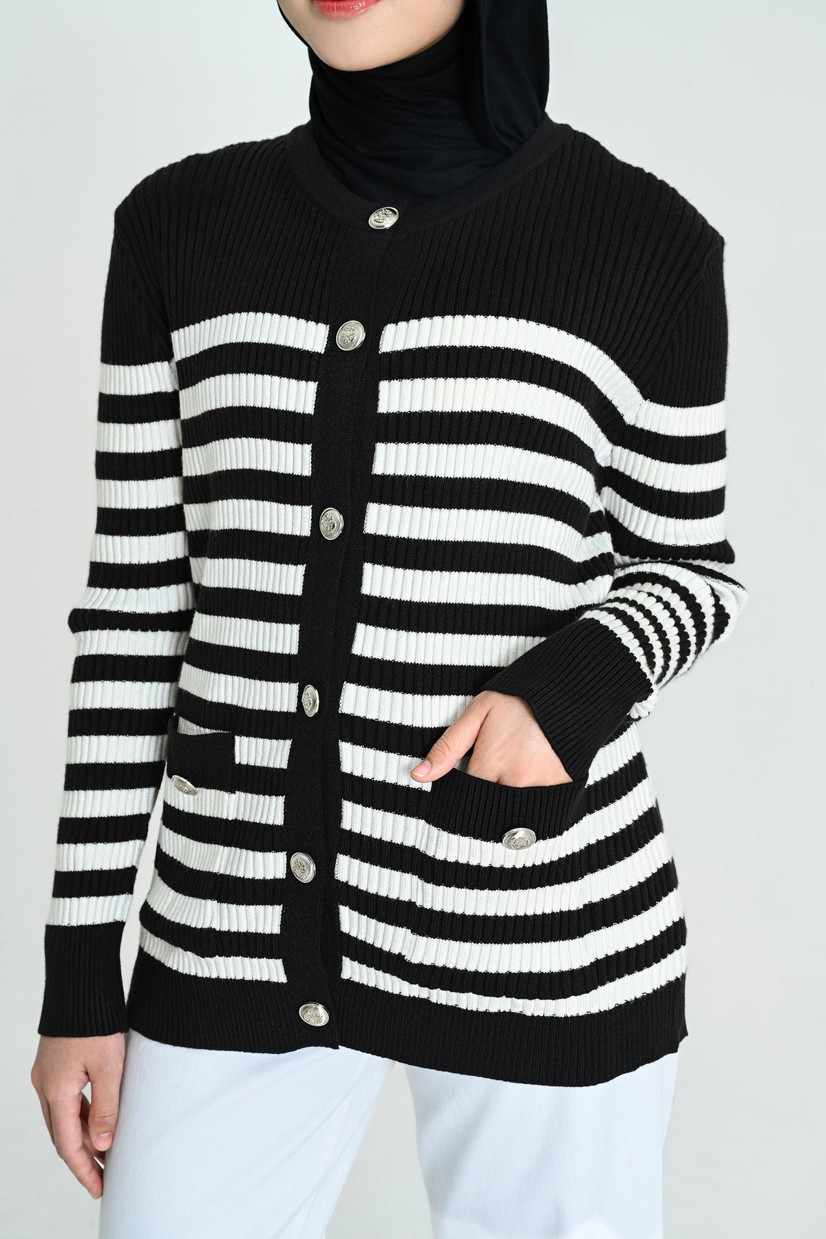 Didesain dengan kombinasi stripes klasik dan nuansa hitam putih yang timeless, cardigan ini memberikan sentuhan chic yang effortlessly stylish. Detail kancing dan kantong depannya menambah karakter yang elegan namun tetap kasual
