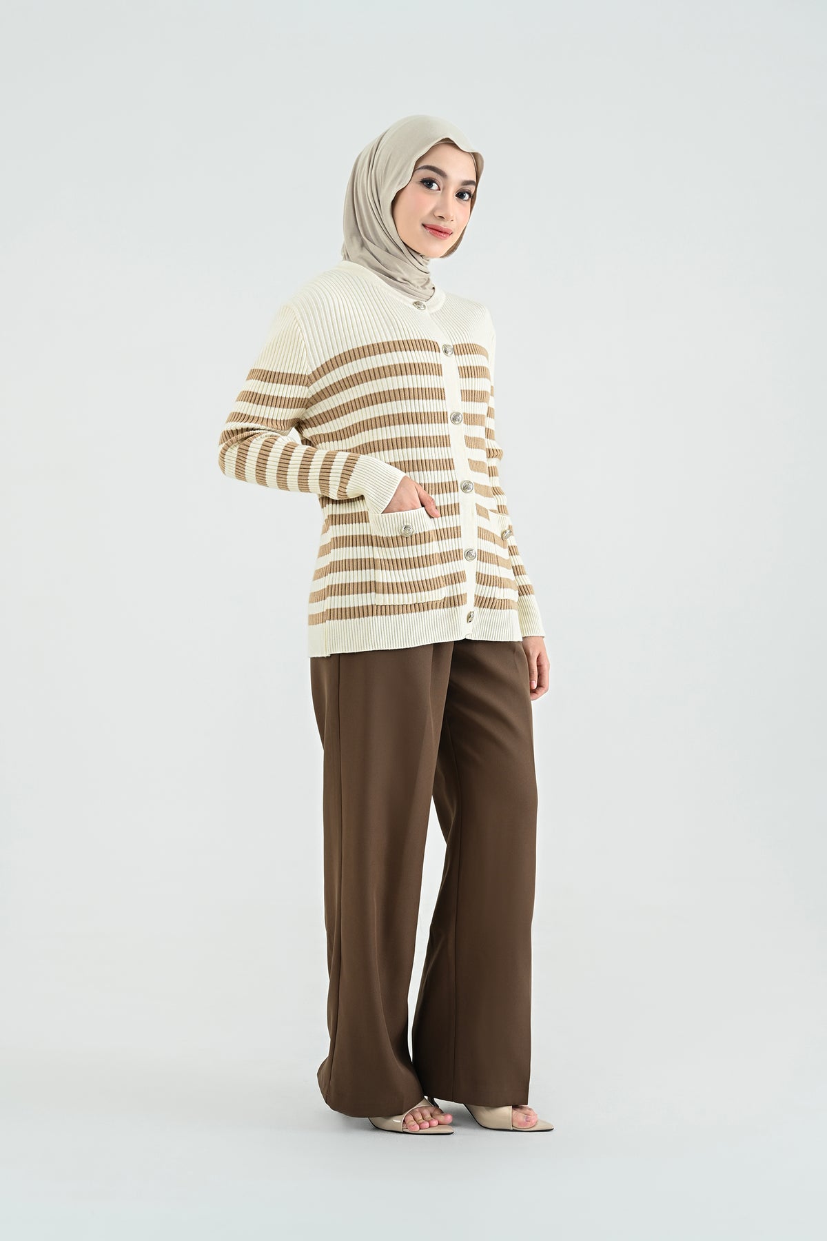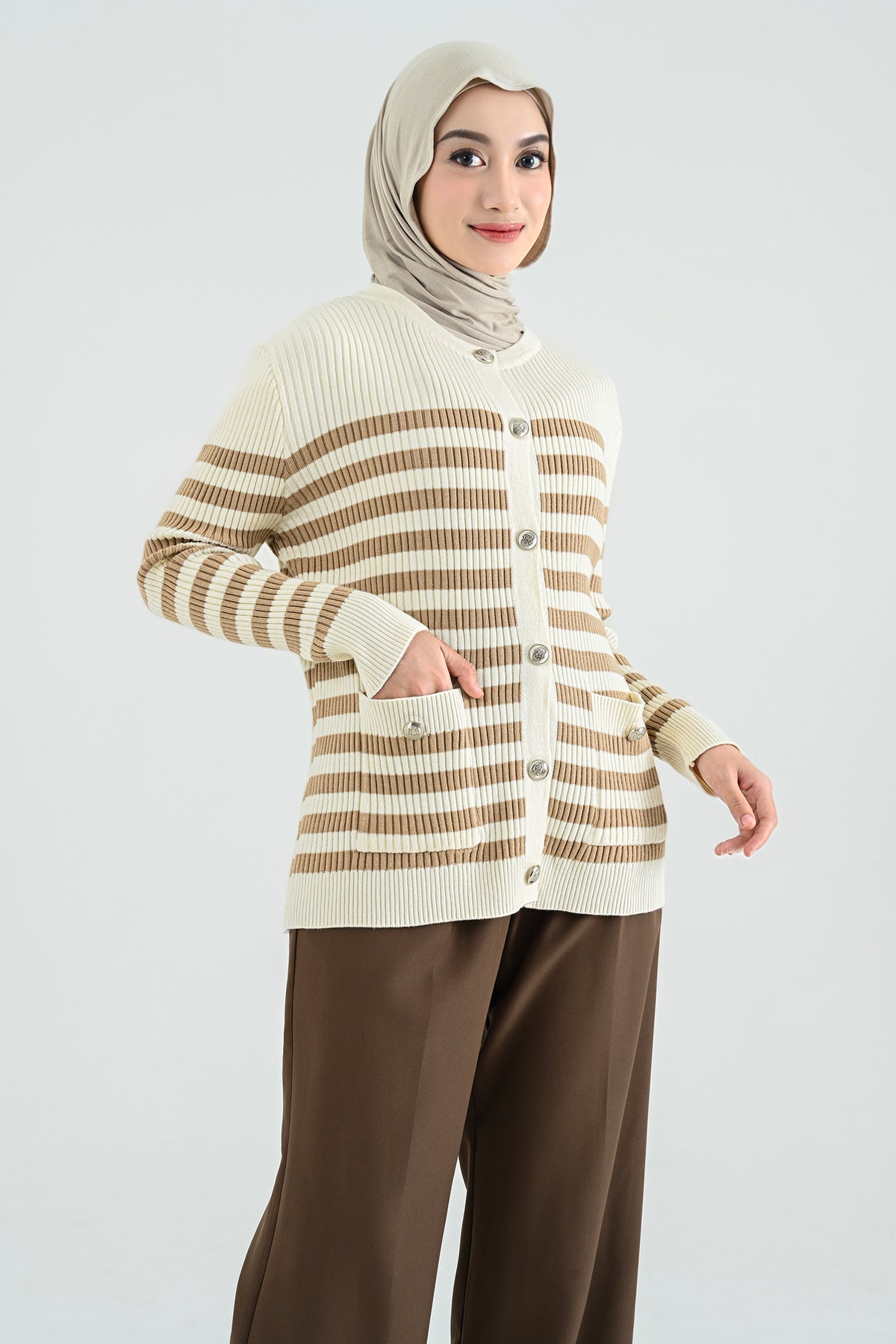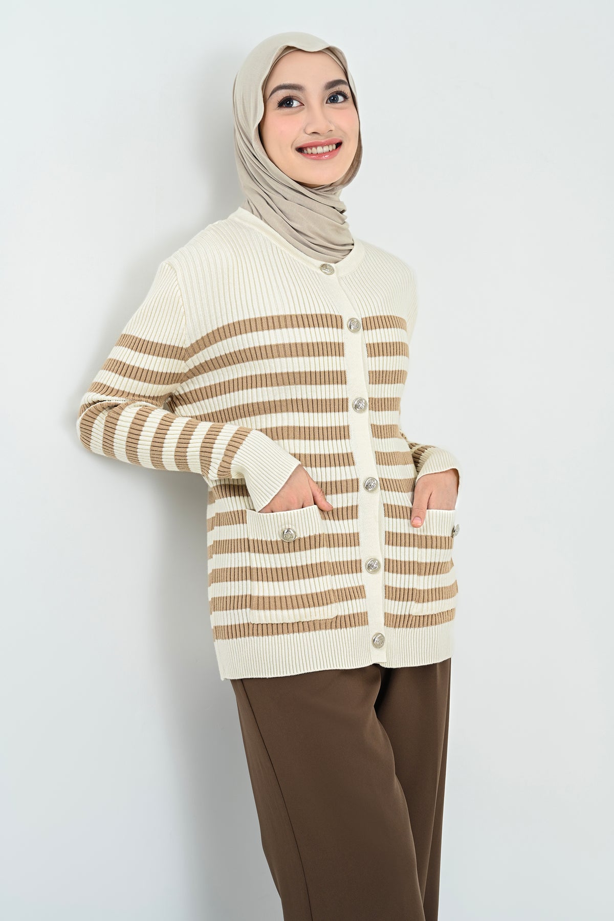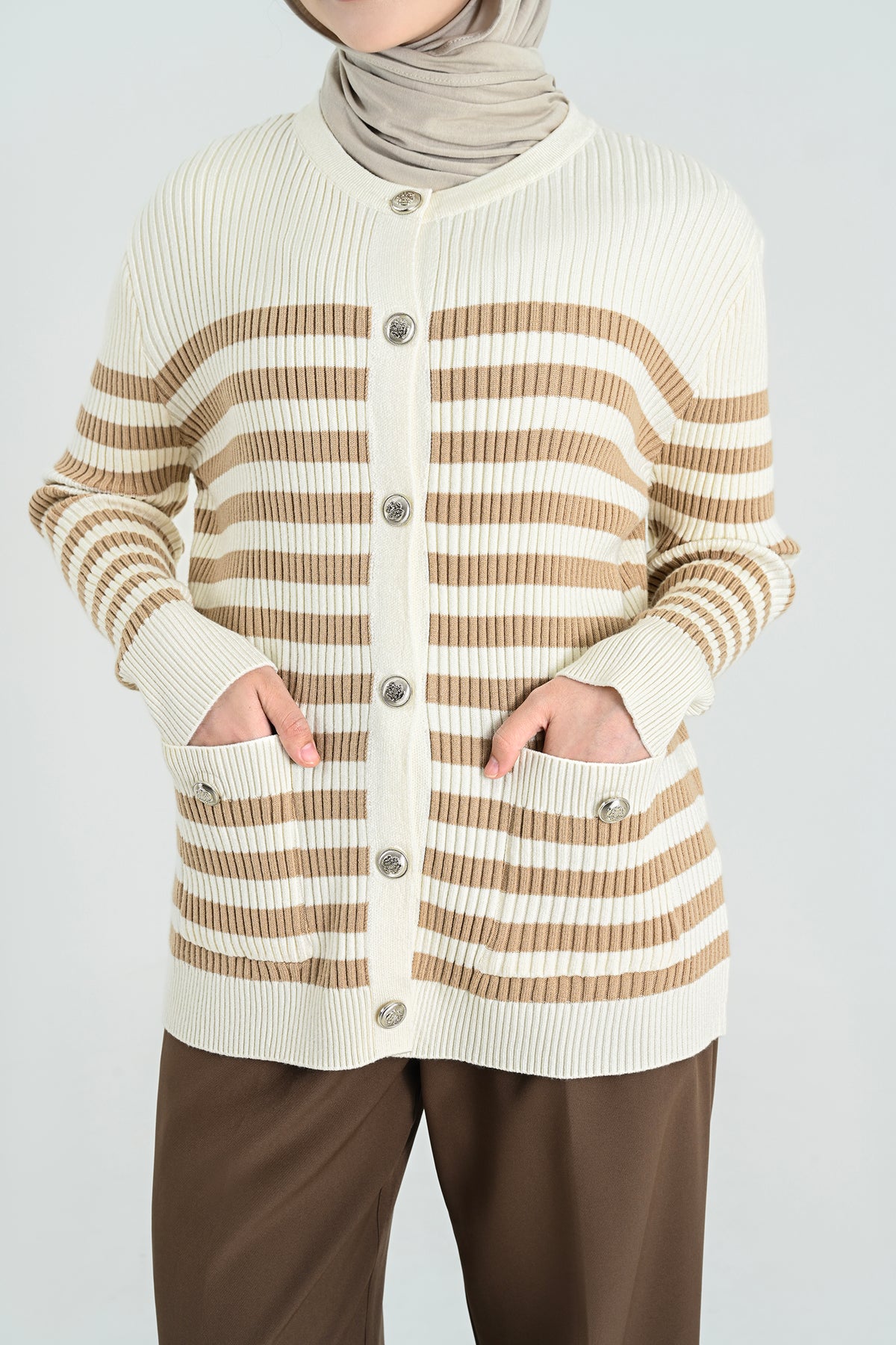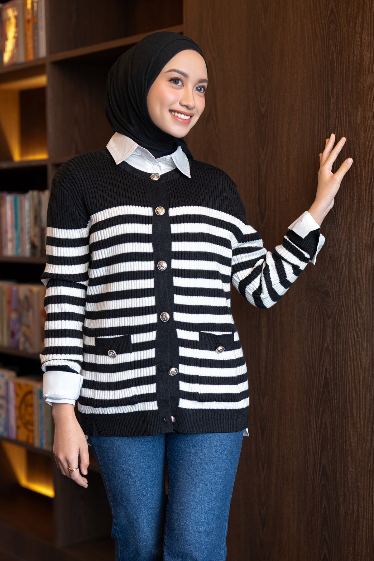 Didesain dengan kombinasi stripes klasik dan nuansa hitam putih yang timeless, cardigan ini memberikan sentuhan chic yang effortlessly stylish. Detail kancing dan kantong depannya menambah karakter yang elegan namun tetap kasual