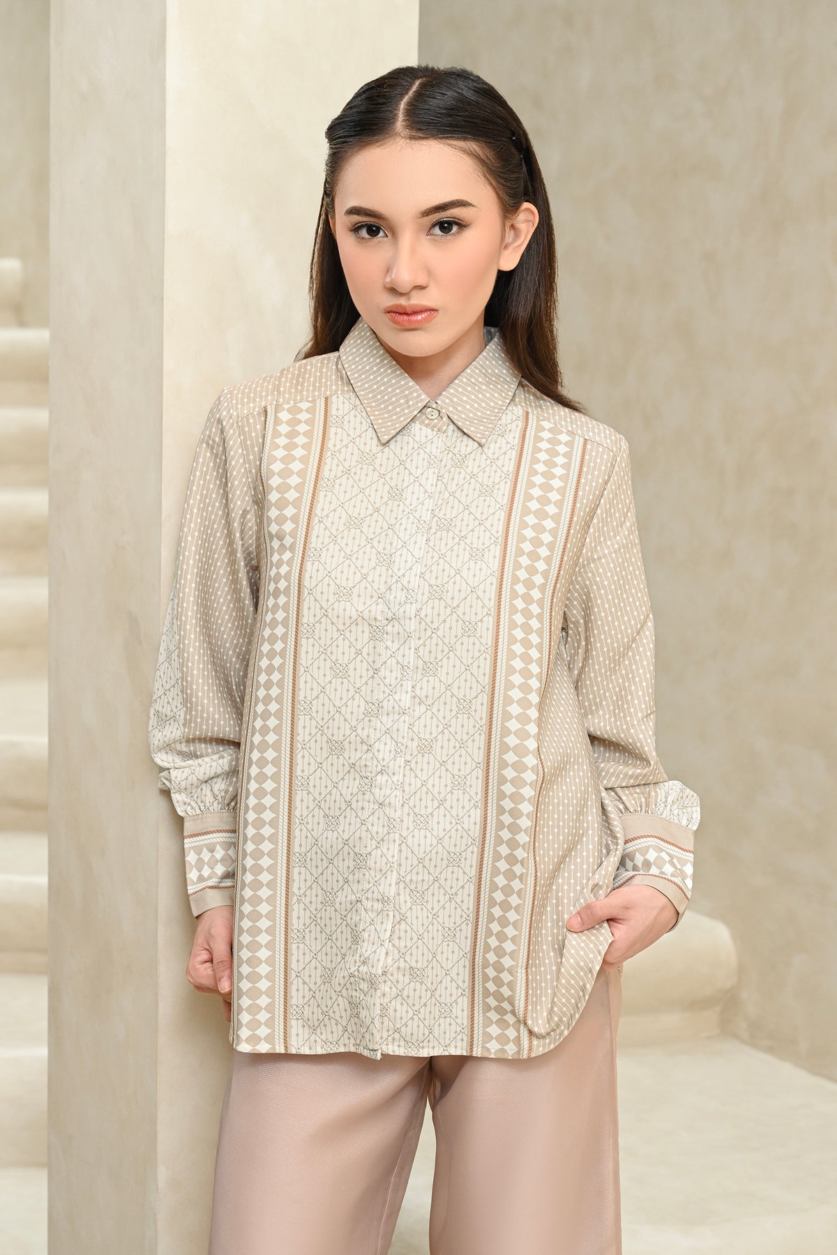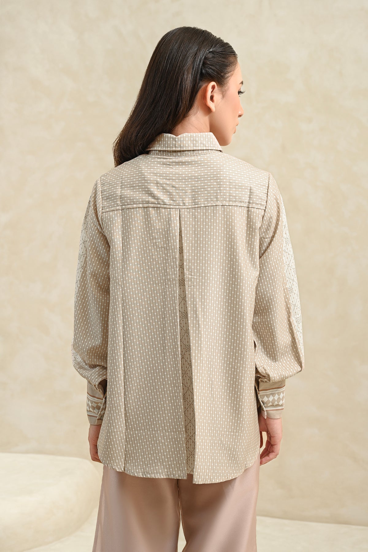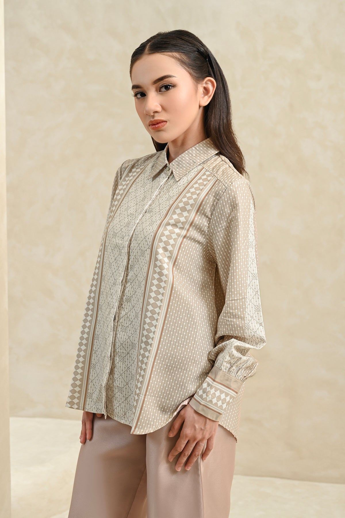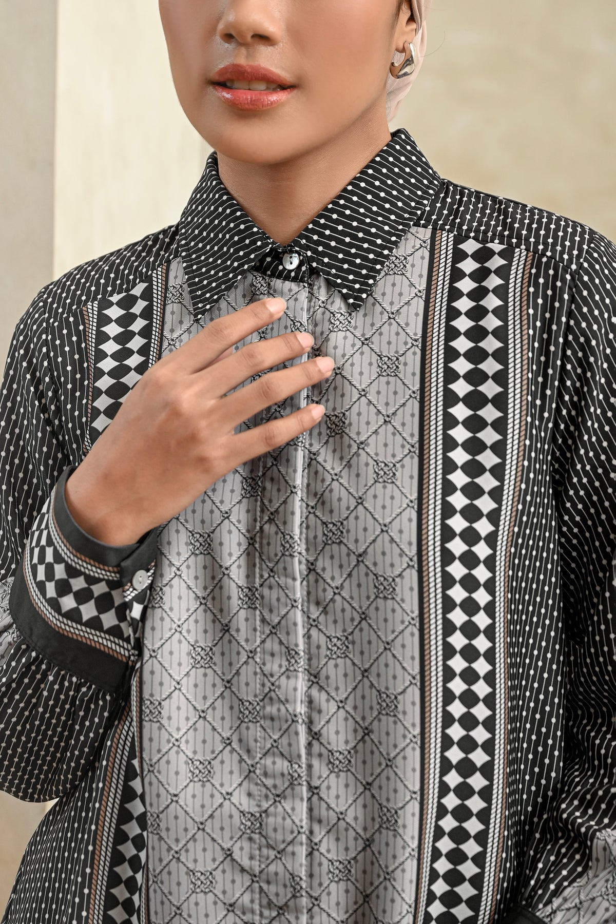 Memberikan kesan statement yang kuat, shirt ini dirancang dengan detail pattern yang tegas dan berkarakter. Perpaduan desain modern dan potongan yang nyaman membuatnya mudah dikenakan seharian, cocok untuk acara special.