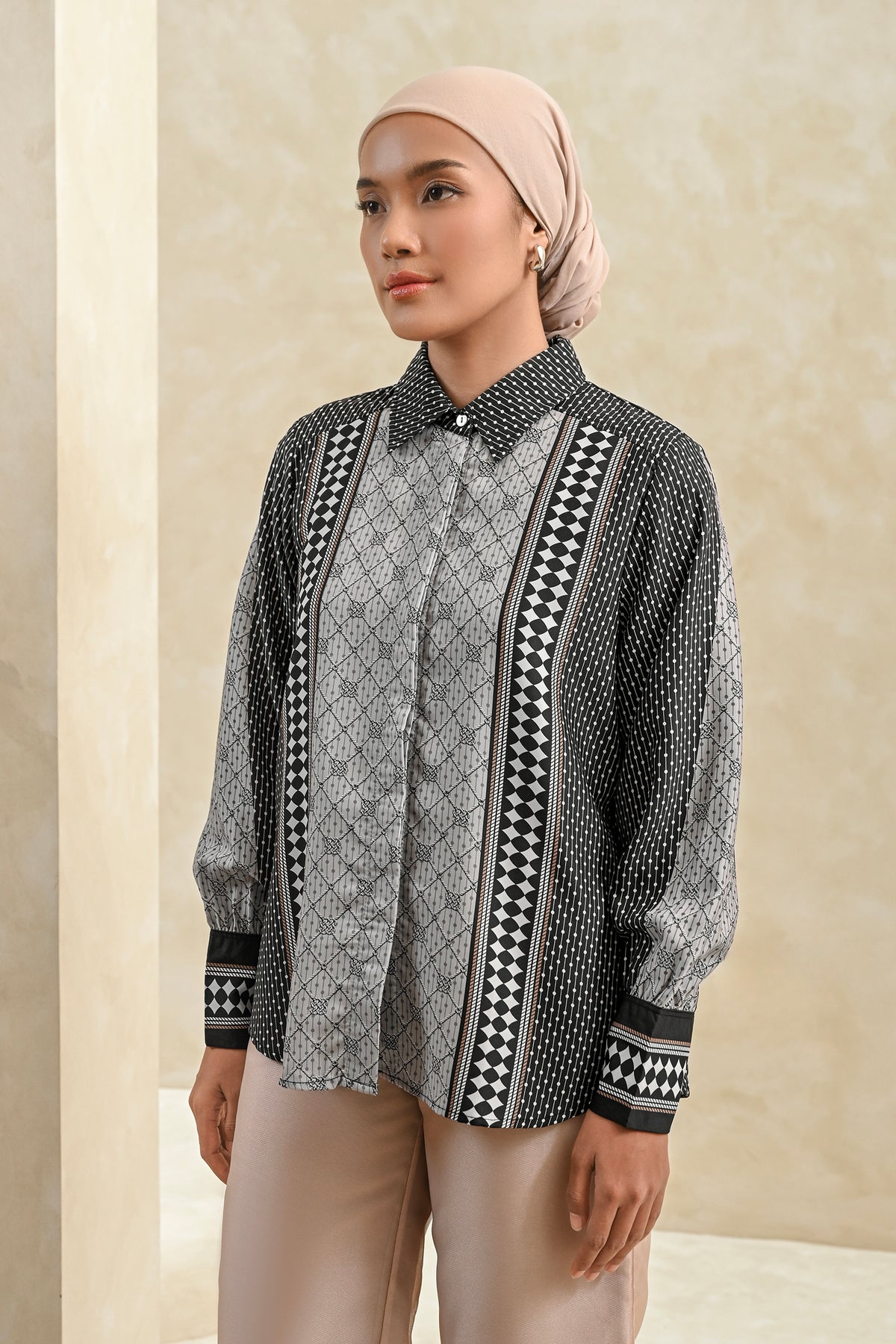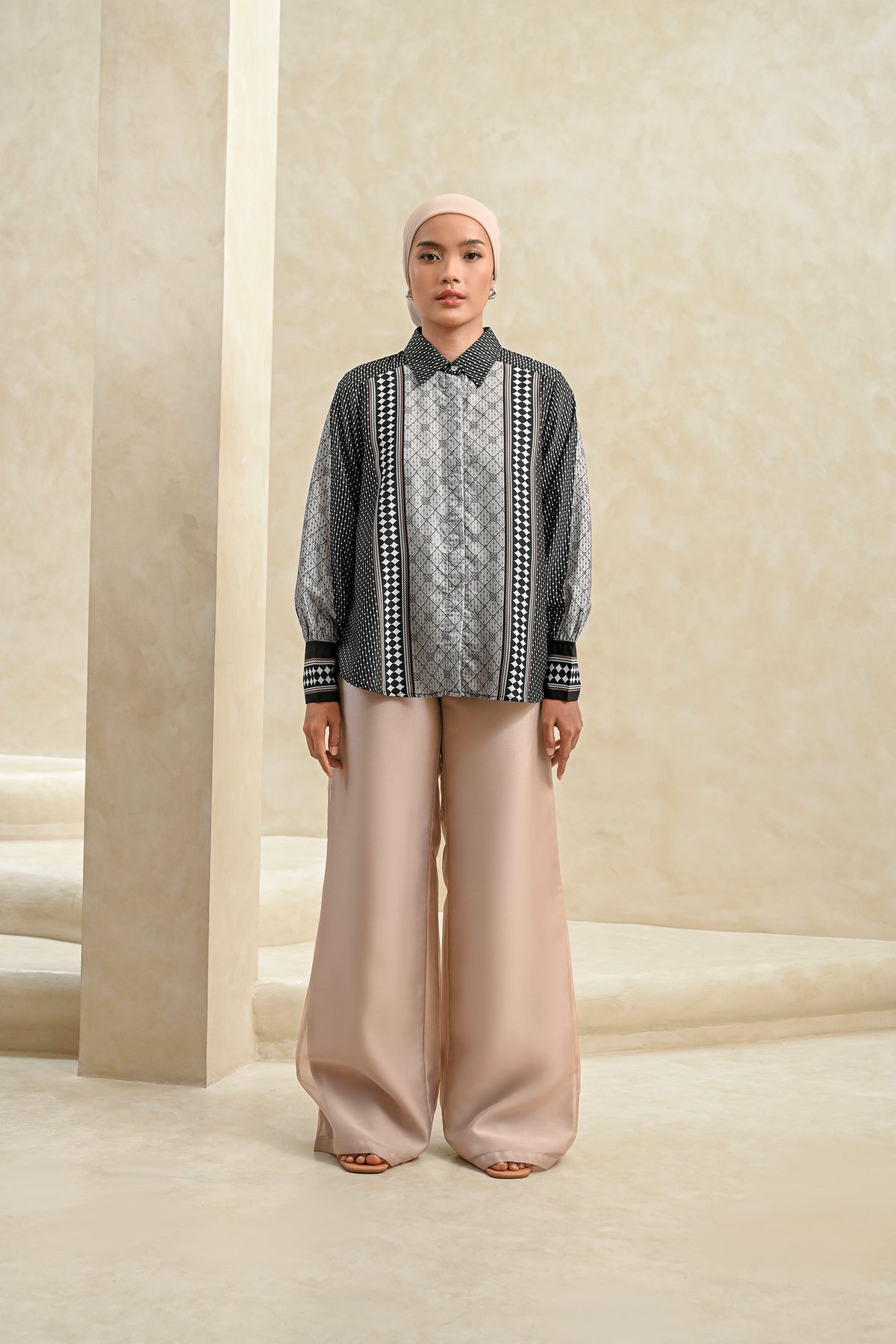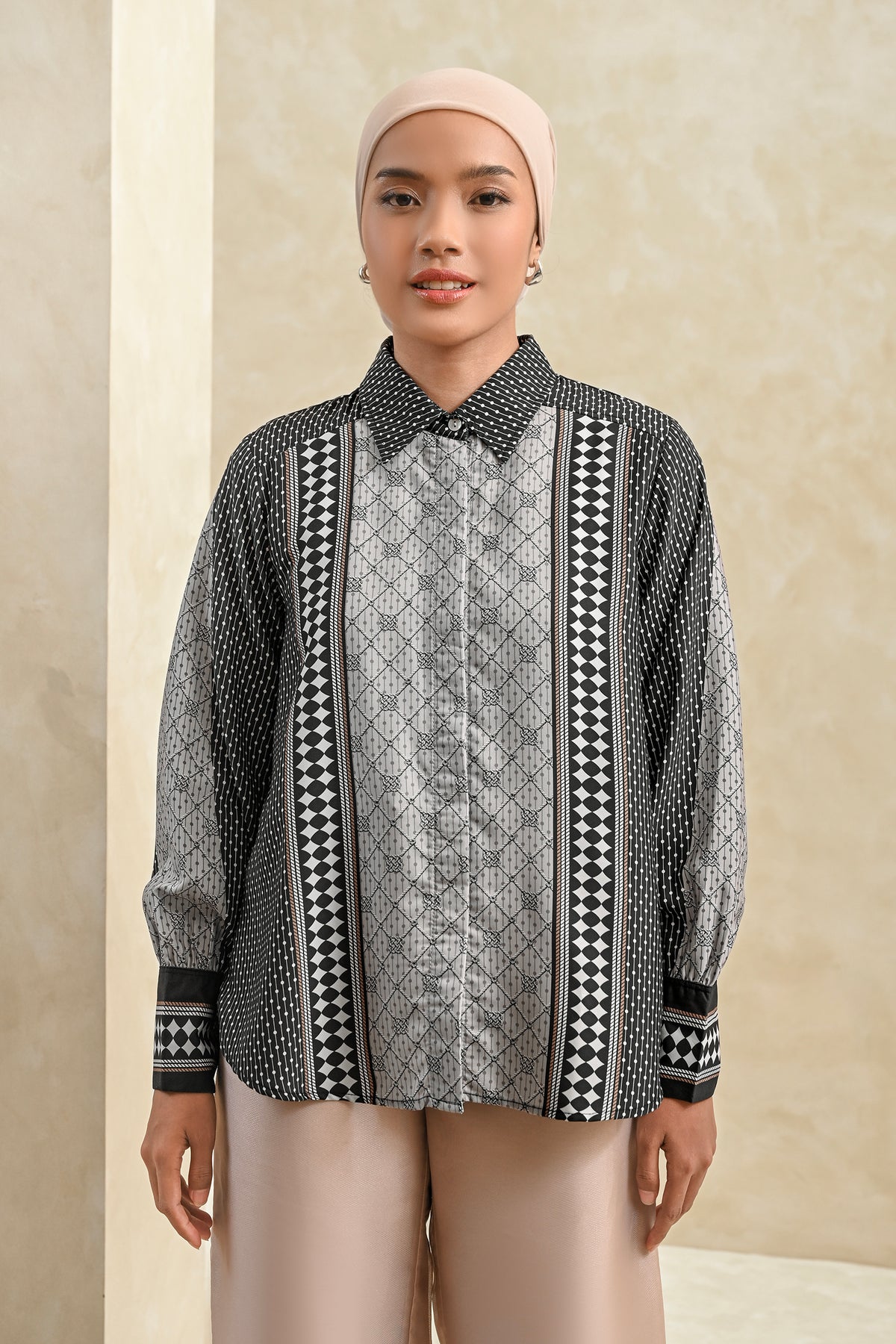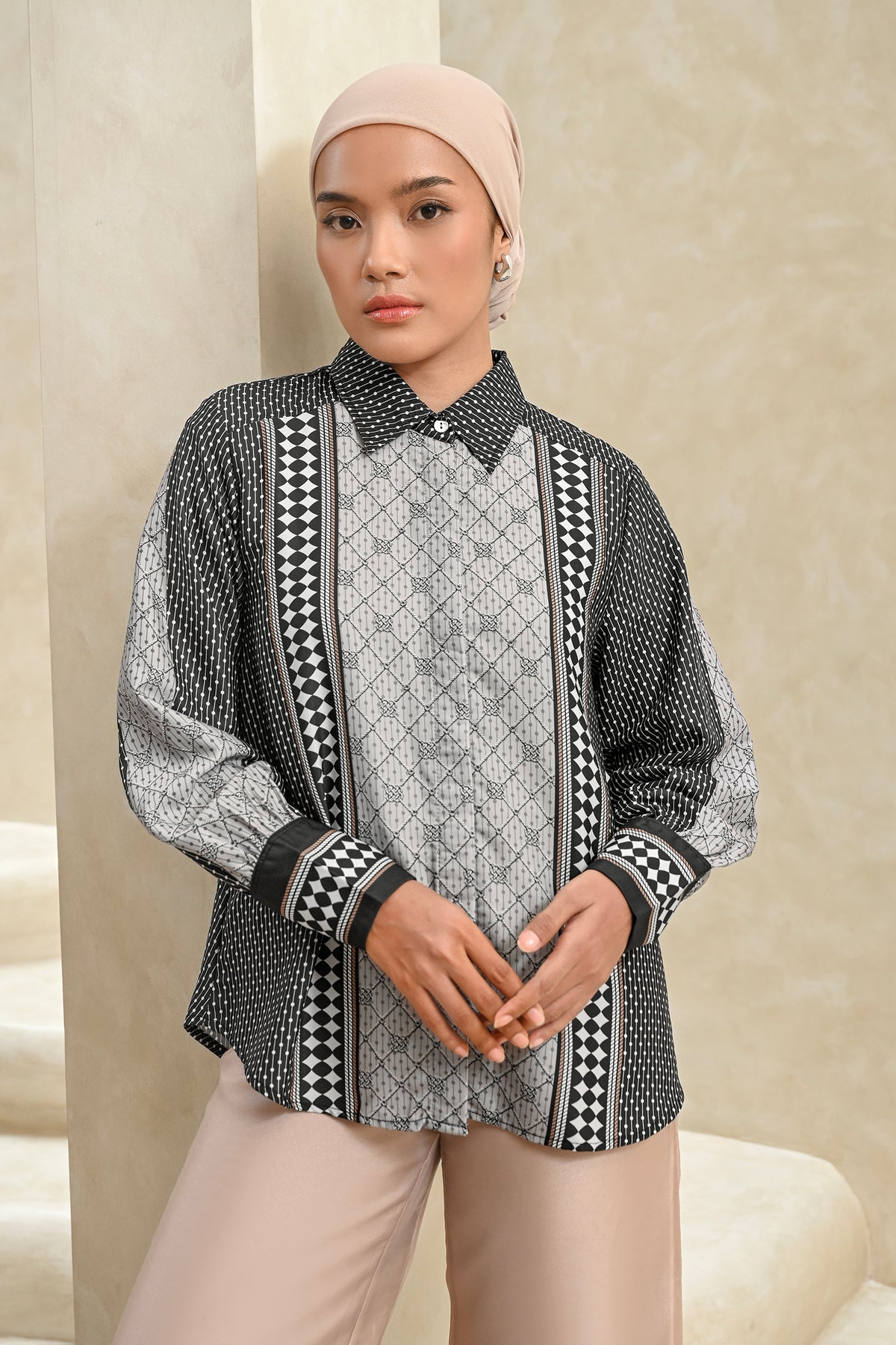 Memberikan kesan statement yang kuat, shirt ini dirancang dengan detail pattern yang tegas dan berkarakter. Perpaduan desain modern dan potongan yang nyaman membuatnya mudah dikenakan seharian, cocok untuk acara special.