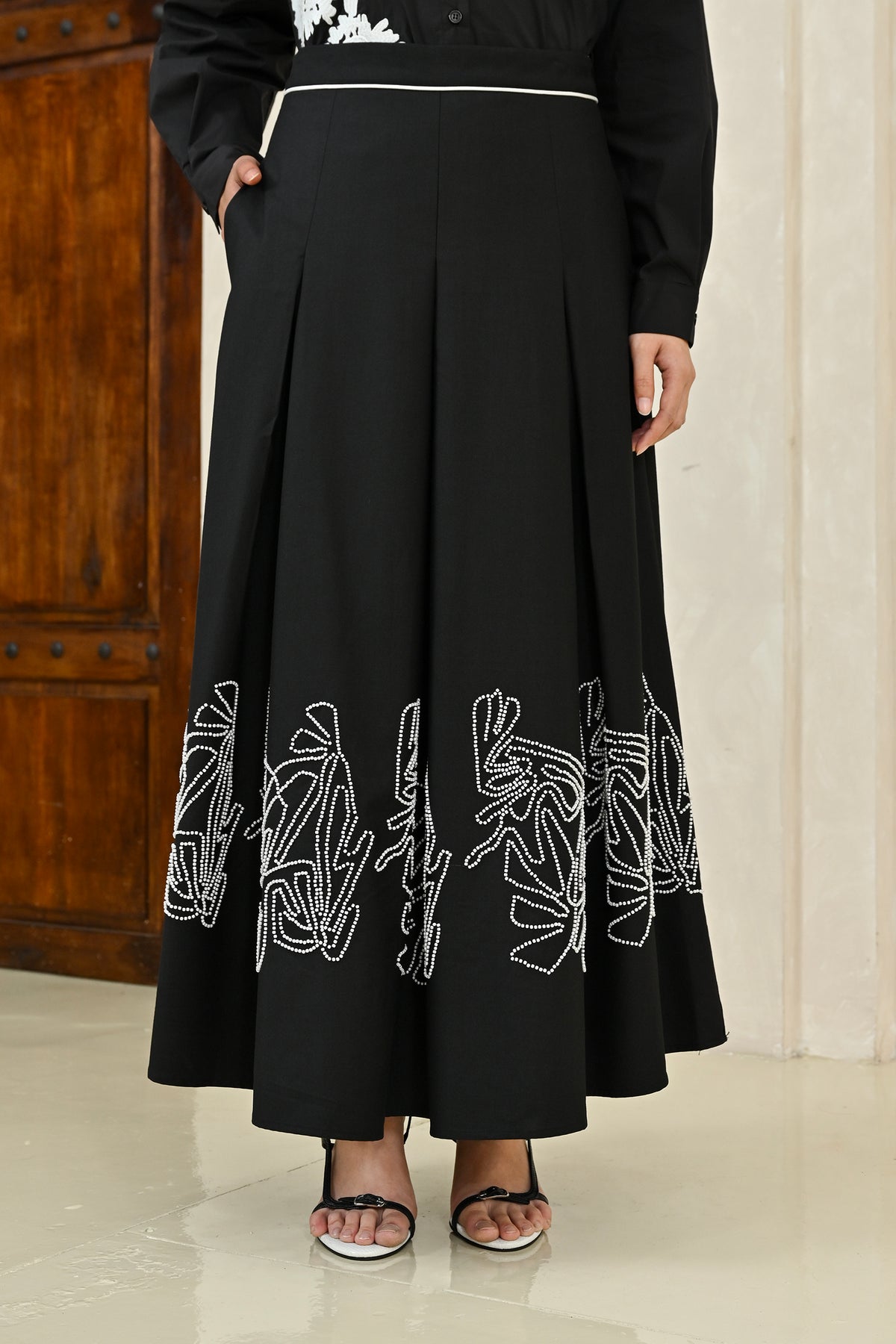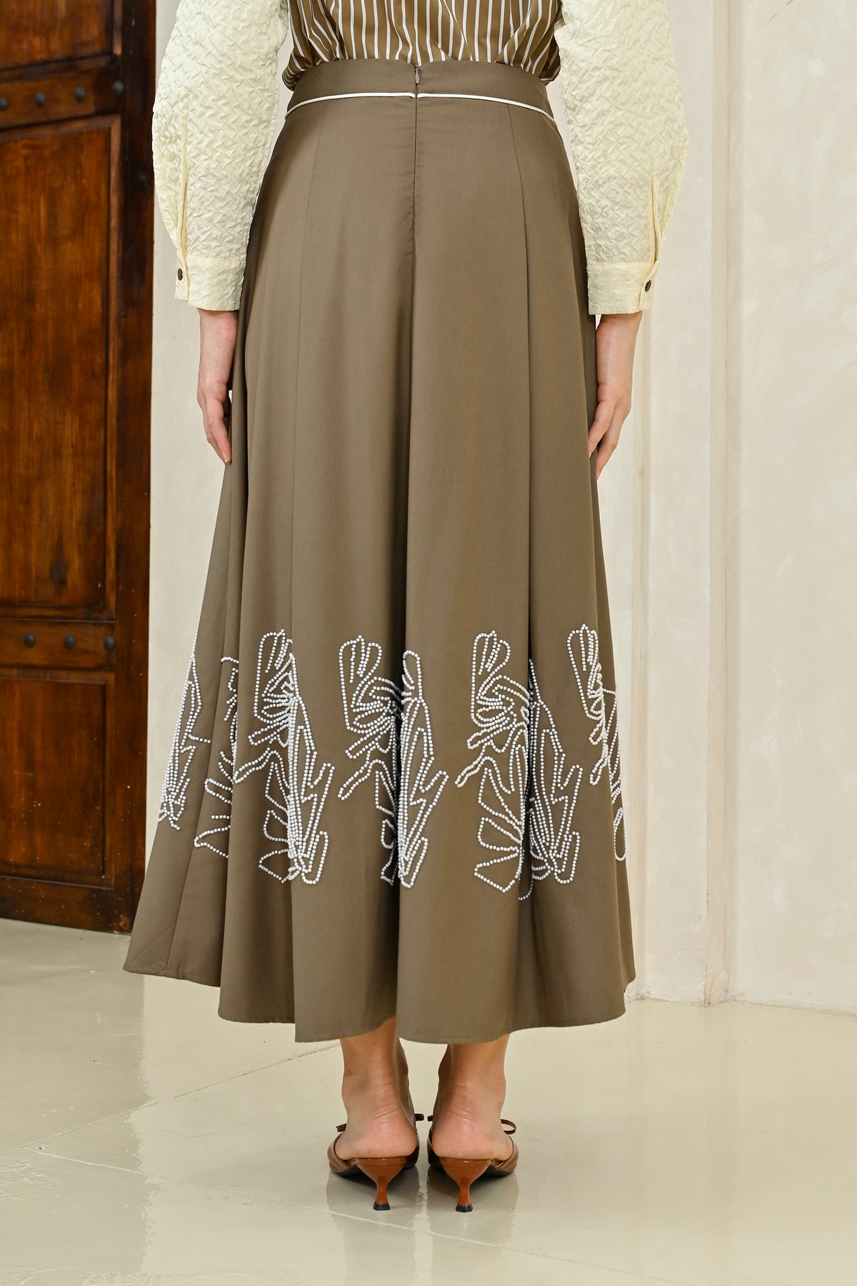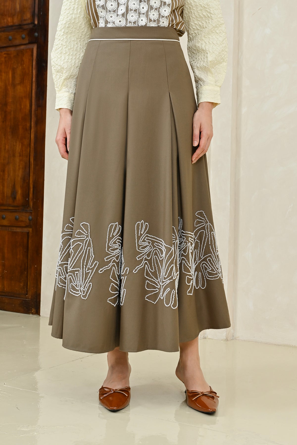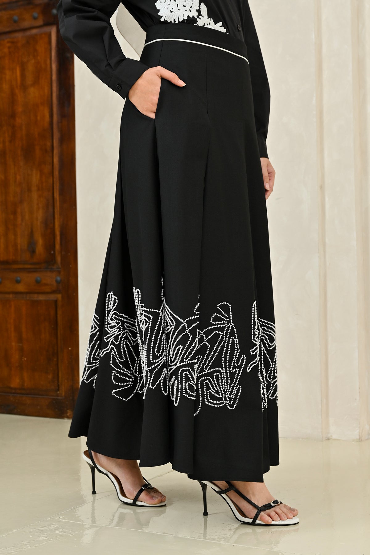 Rok Flare berpotongan anggun dengan siluet flowy yang jatuh rapi mengikuti langkah. Dihiasi detail embroidery halus beraksen manik pada bagian bawah, menghadirkan sentuhan artistik yang subtle namun berkarakter.