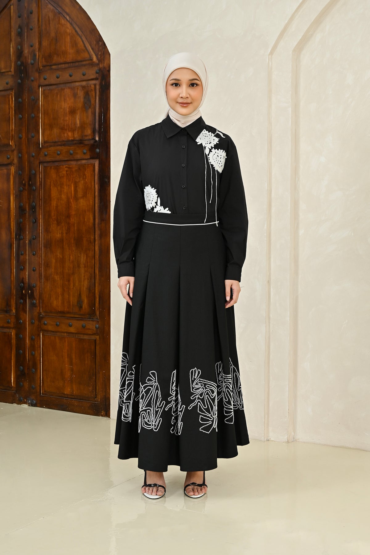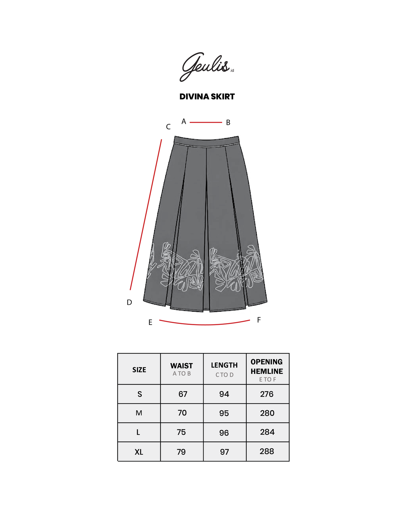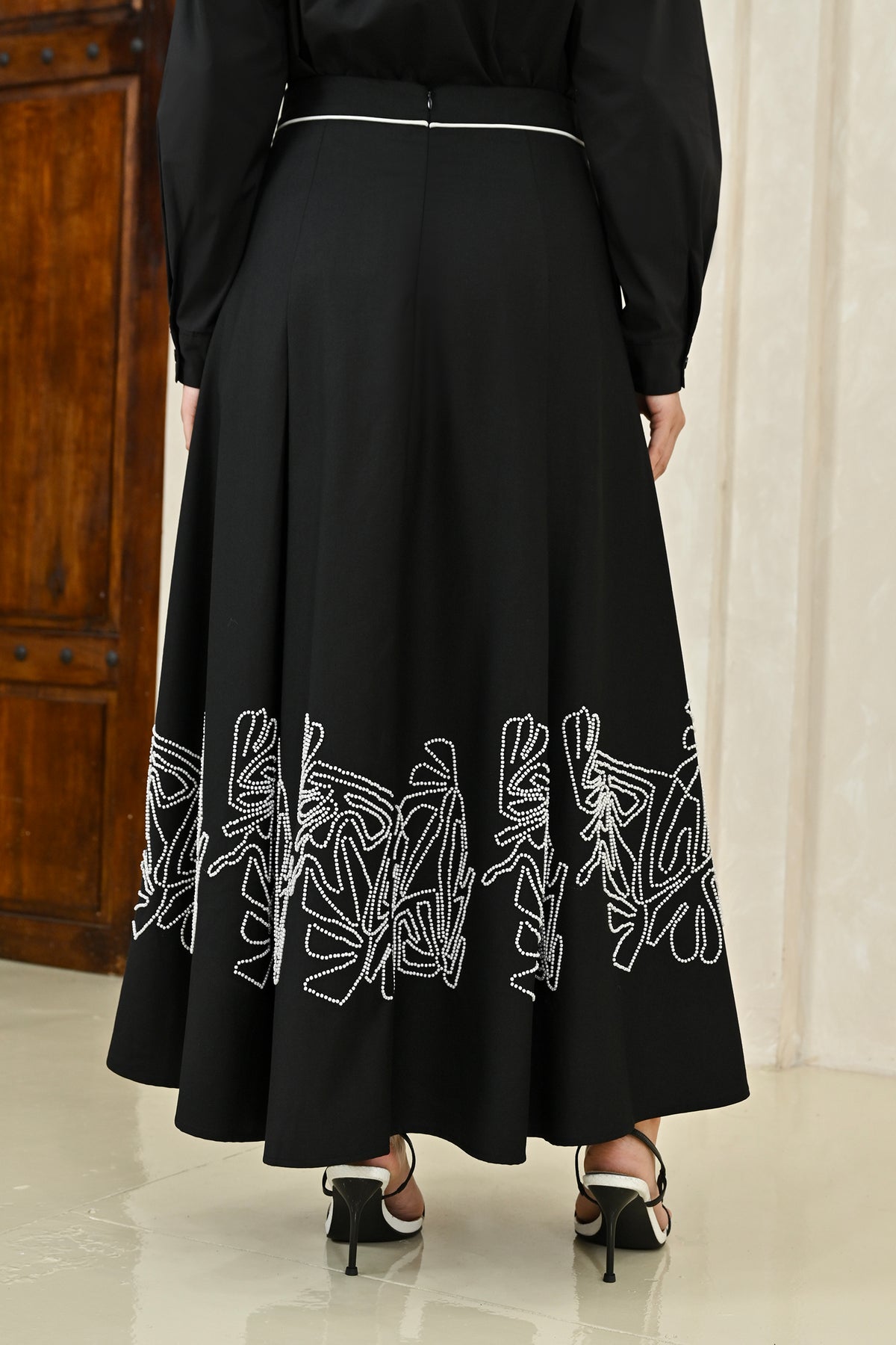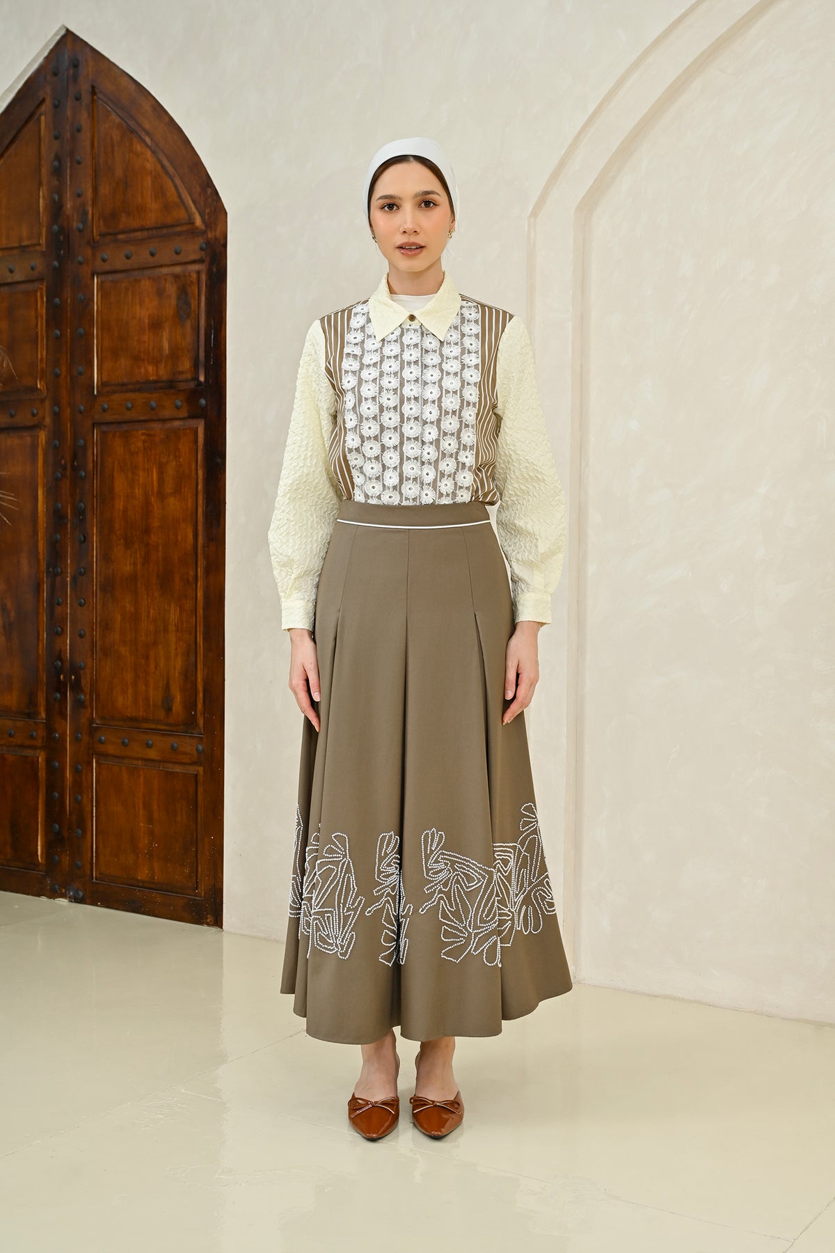 Rok Flare berpotongan anggun dengan siluet flowy yang jatuh rapi mengikuti langkah. Dihiasi detail embroidery halus beraksen manik pada bagian bawah, menghadirkan sentuhan artistik yang subtle namun berkarakter.