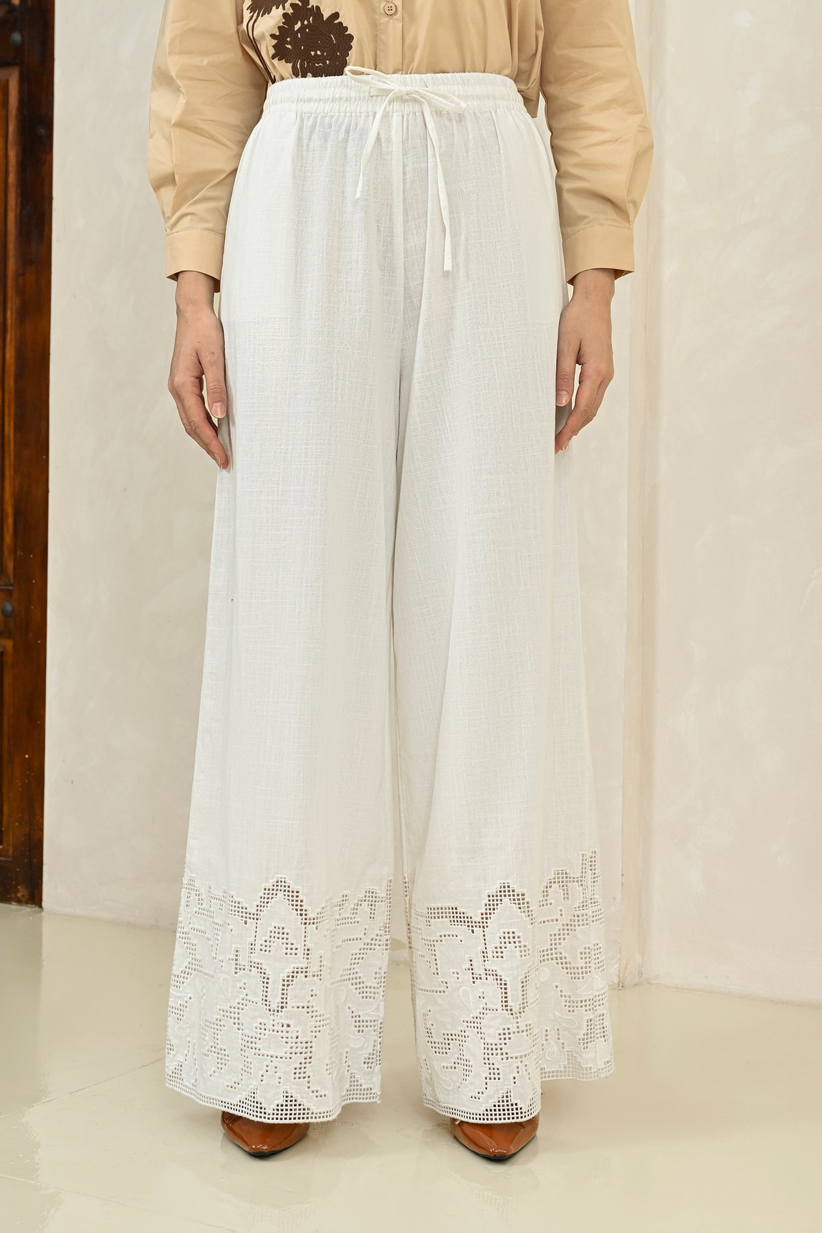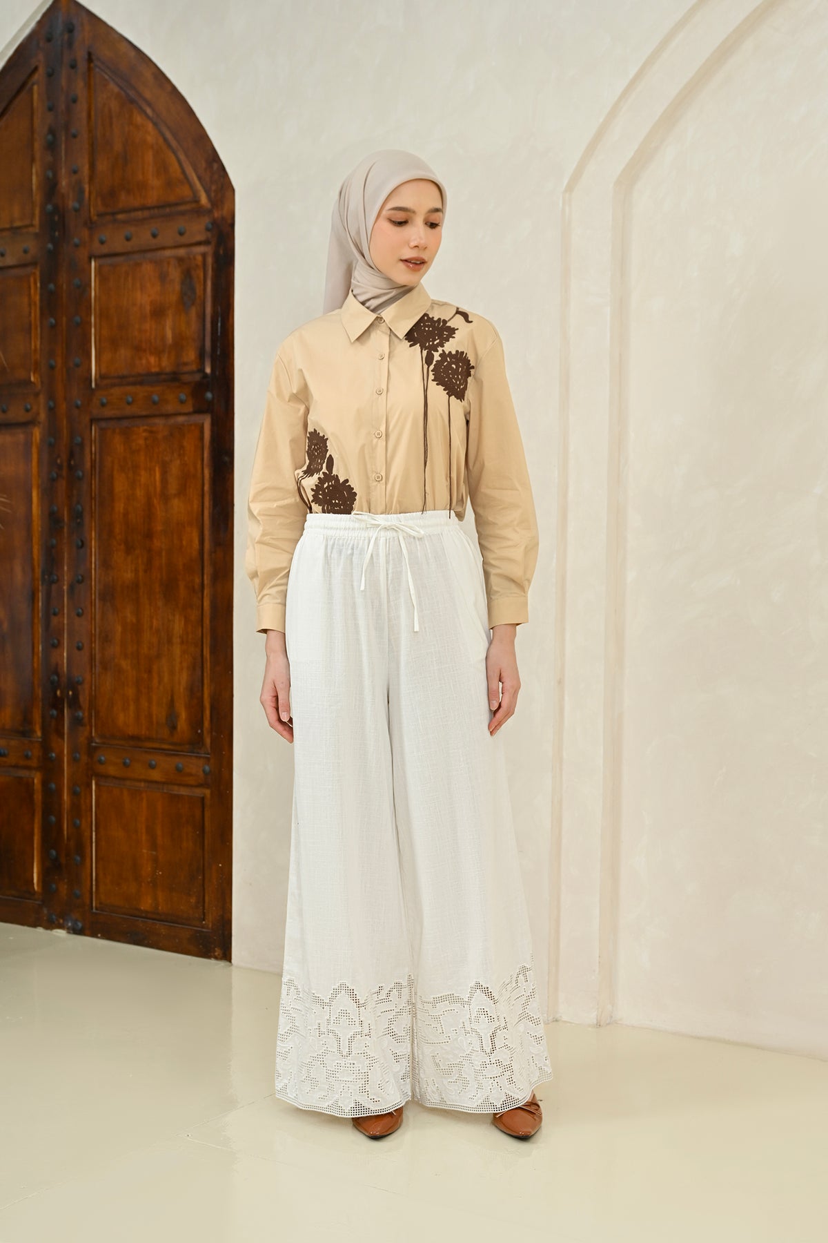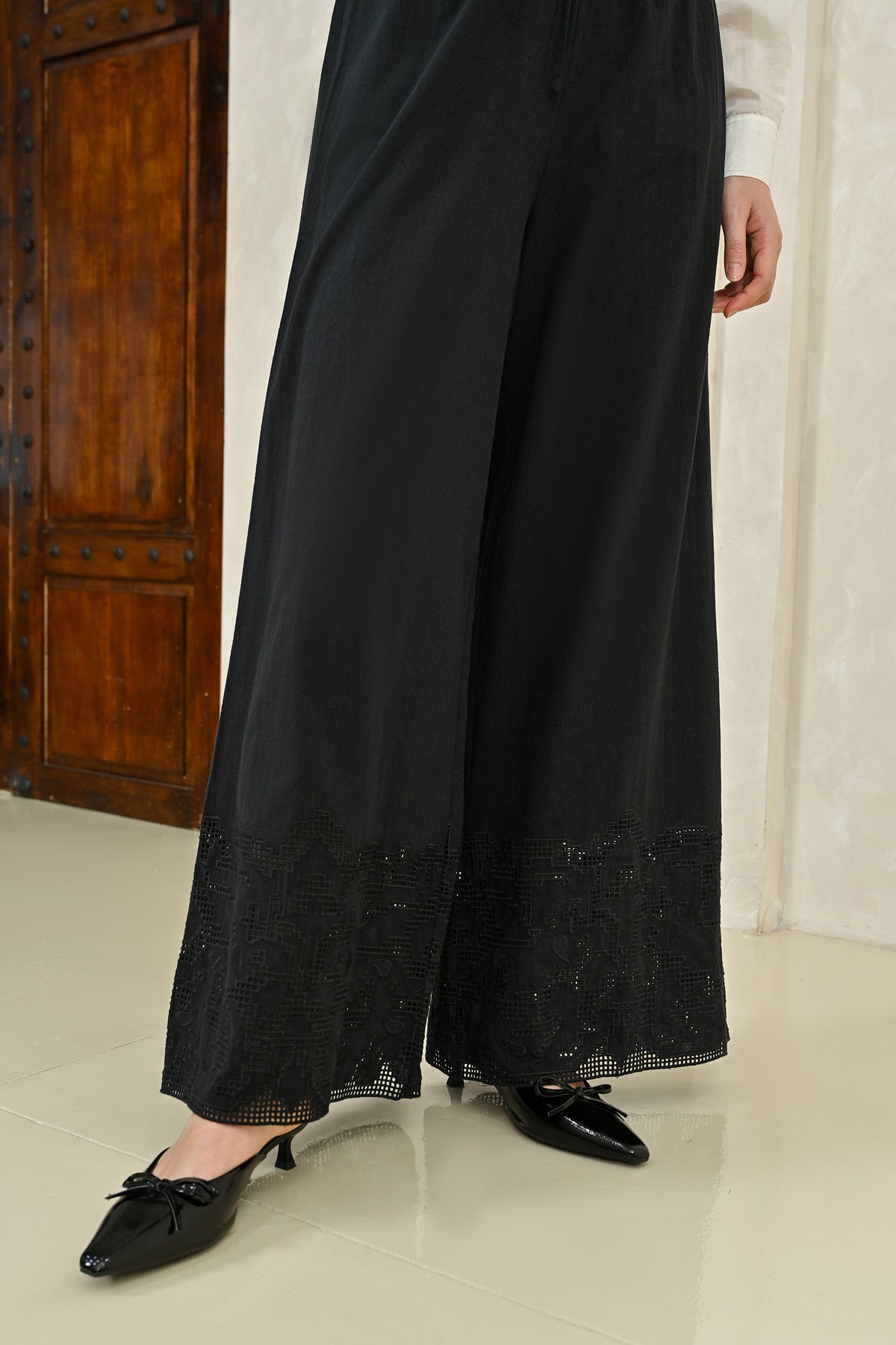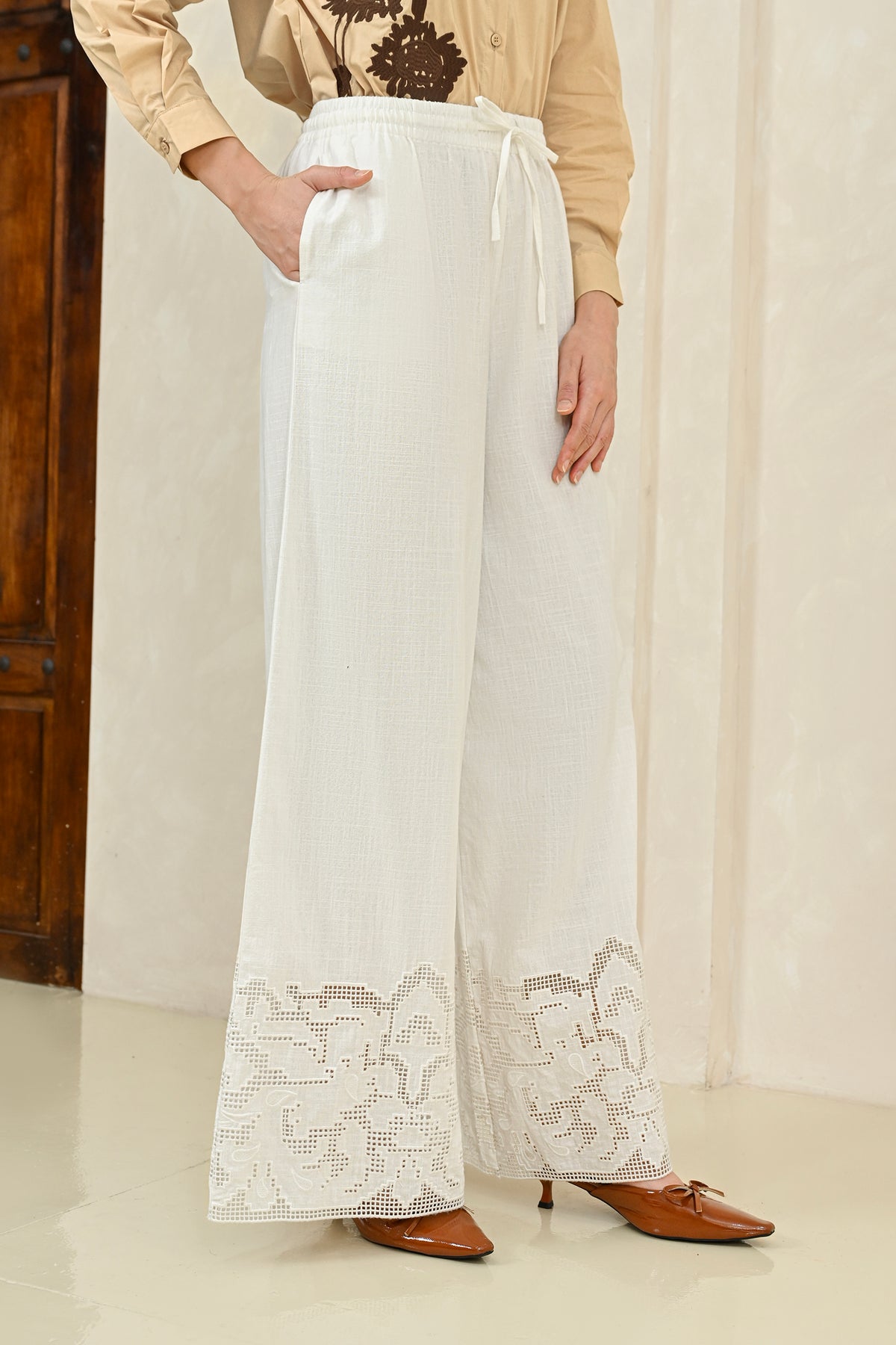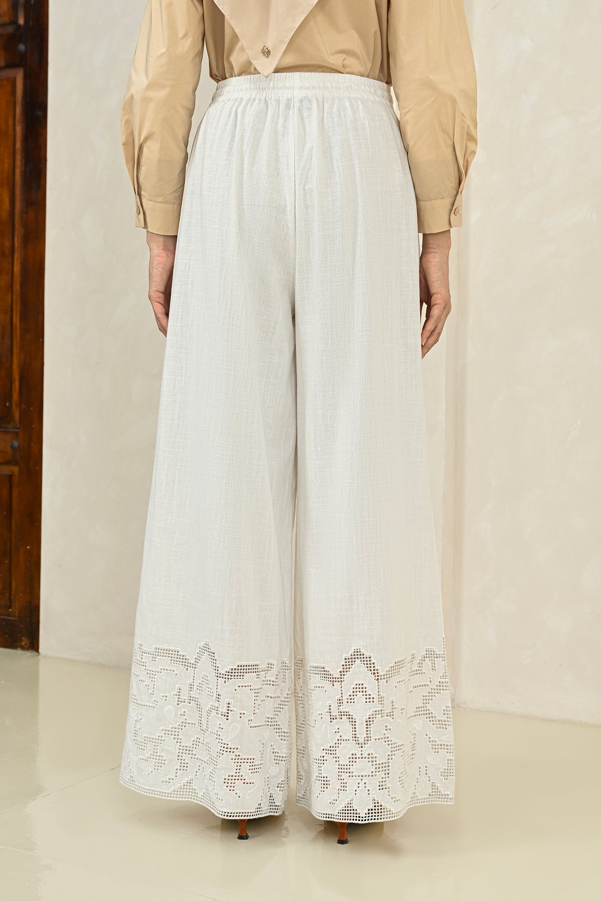 Mobu Pants dirancang dari finest linen dengan tekstur ringan dan breathable, menghadirkan siluet lurus yang jatuh lembut. Detail cutwork embroidery halus pada bagian bawah memberikan sentuhan artisanal yang understated.