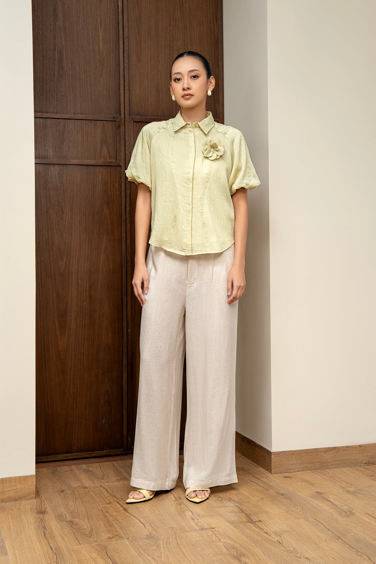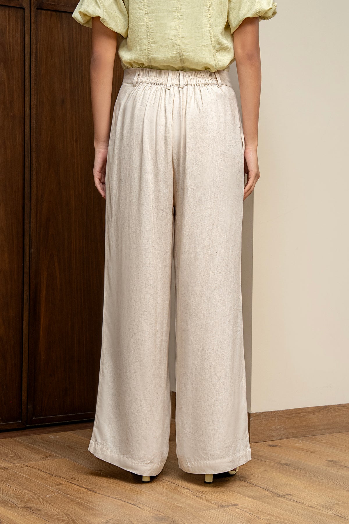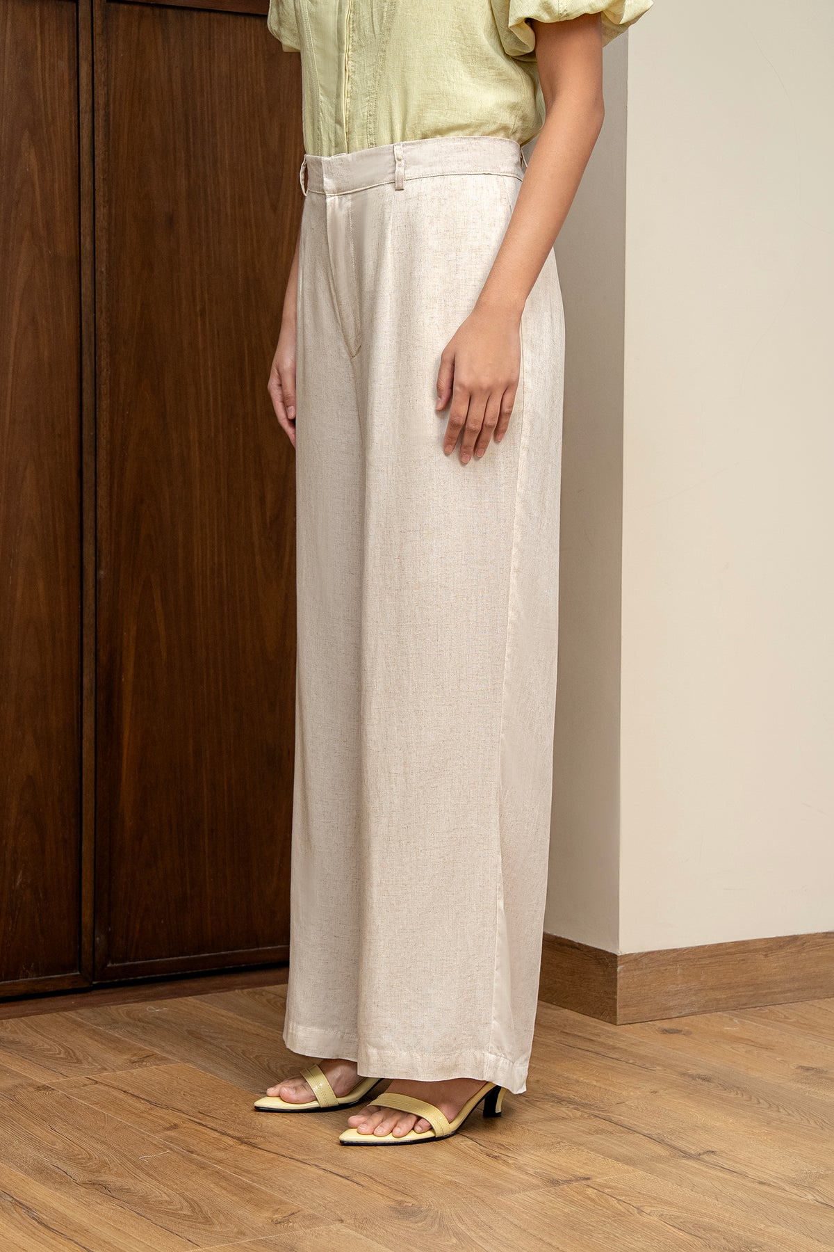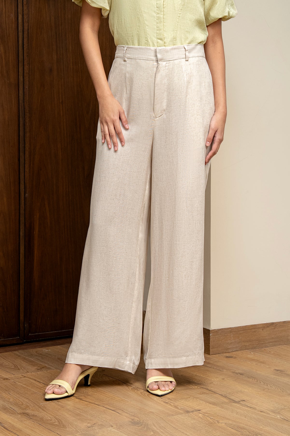 Potongan wide-leg clean cut memberi kesan modern dan memanjangkan proporsi tubuh, sempurna untuk tampilan chic dengan sentuhan natural luxury.