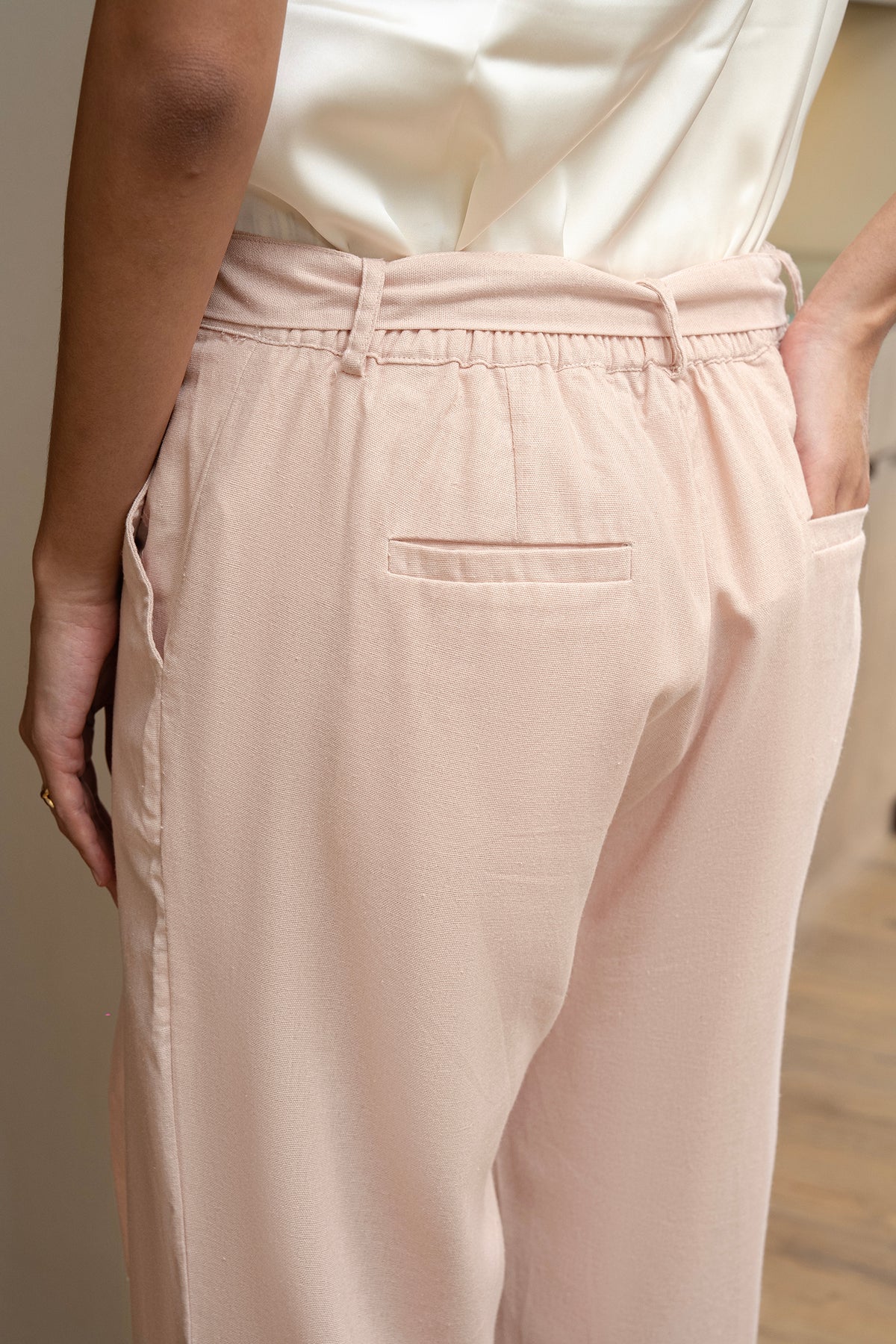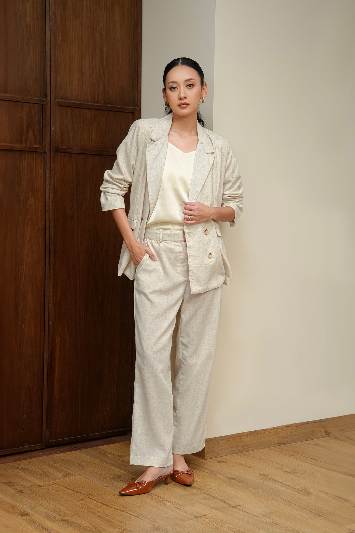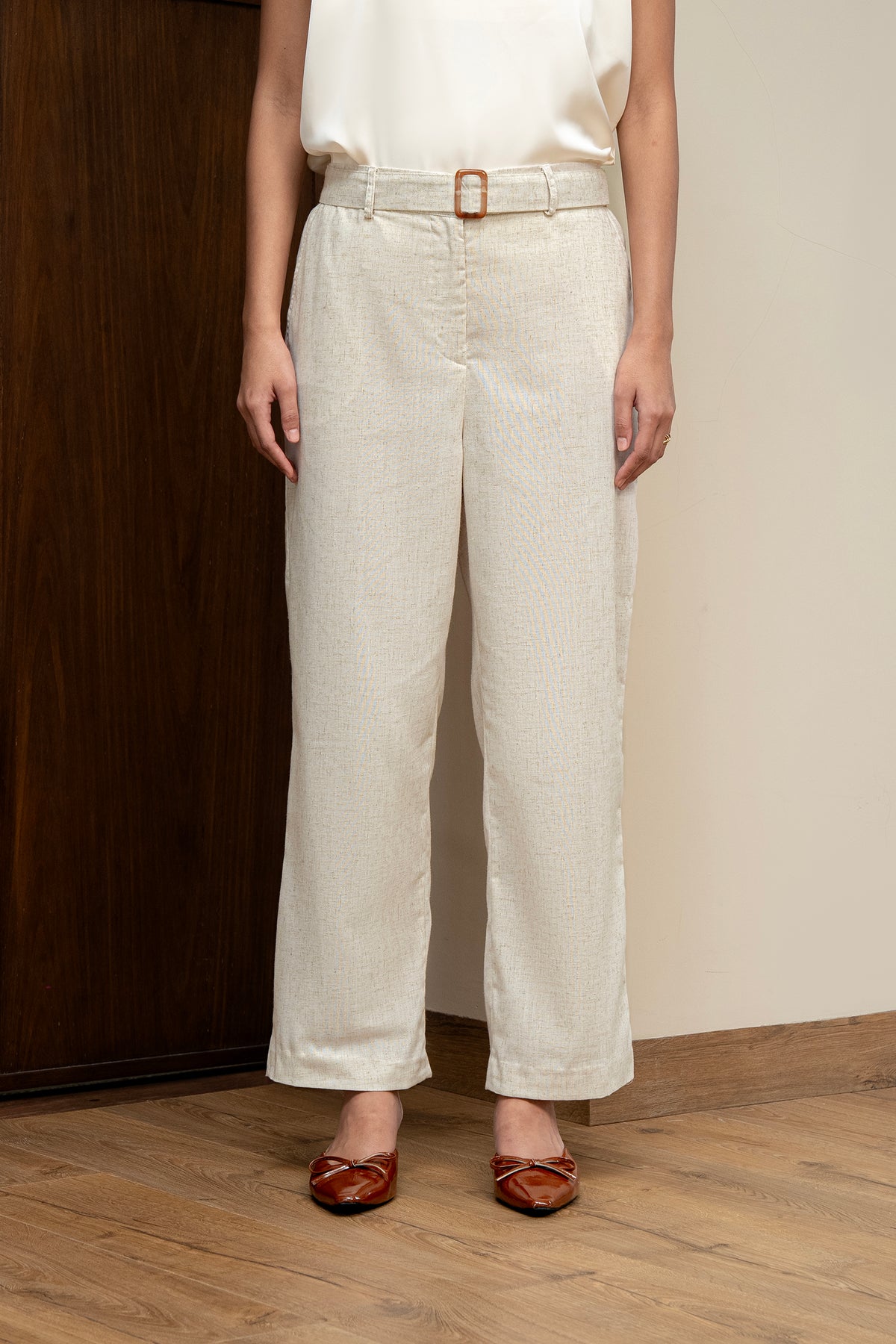 Celana berbahan linen blend dengan siluet tapered yang memberi kesan tegas dan modern. Dilengkapi belt senada yang bisa dilepas, serta potongan yang mengikuti bentuk kaki secara halus untuk tampilan lebih proporsional dan elegan. Pilihan tepat untuk gaya profesional yang tetap effortless.