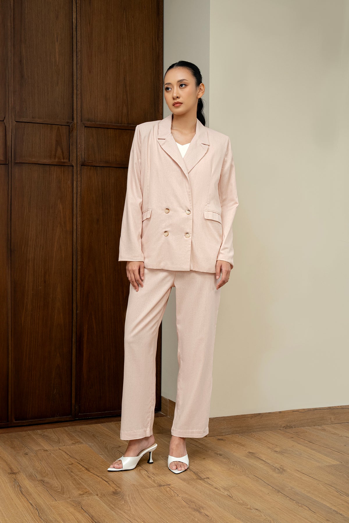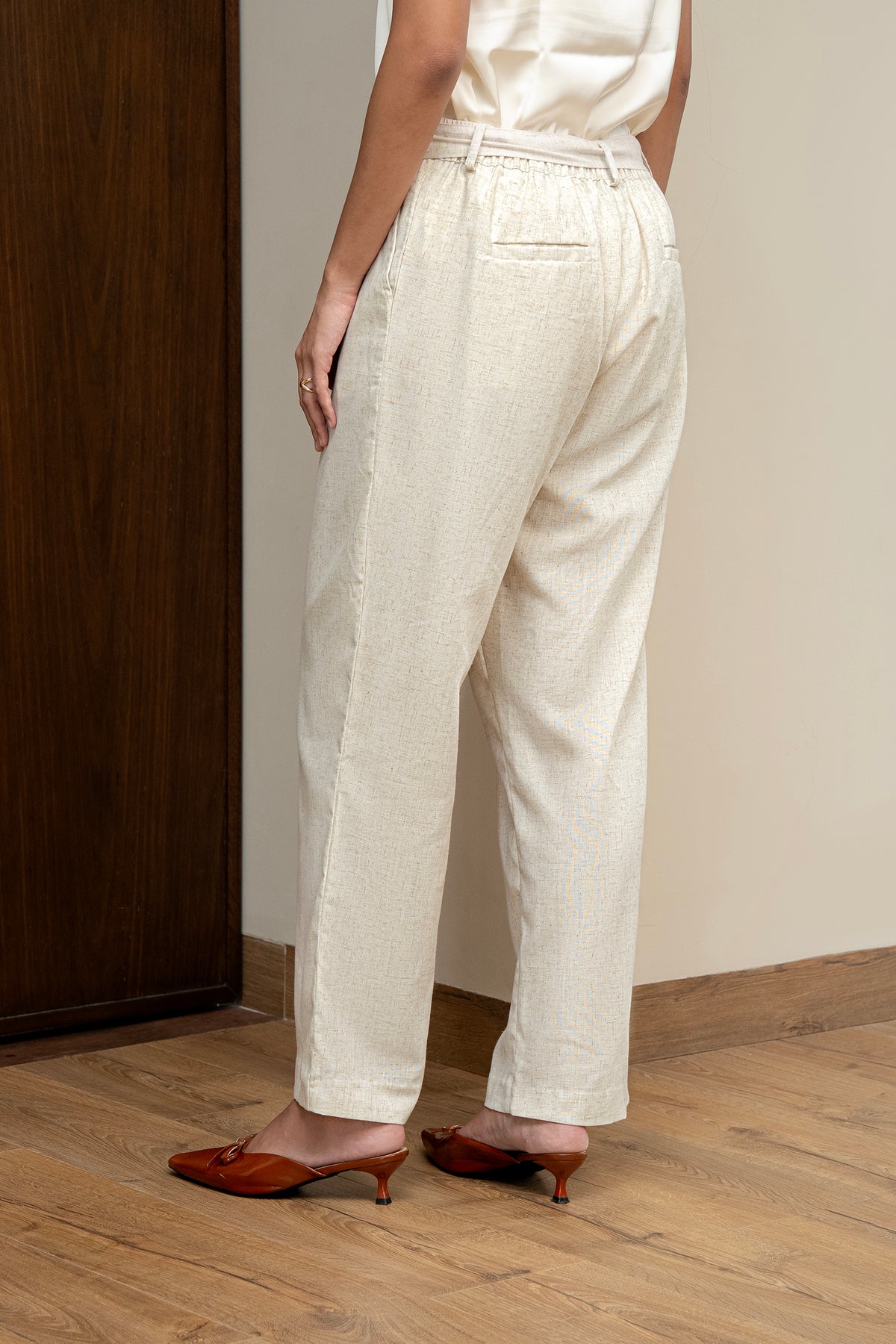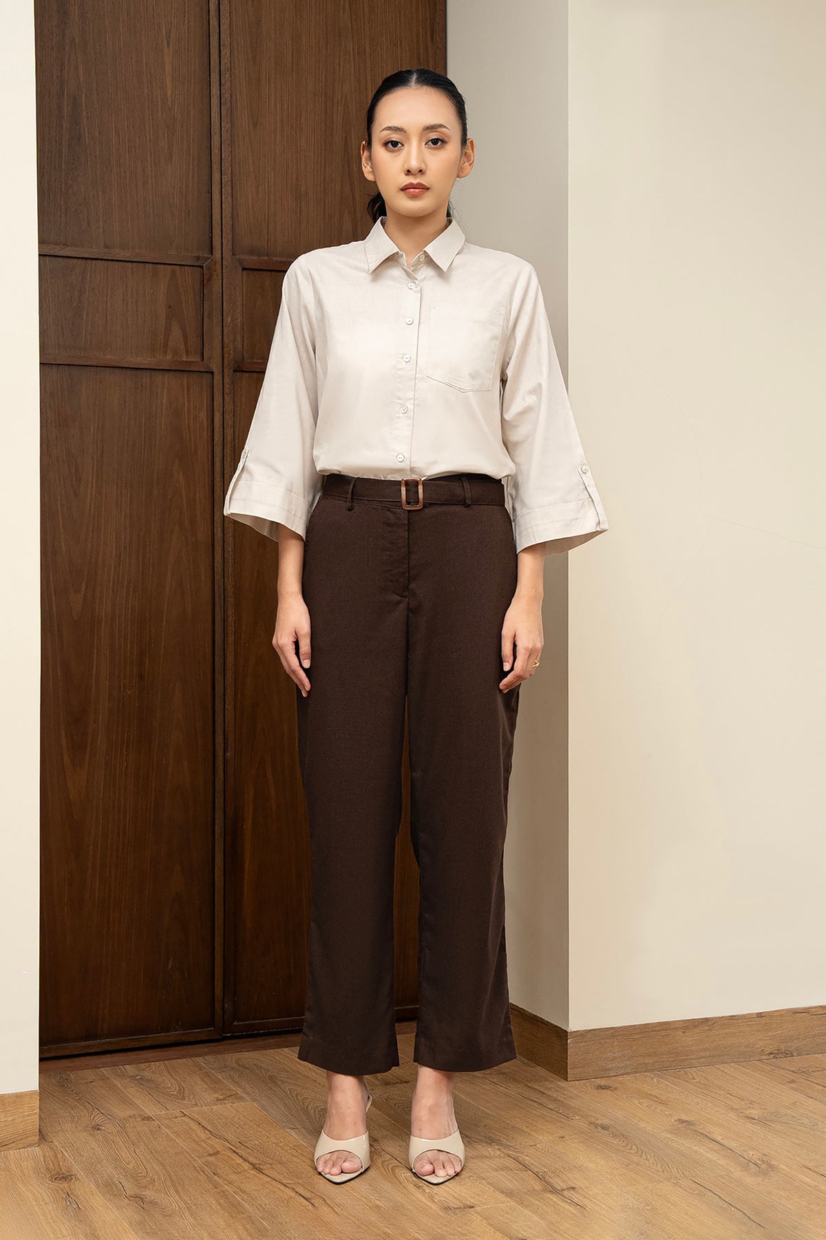 Celana berbahan linen blend dengan siluet tapered yang memberi kesan tegas dan modern. Dilengkapi belt senada yang bisa dilepas, serta potongan yang mengikuti bentuk kaki secara halus untuk tampilan lebih proporsional dan elegan. Pilihan tepat untuk gaya profesional yang tetap effortless.