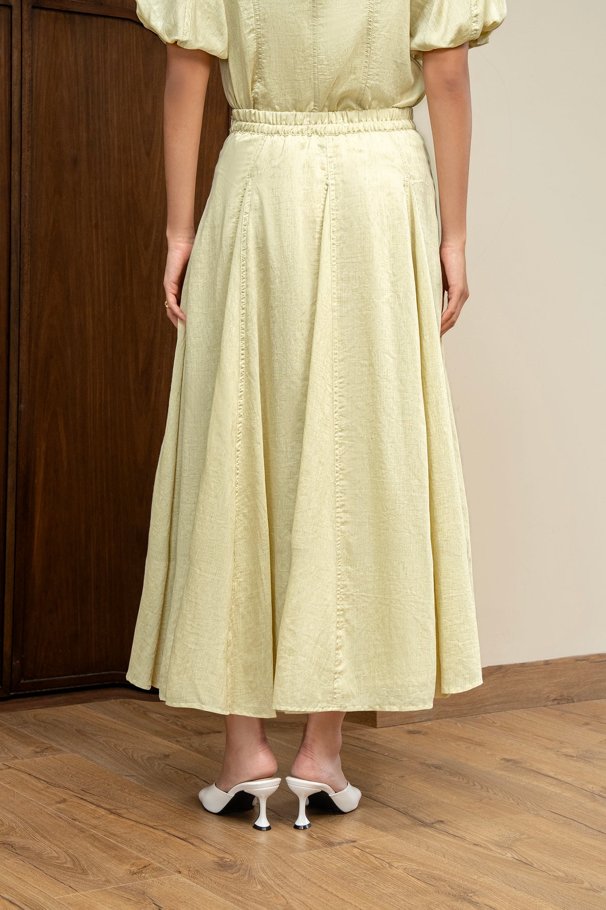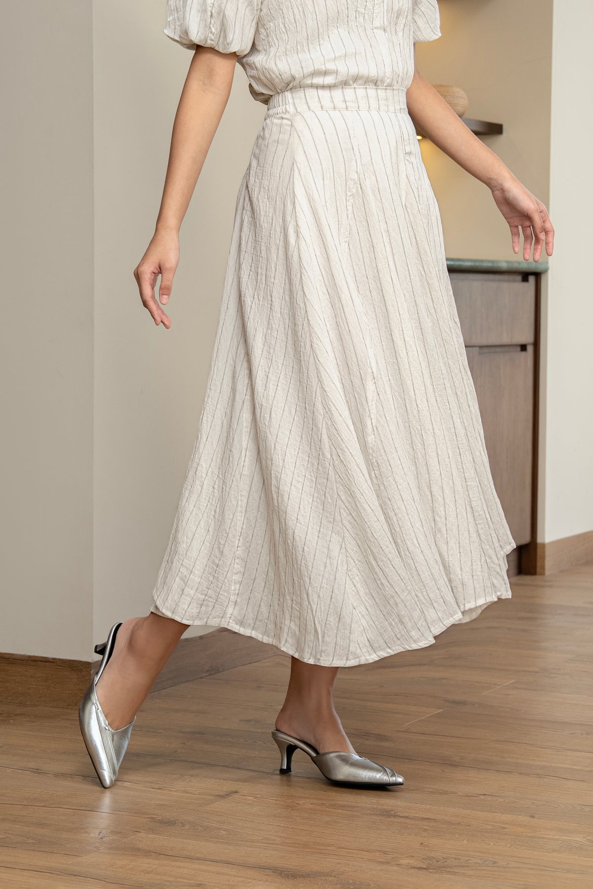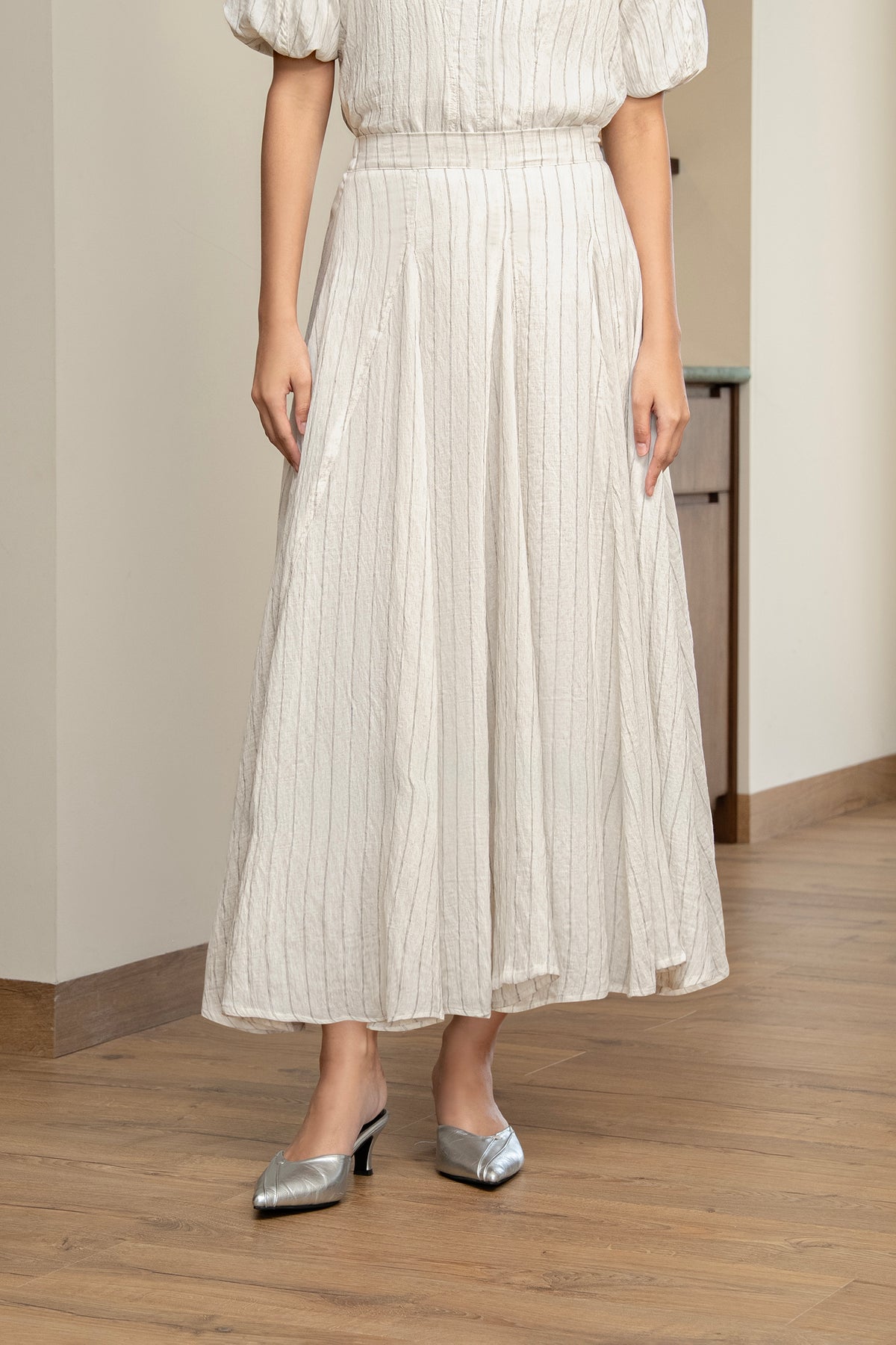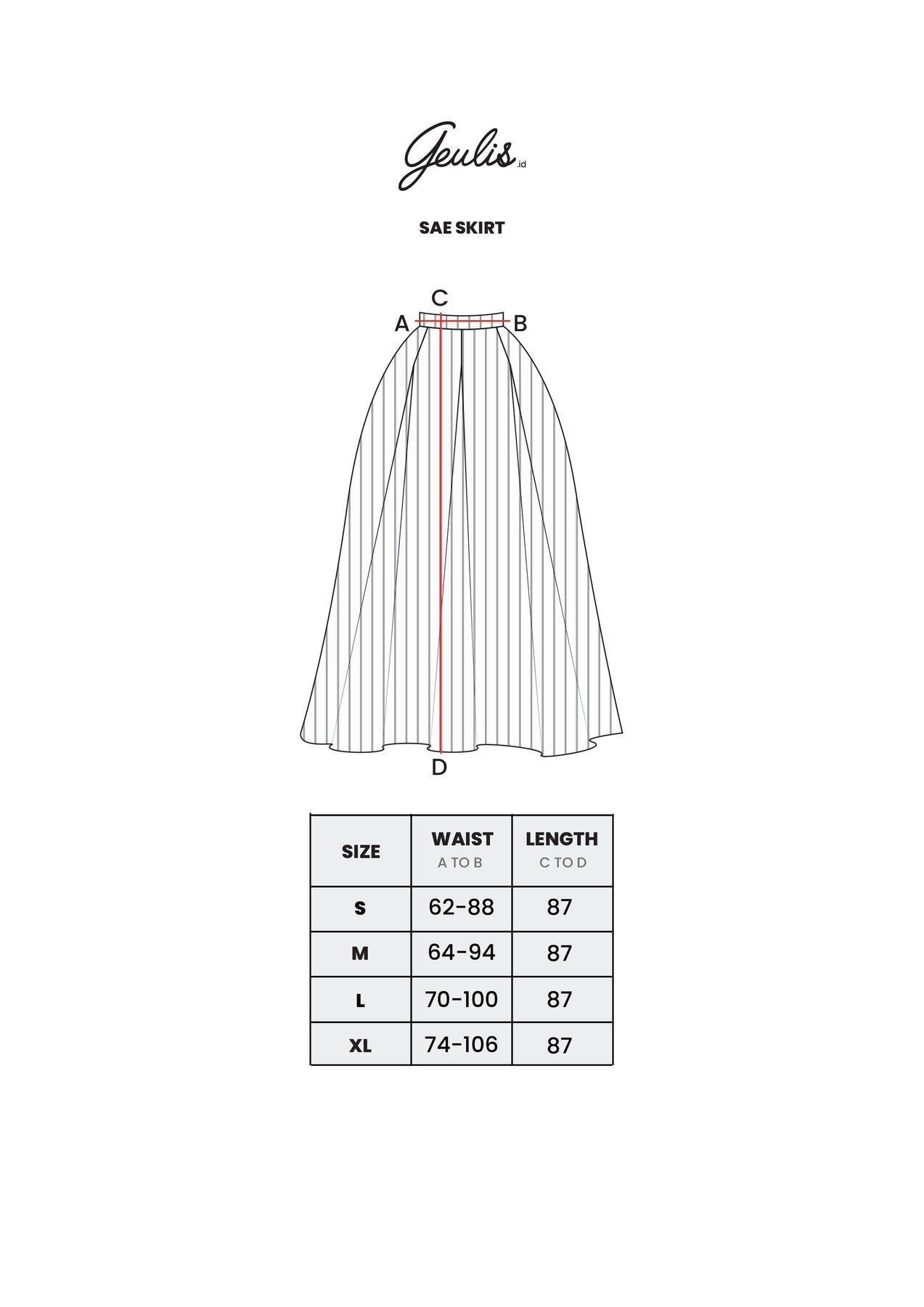 Potongan A-line flowy dengan tekstur lembut menghadirkan siluet elegan yang bergerak anggun di setiap langkah.