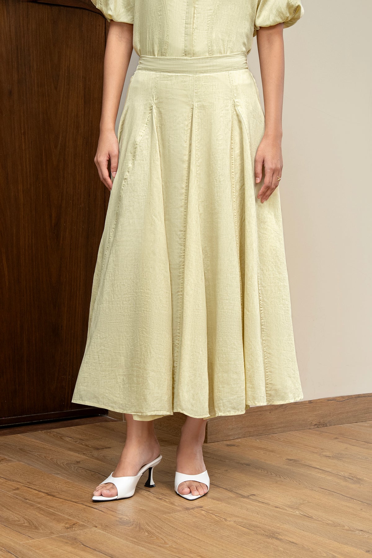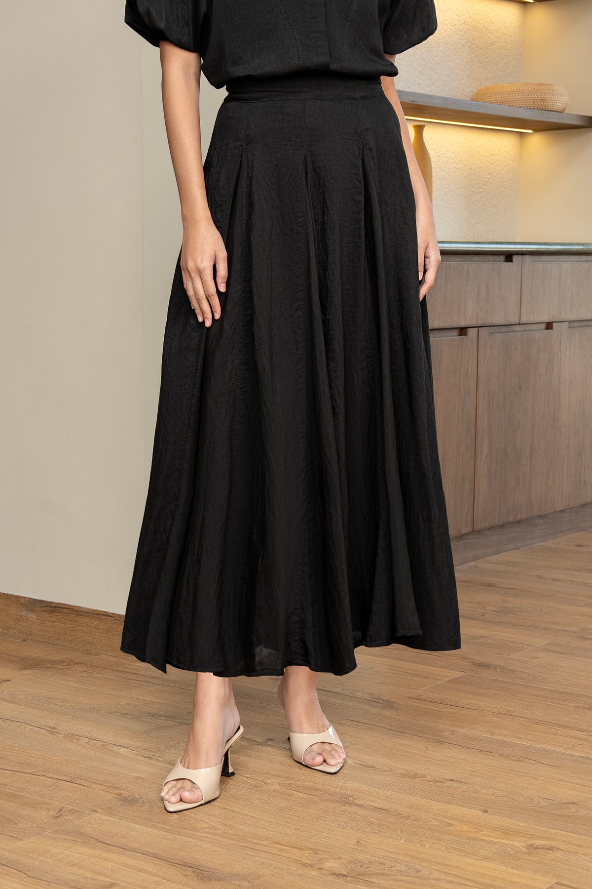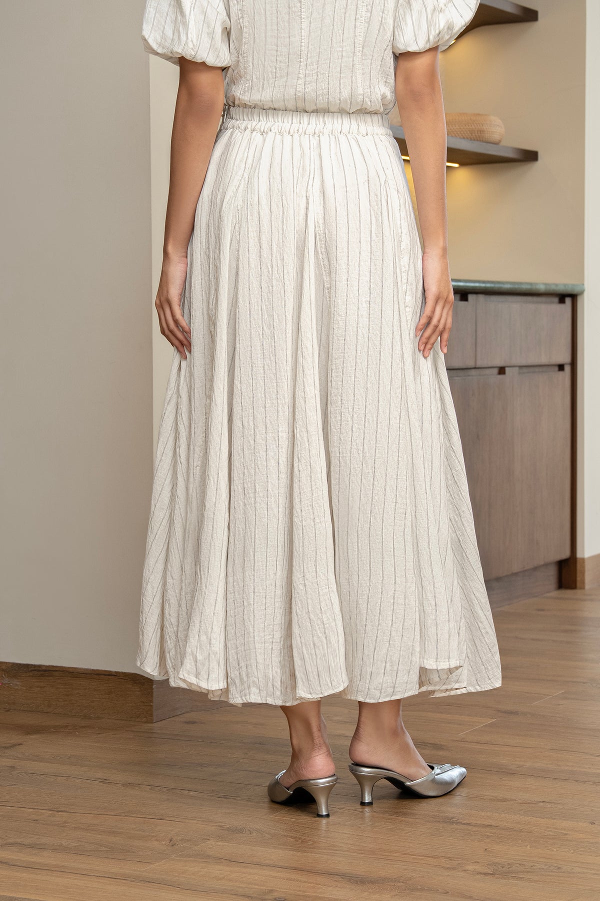 Potongan A-line flowy dengan tekstur lembut menghadirkan siluet elegan yang bergerak anggun di setiap langkah.