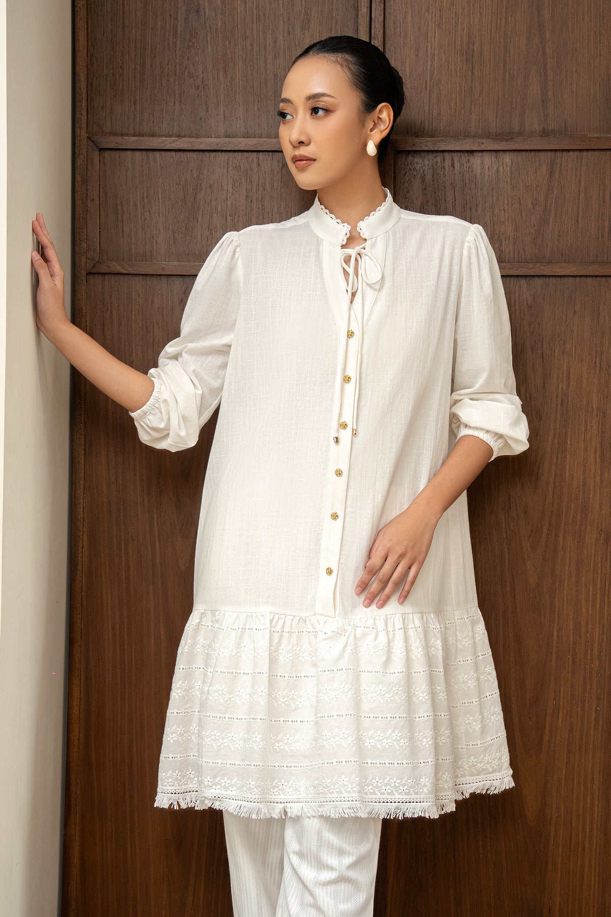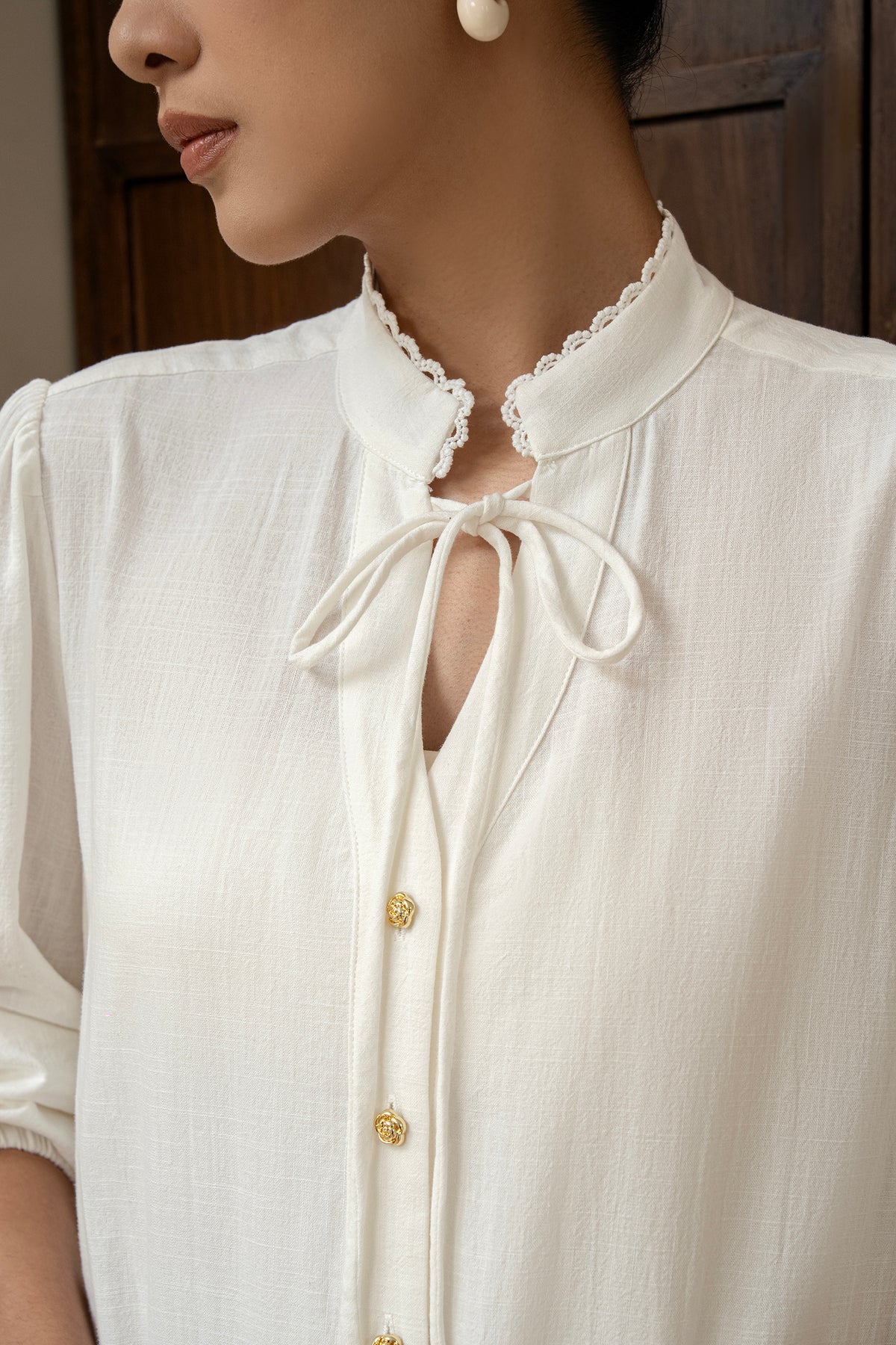 Refined yet effortless — Taleeya Dress terbuat dari premium linen dengan detail frill collar dan embroidered hem.