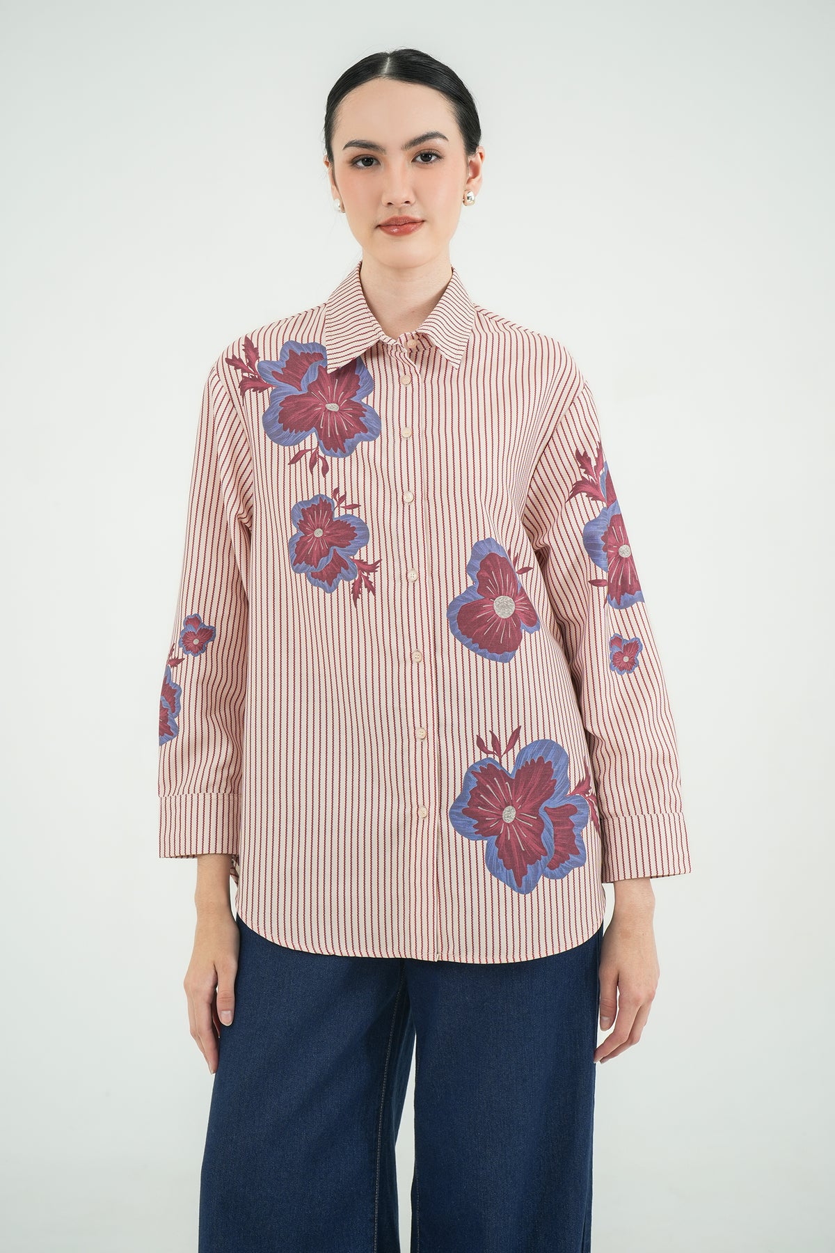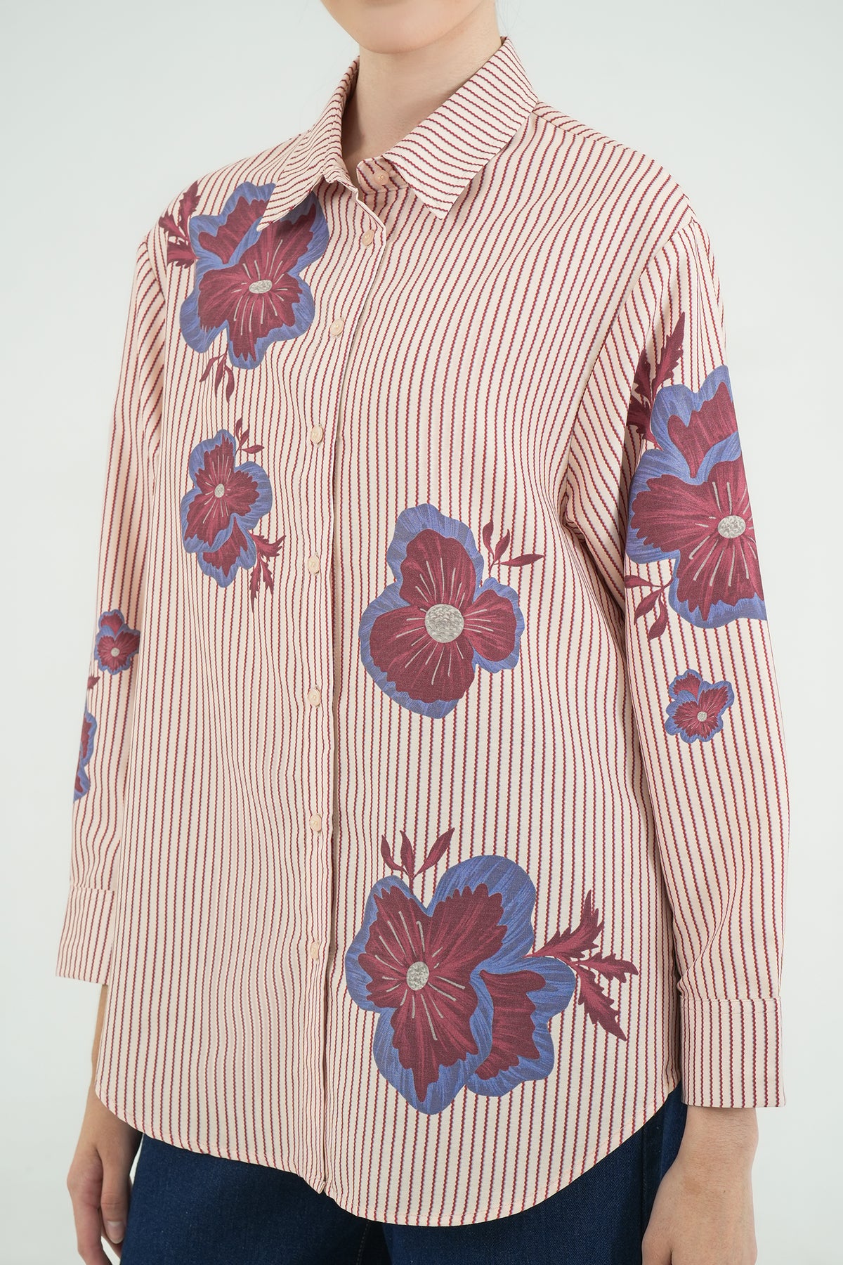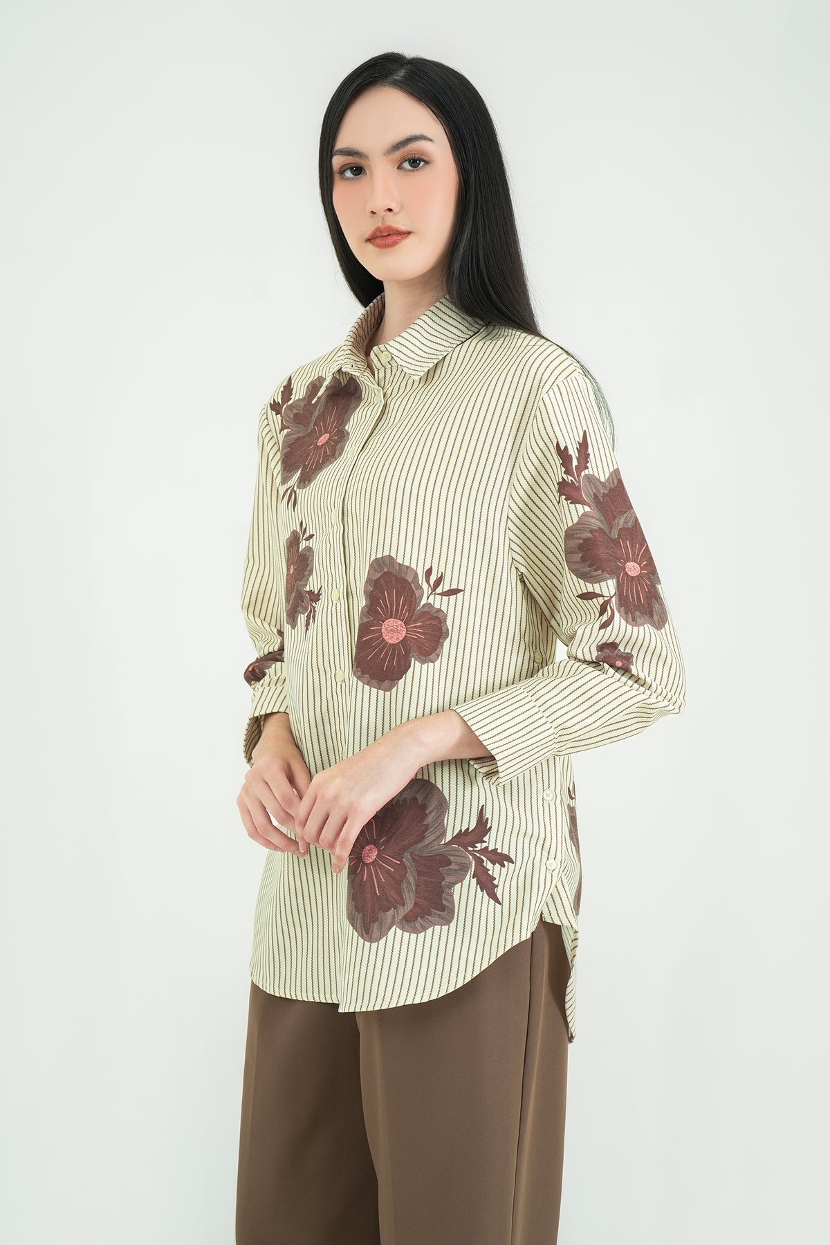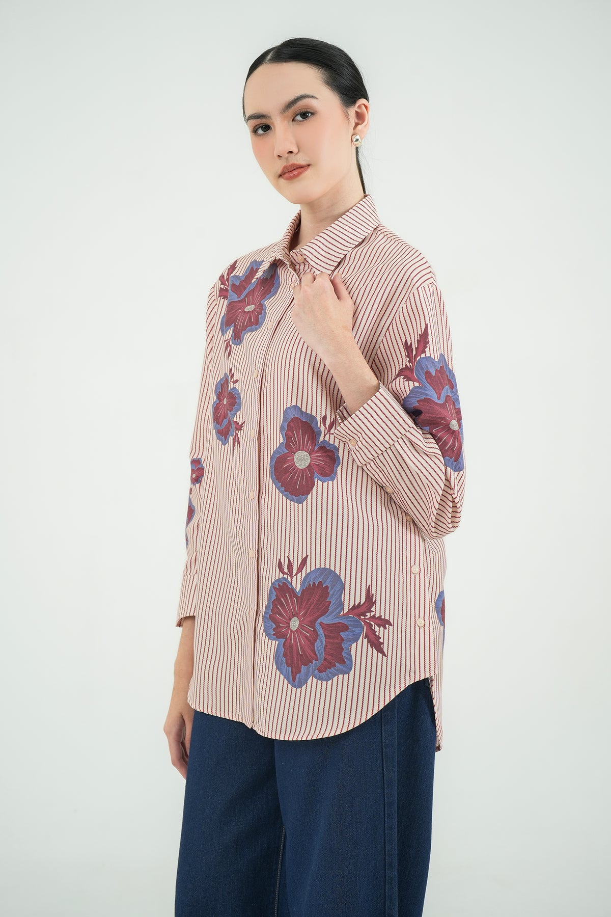 Paduan stripes lembut dengan floral prints, shirt ini menghadirkan nuansa fresh dan feminin—pilihan tepat untuk tampil chic tanpa usaha berlebih.