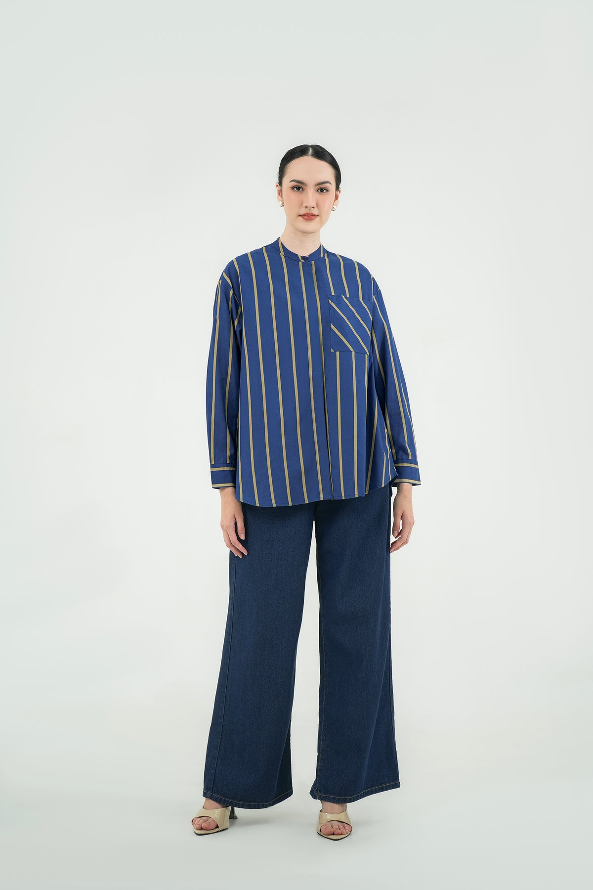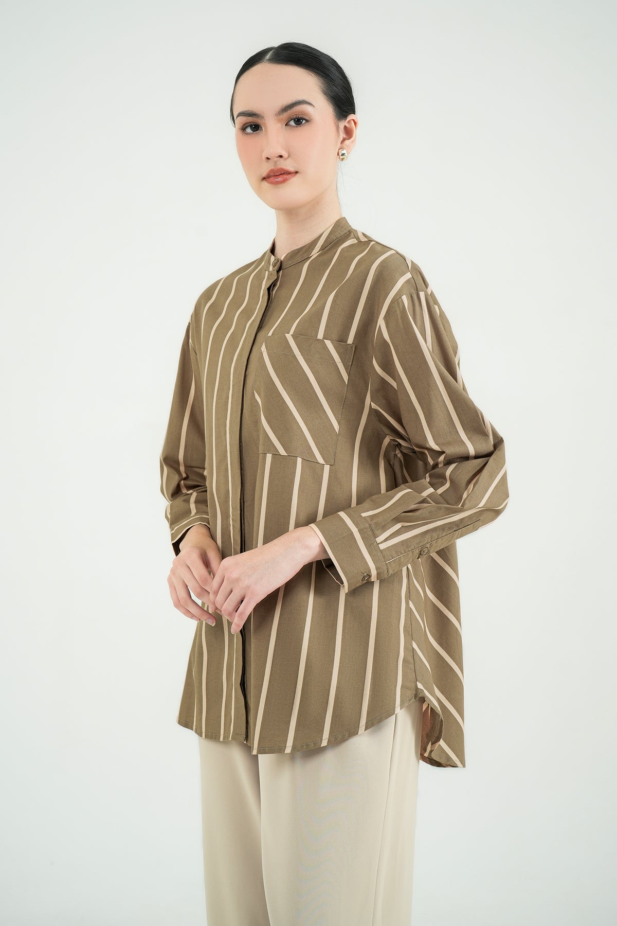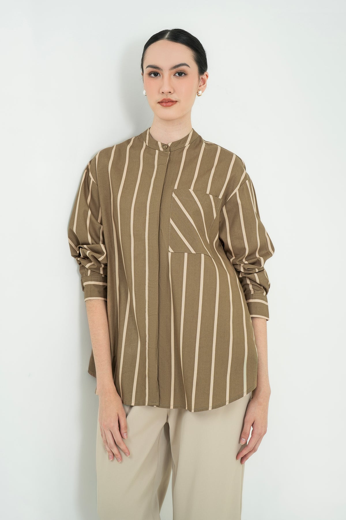 Kemeja bergaris dengan desain modern dan detail pocket diagonal yang memberi sentuhan unik tanpa berlebihan. Terbuat dari premium cotton yang adem, dan jatuh rapi saat dipakai. Cutting relaxed dengan kerah shanghai membuatnya terlihat effortless namun tetap polished. Cocok untuk office days maupun tampilan casual yang rapi.