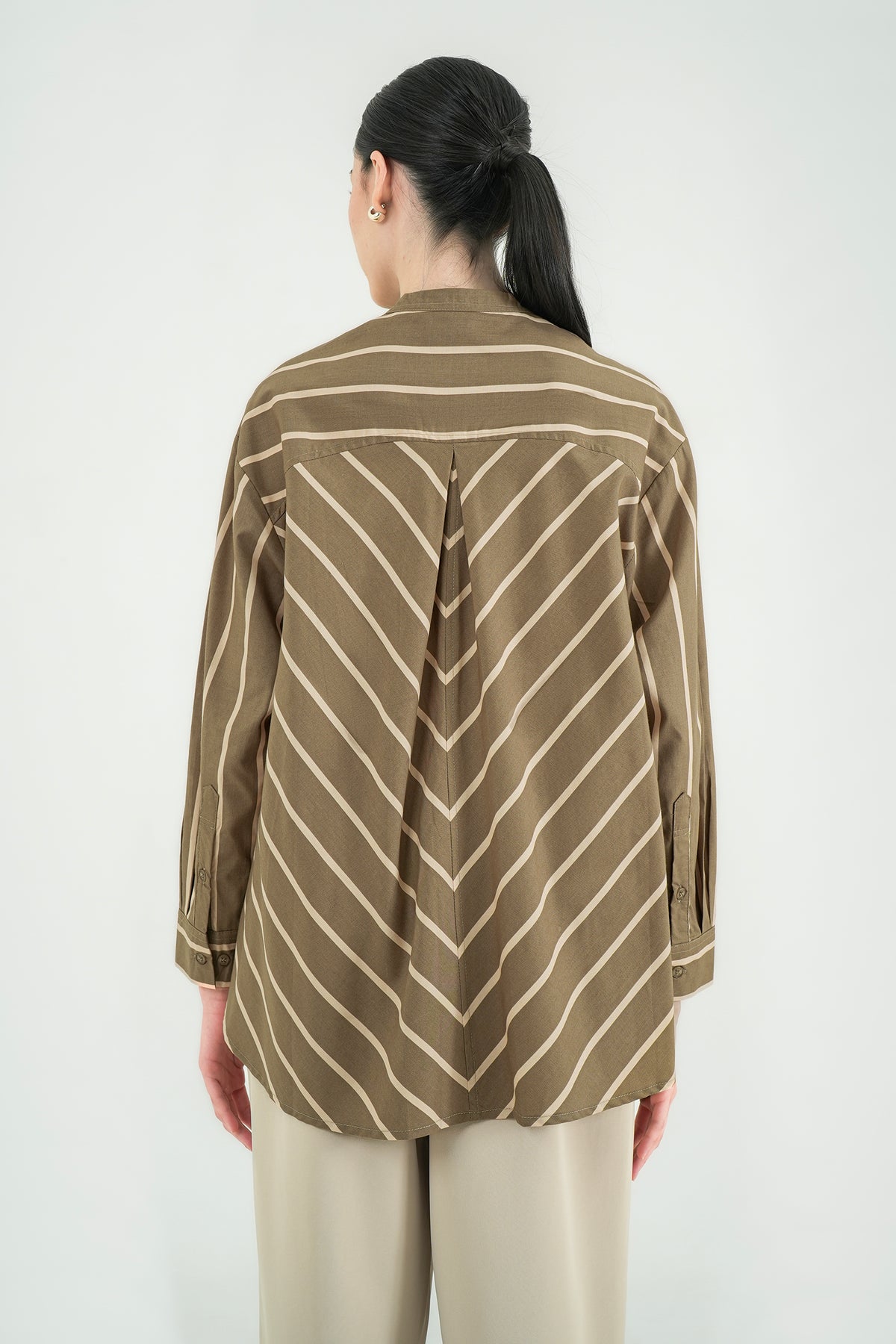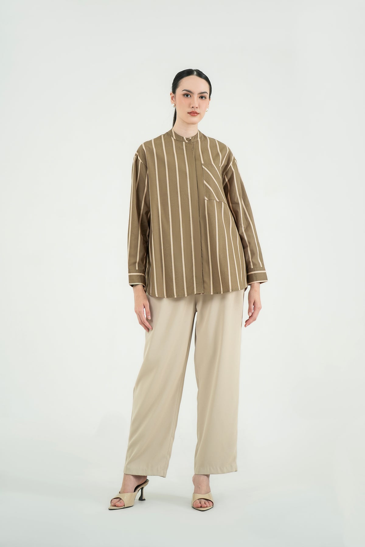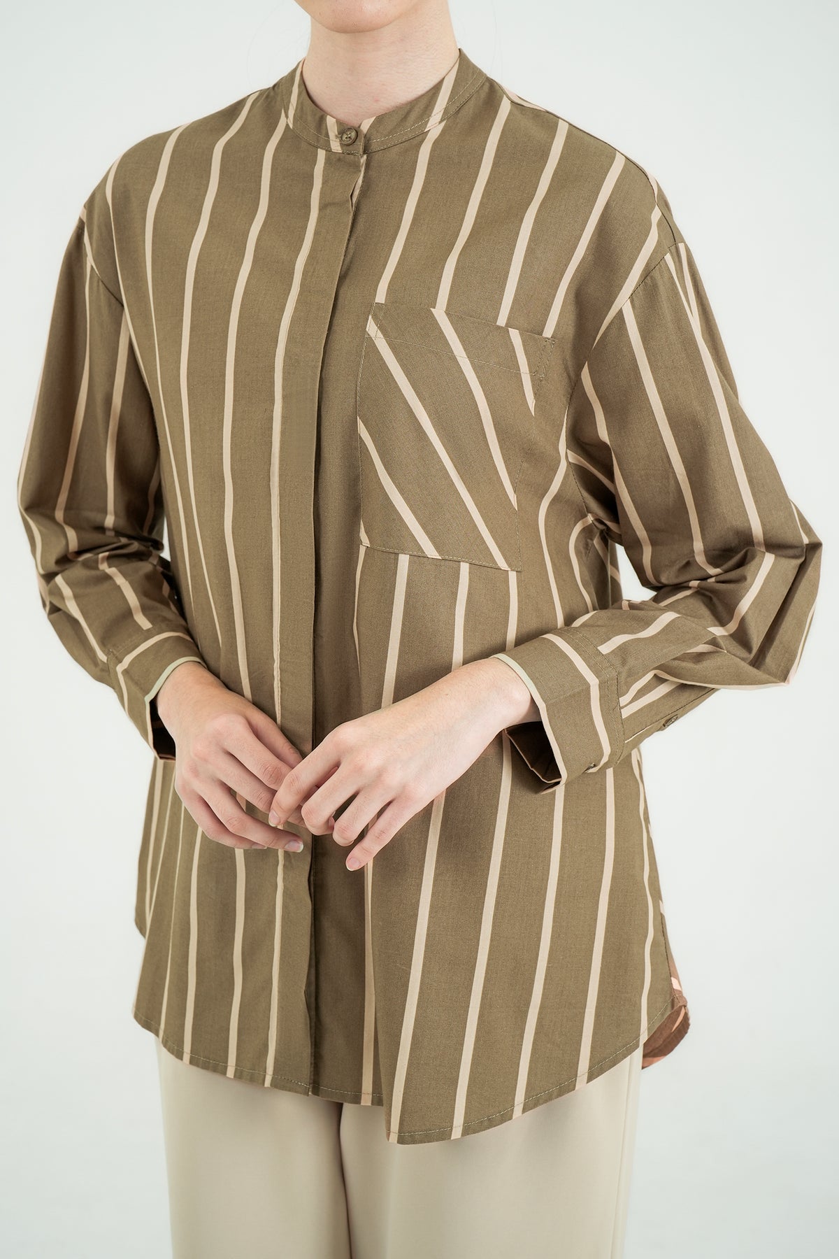 Kemeja bergaris dengan desain modern dan detail pocket diagonal yang memberi sentuhan unik tanpa berlebihan. Terbuat dari premium cotton yang adem, dan jatuh rapi saat dipakai. Cutting relaxed dengan kerah shanghai membuatnya terlihat effortless namun tetap polished. Cocok untuk office days maupun tampilan casual yang rapi.