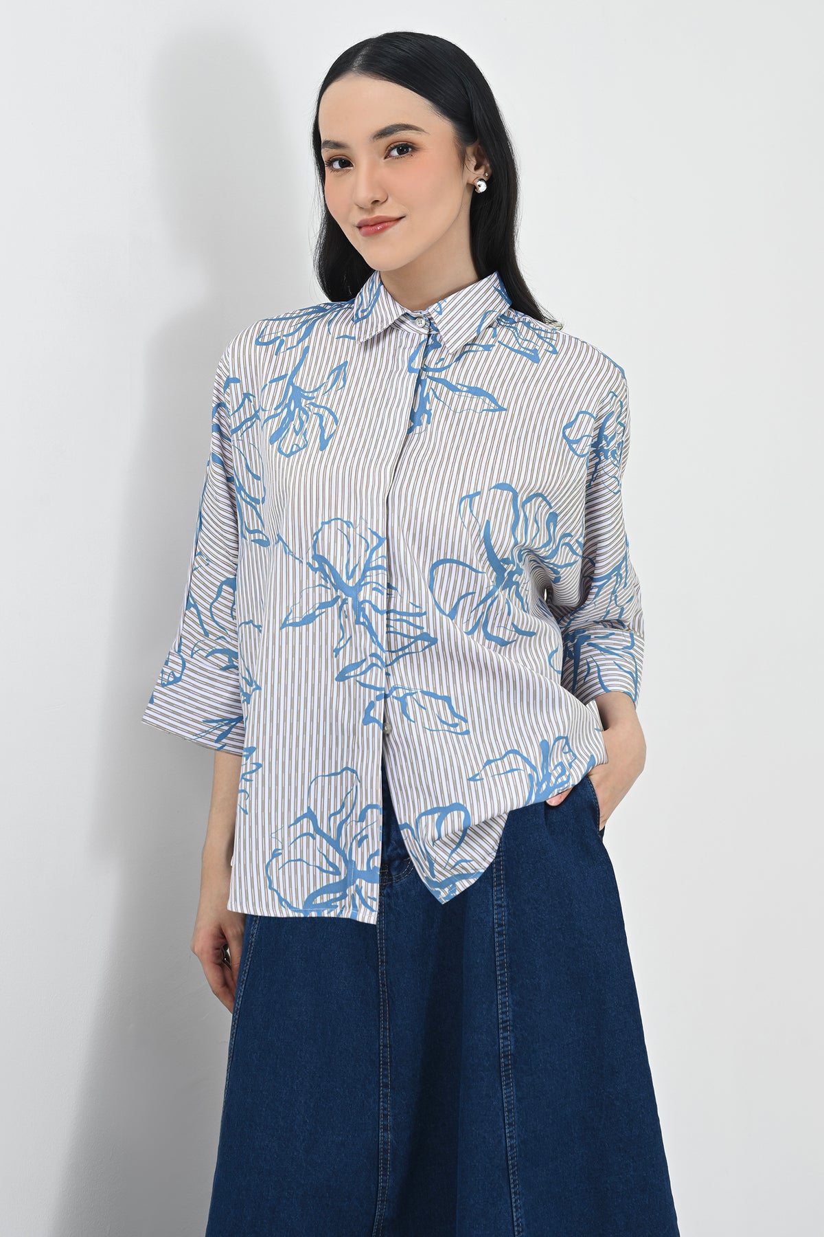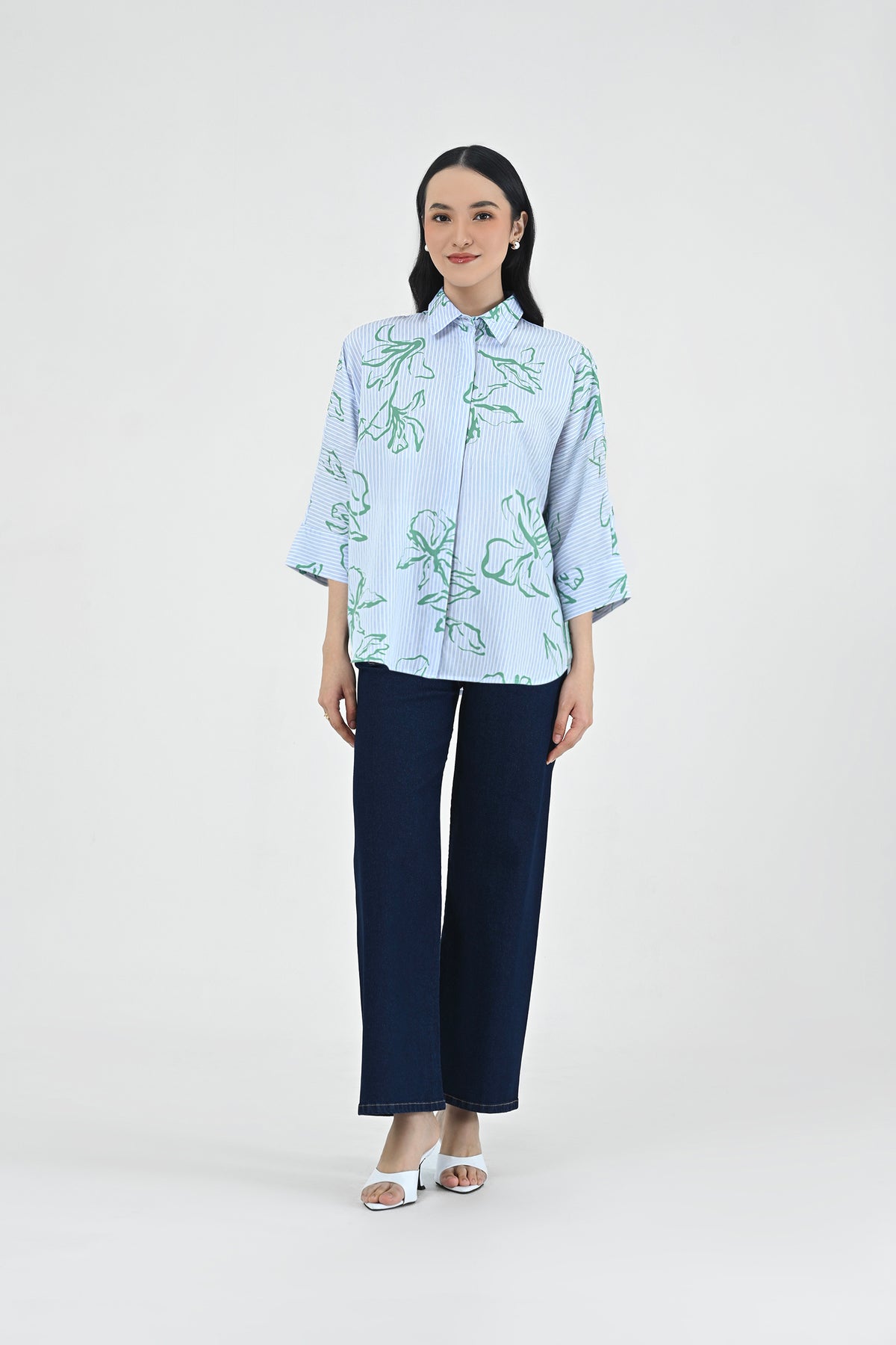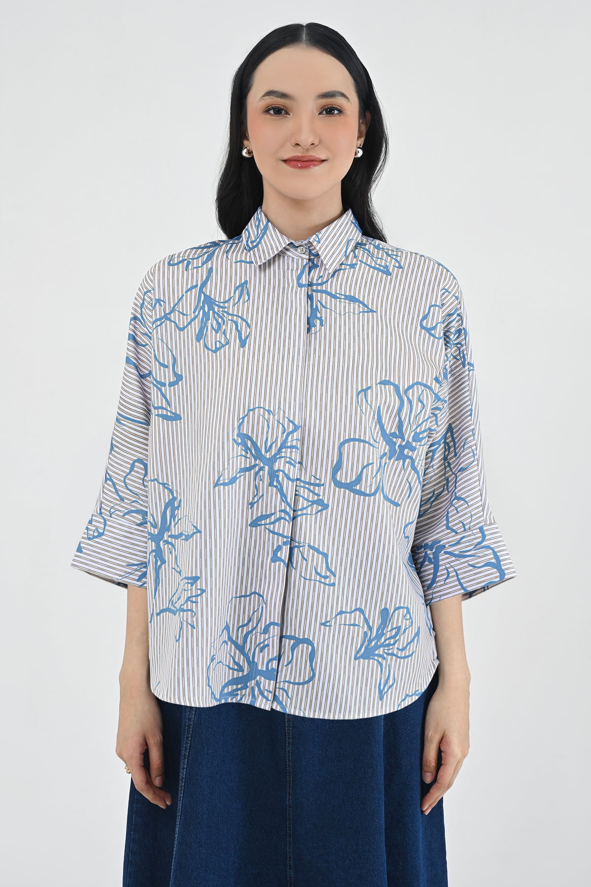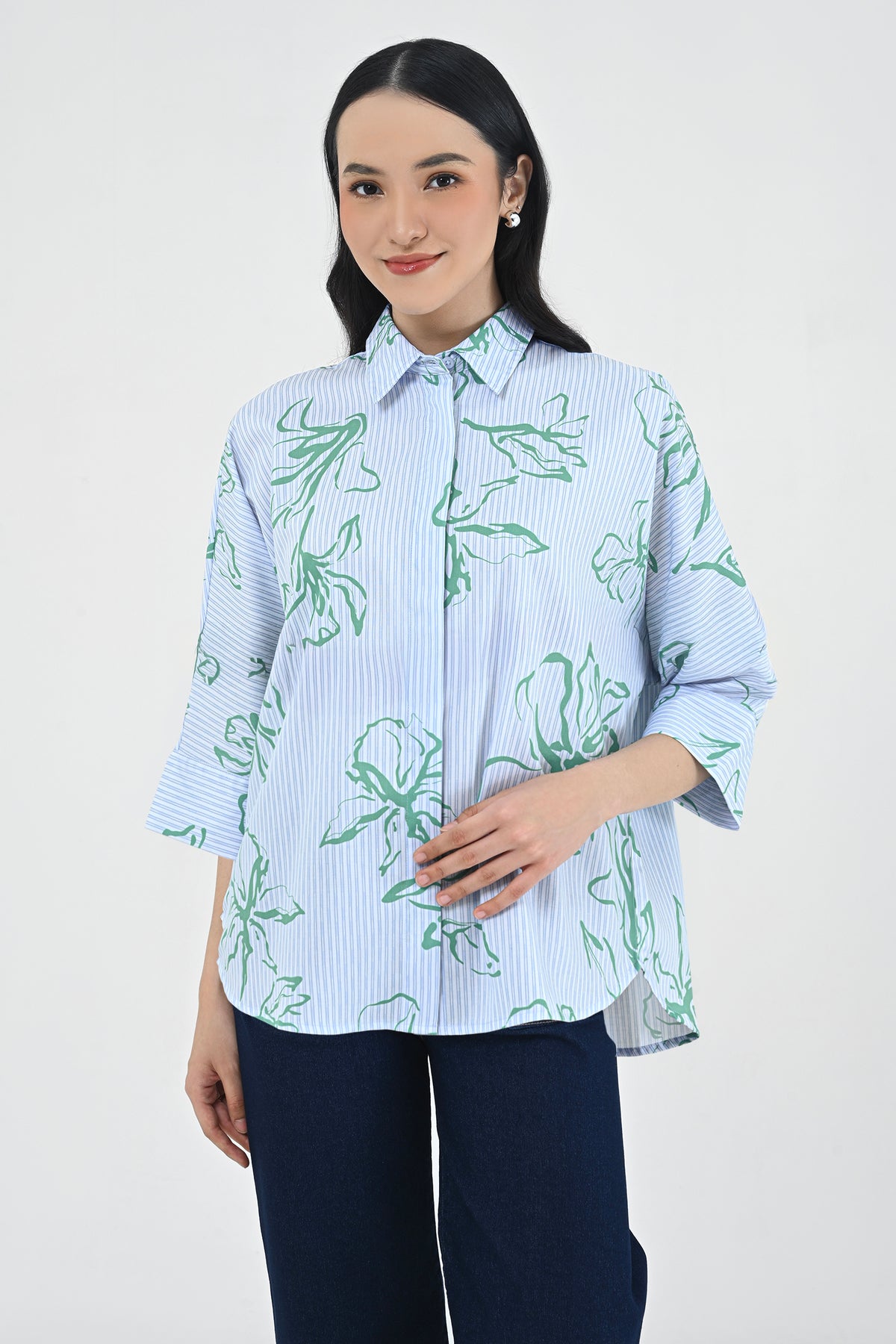 Kemeja ini memadukan motif stripes klasik dengan sentuhan bunga yang cantik dan fresh, menghadirkan look yang stylish sekaligus feminin. Desainnya versatile, mudah dipadukan untuk gaya kasual maupun semi-formal