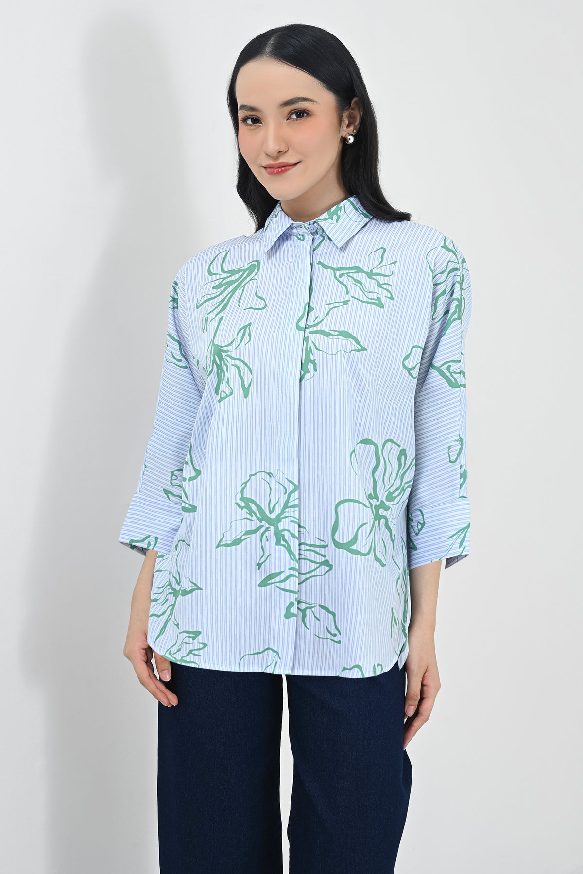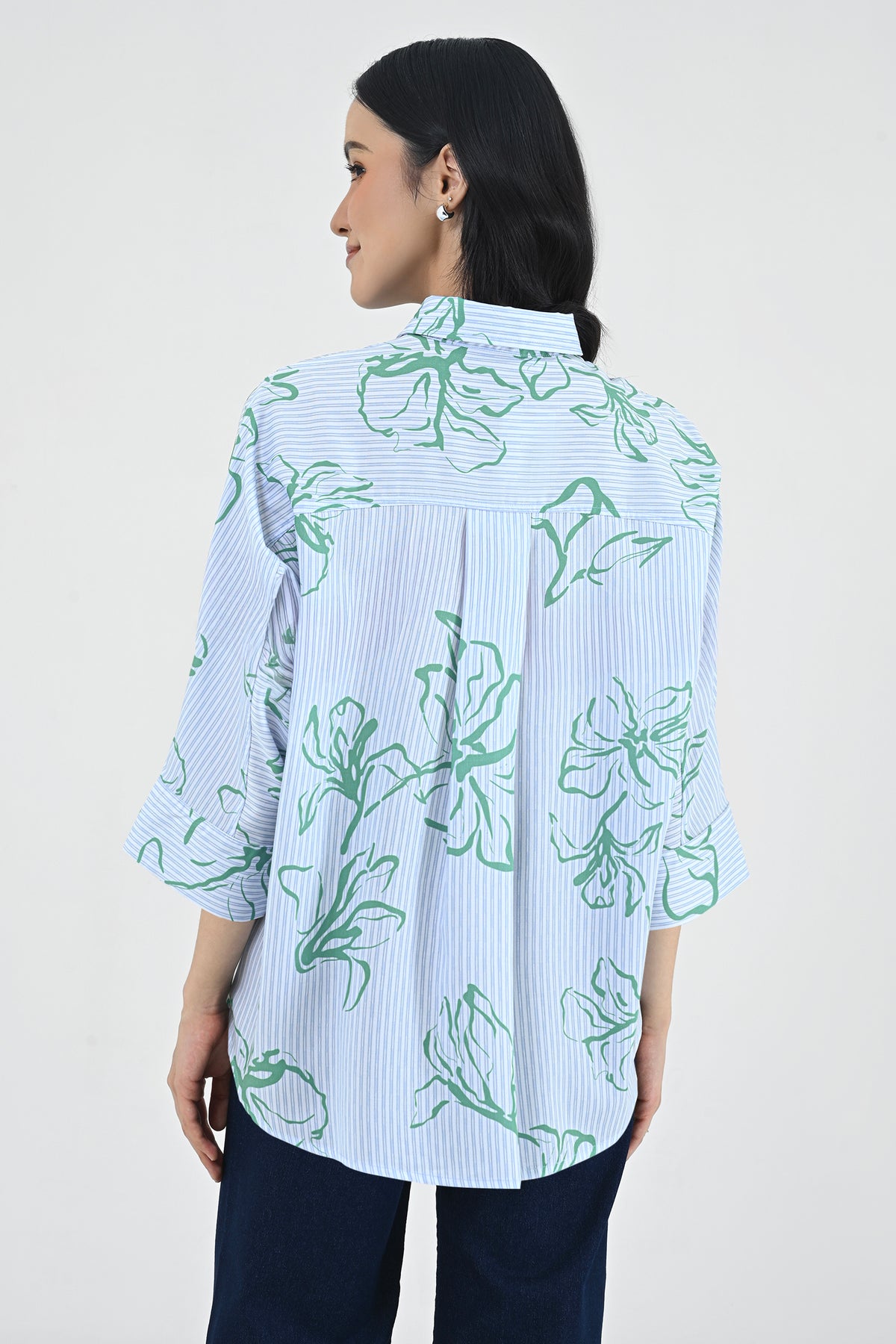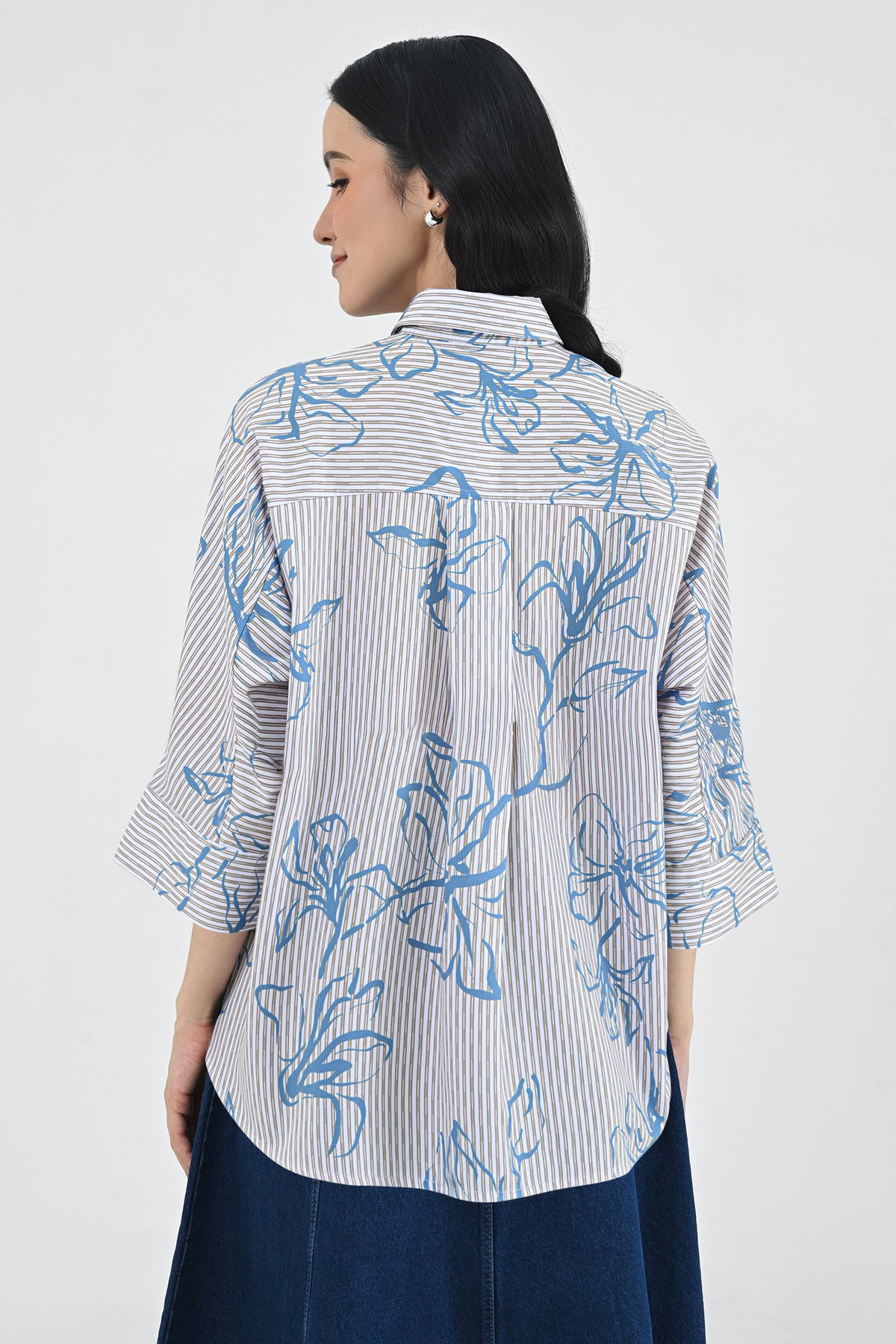 Kemeja ini memadukan motif stripes klasik dengan sentuhan bunga yang cantik dan fresh, menghadirkan look yang stylish sekaligus feminin. Desainnya versatile, mudah dipadukan untuk gaya kasual maupun semi-formal