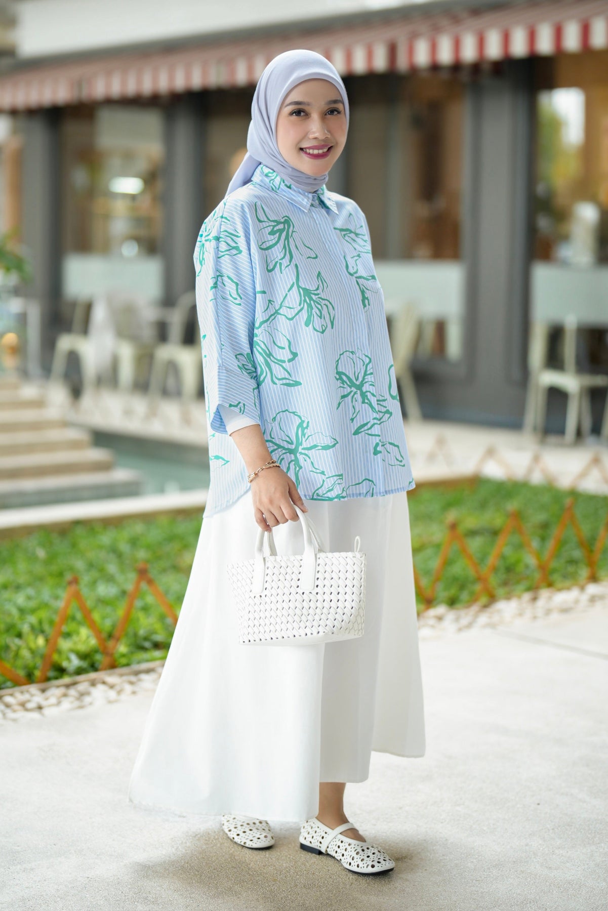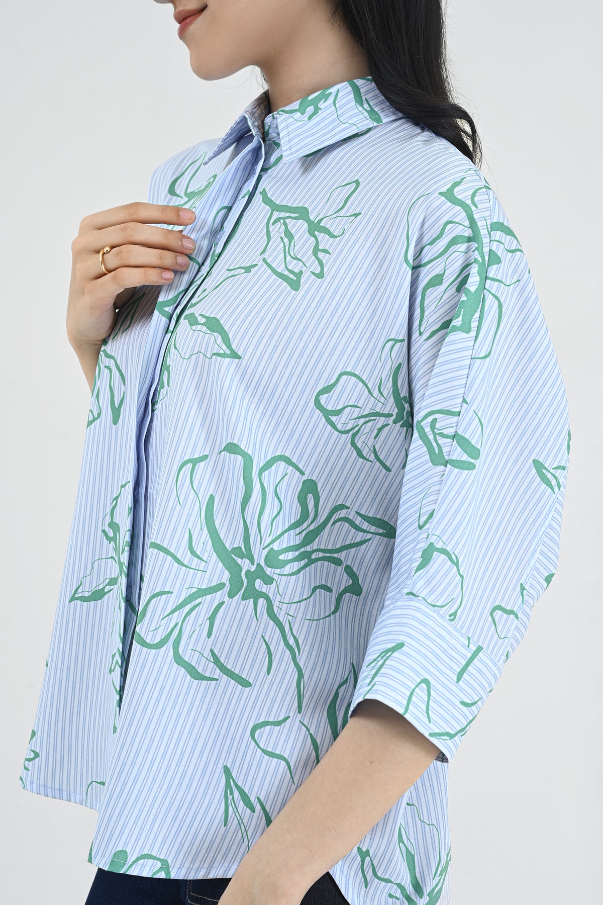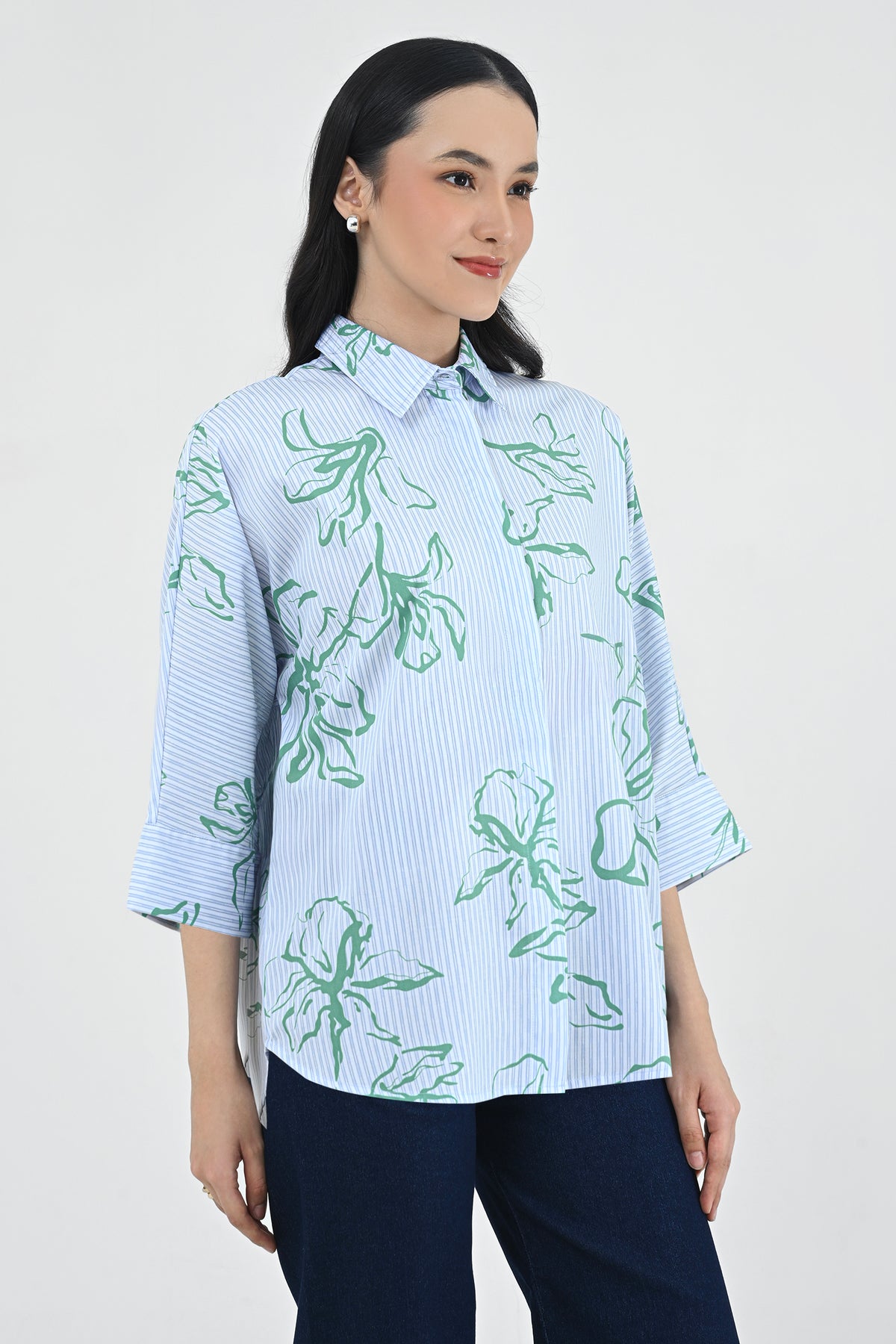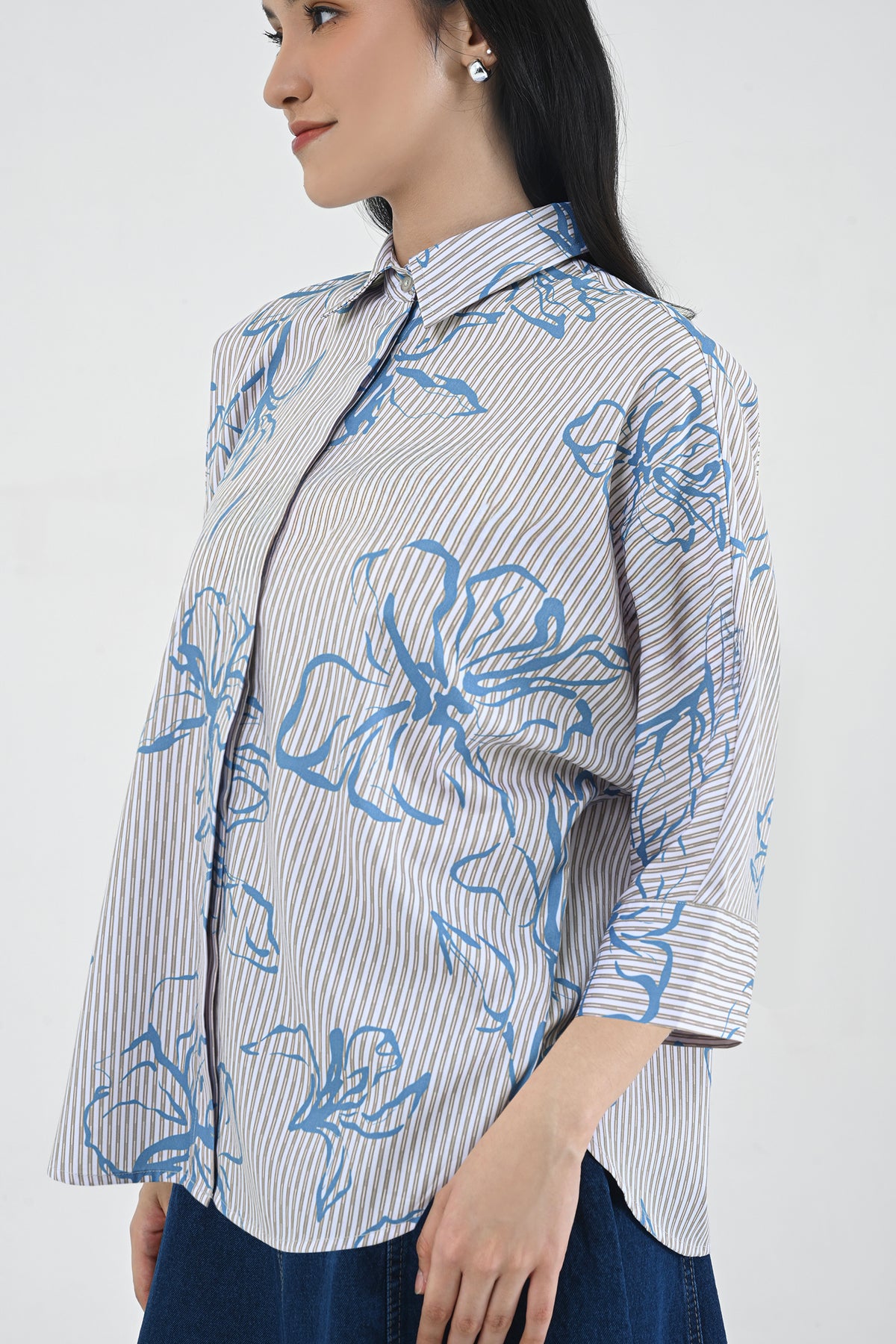 Kemeja ini memadukan motif stripes klasik dengan sentuhan bunga yang cantik dan fresh, menghadirkan look yang stylish sekaligus feminin. Desainnya versatile, mudah dipadukan untuk gaya kasual maupun semi-formal