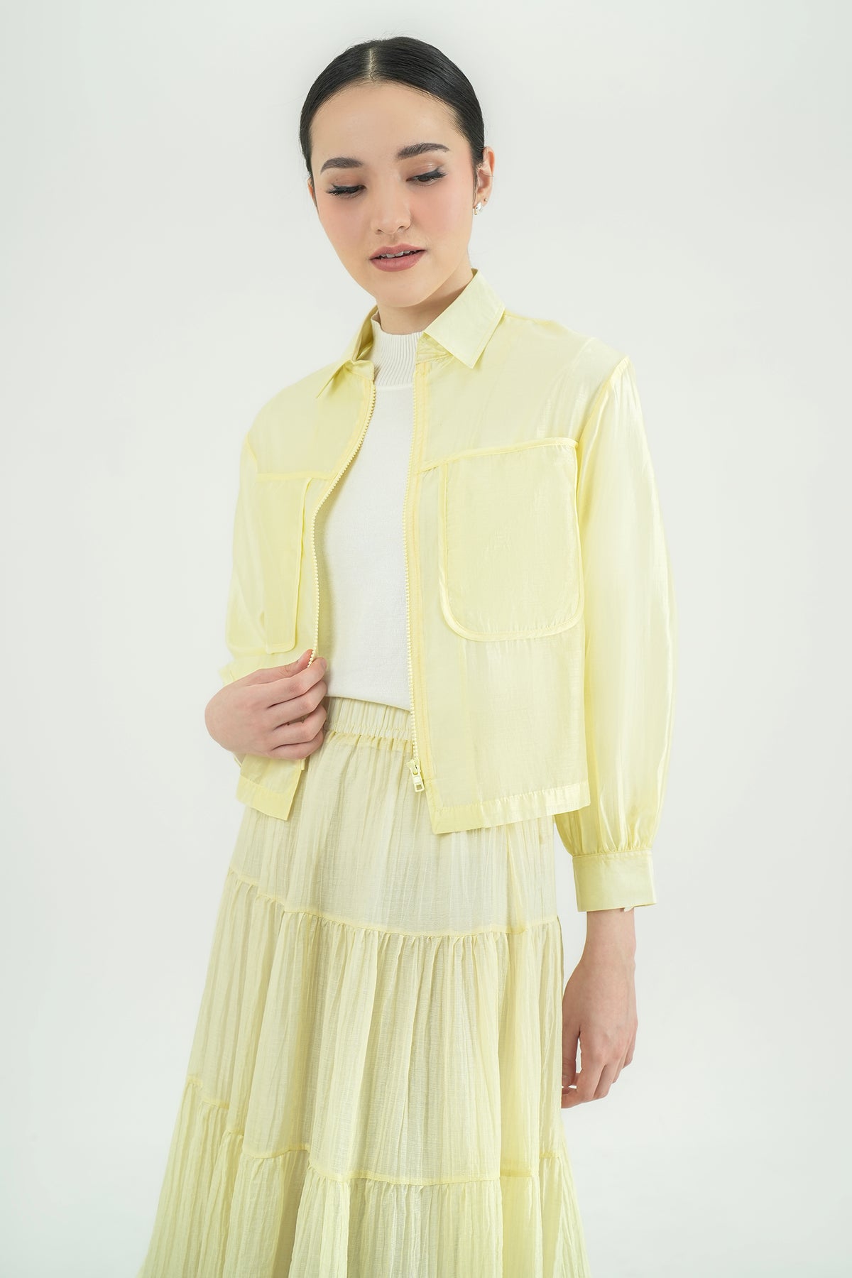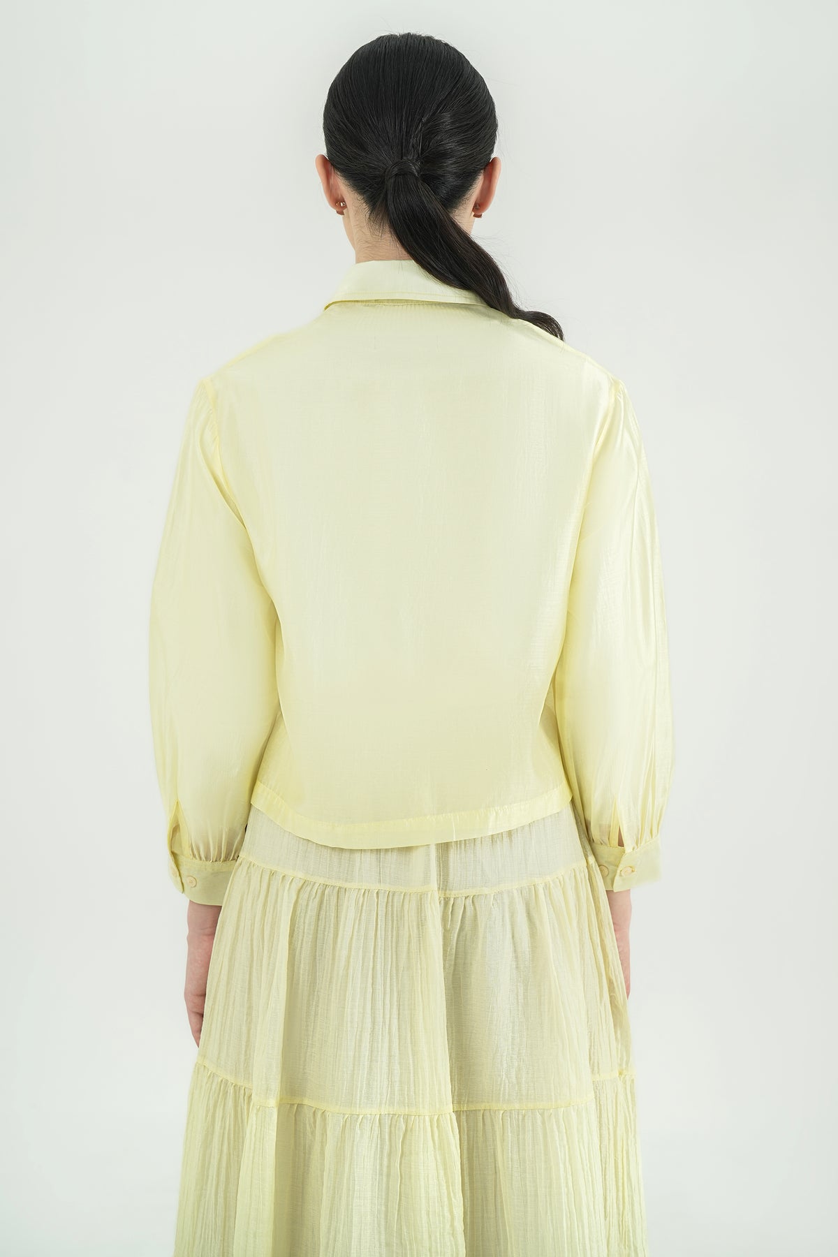 Outer shirt berbahan Silky Cotton Sheer yang ringan, lembut, dan punya efek silky subtle saat dipakai. Teksturnya airy dengan sedikit transparansi yang membuat tampilannya fresh & modern. Cutting cropped-relaxed dengan dua pocket depan, cocok dipakai sebagai outer harian maupun layer tambahan untuk look yang lebih stylish. Nyaman banget untuk cuaca panas sekalipun.