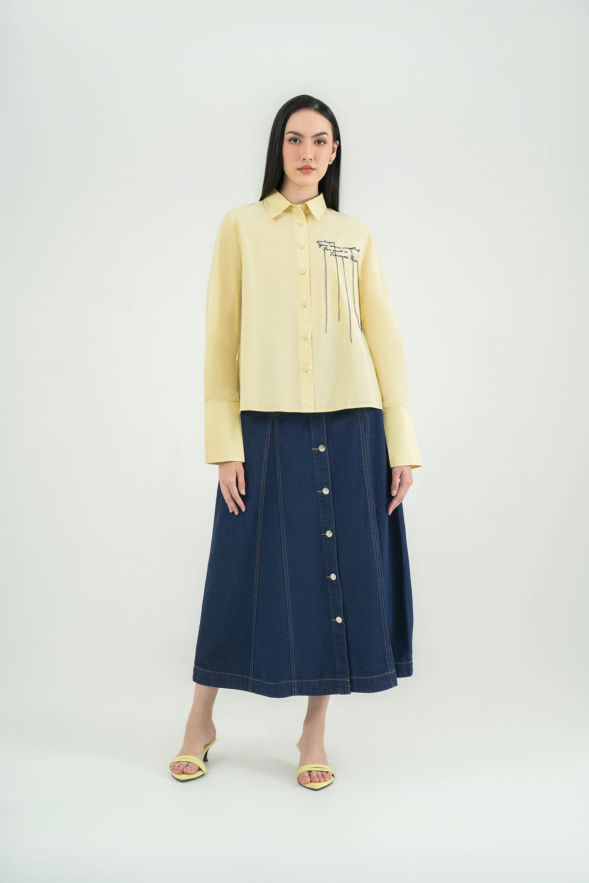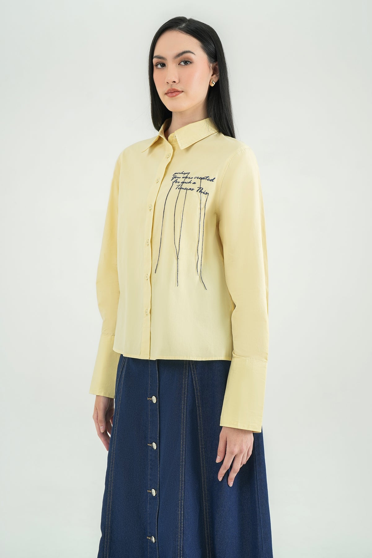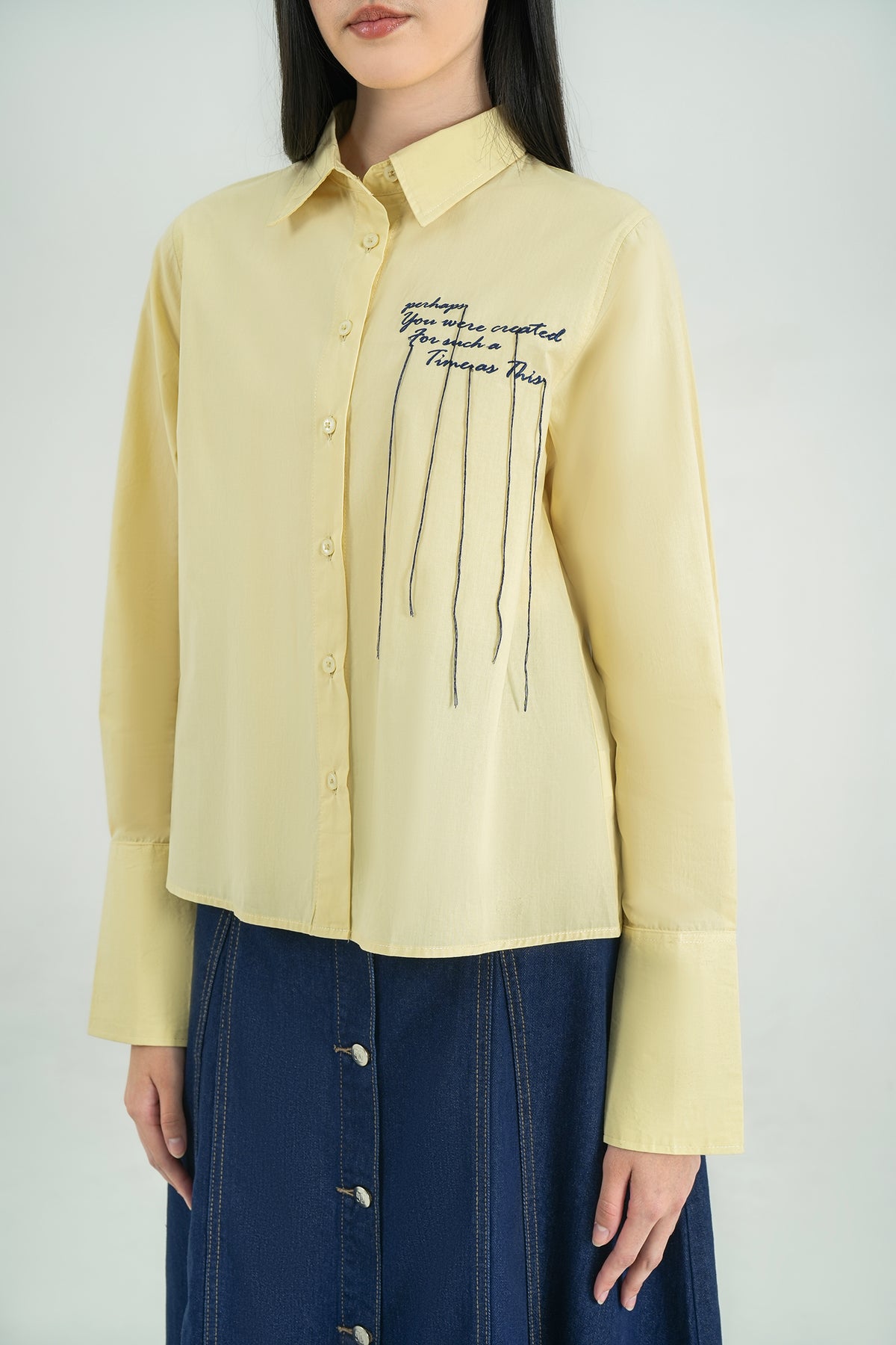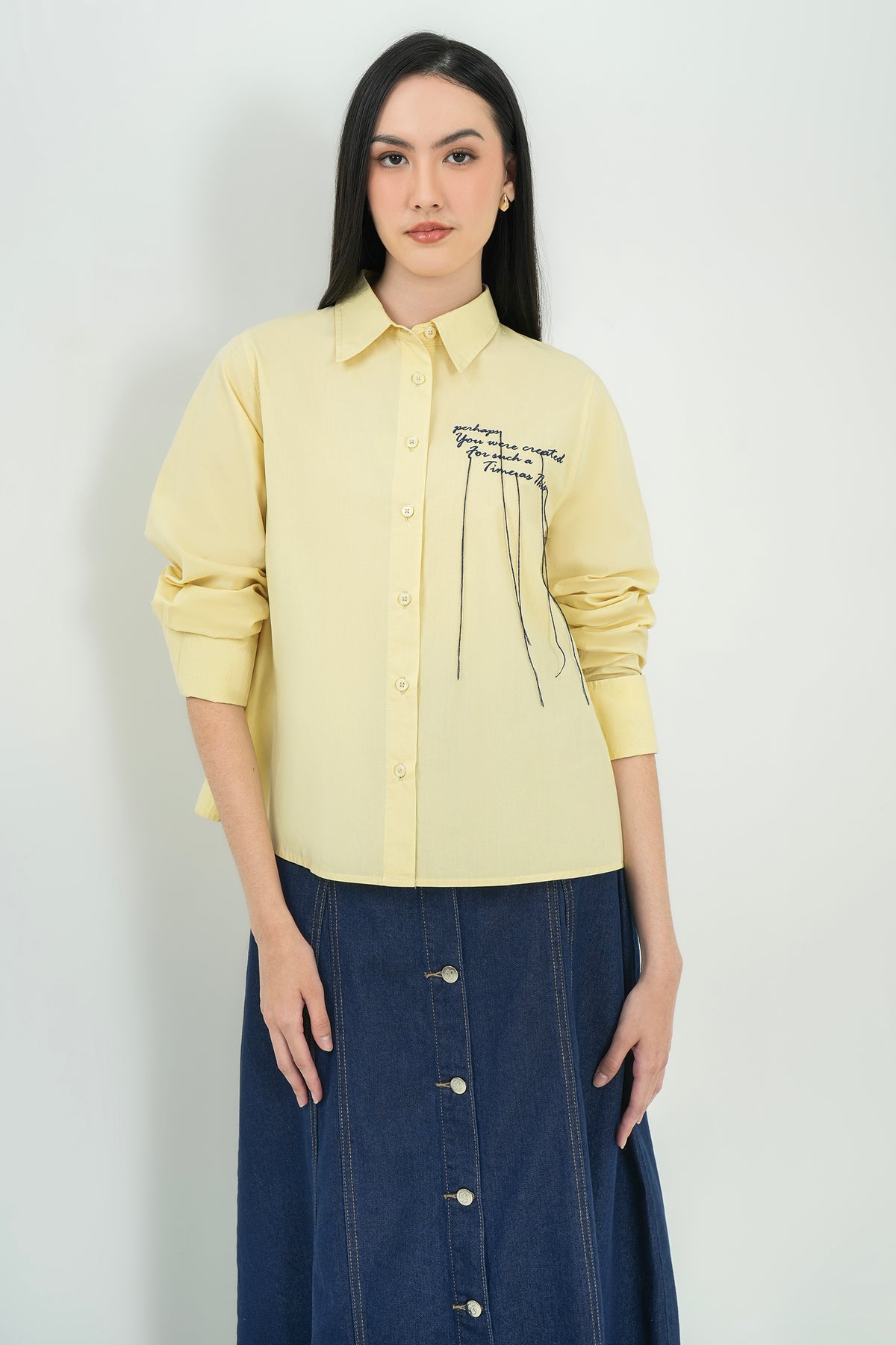 Kemeja berbahan 100% Cotton yang lembut, adem, dan nyaman untuk dipakai sepanjang hari. Dilengkapi detail embroidery text di bagian depan untuk sentuhan unik yang membuat look-nya lebih playful namun tetap minimalis. Cutting relaxed dengan lipit halus di lengan memberikan siluet yang clean dan effortless. Cocok untuk daily wear, work look, maupun casual weekend.