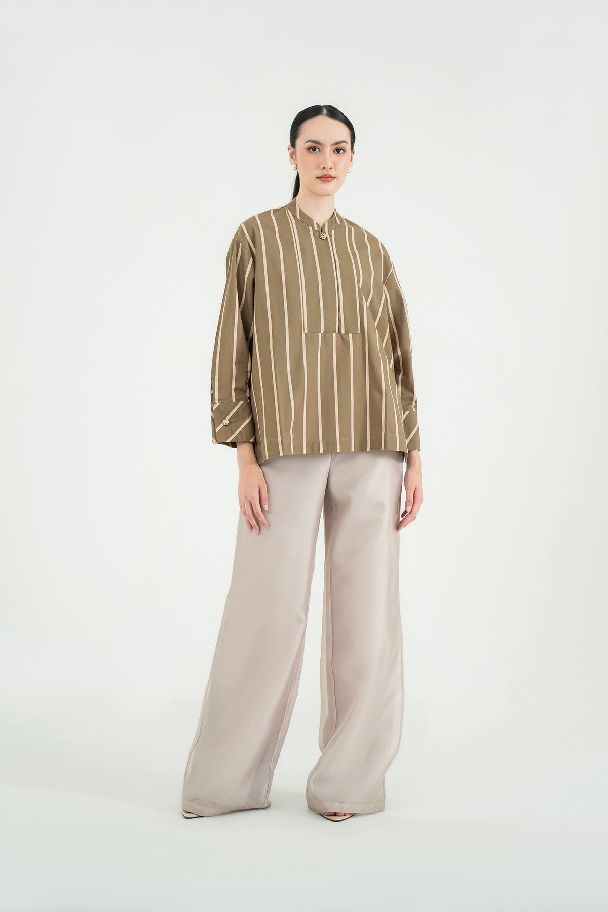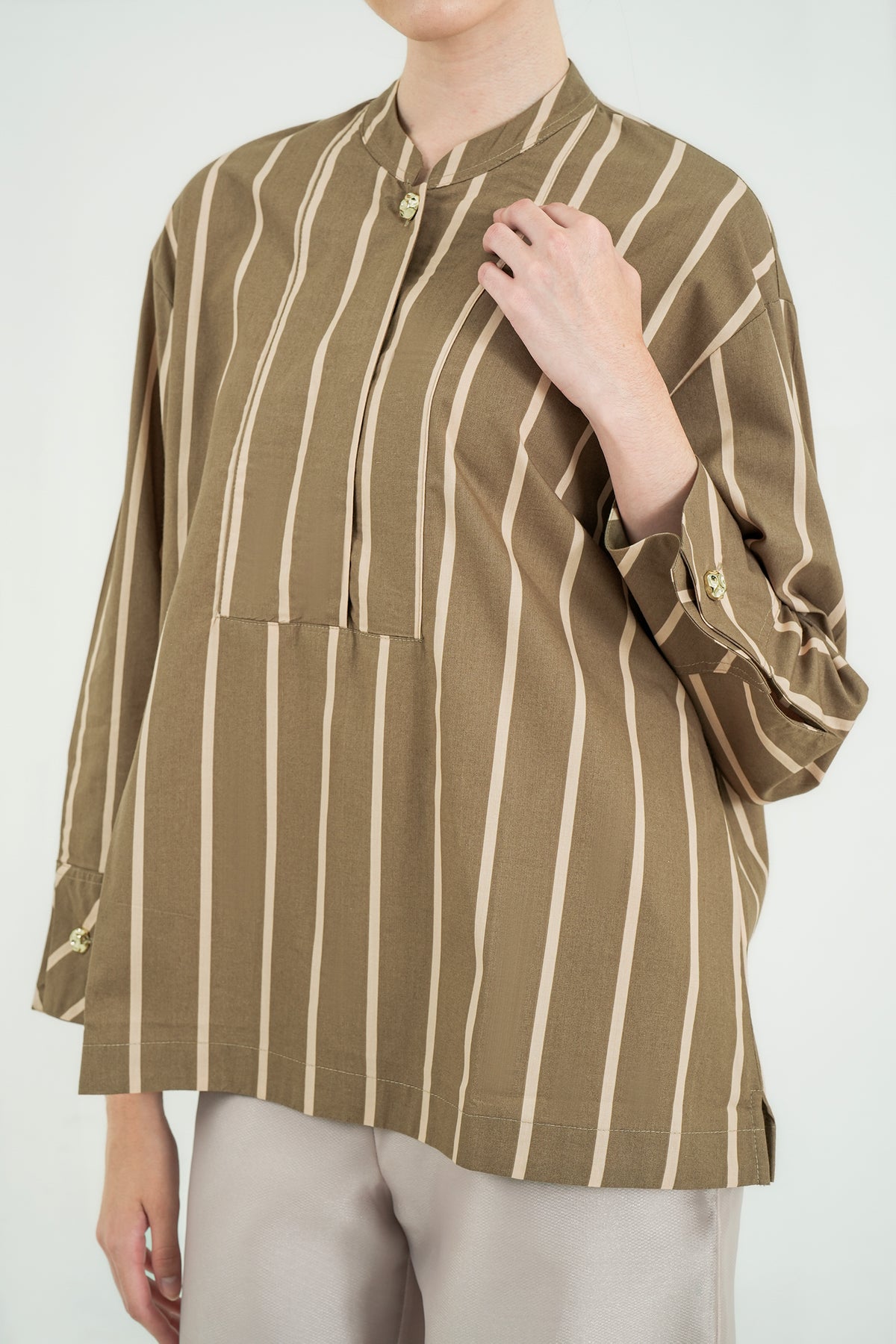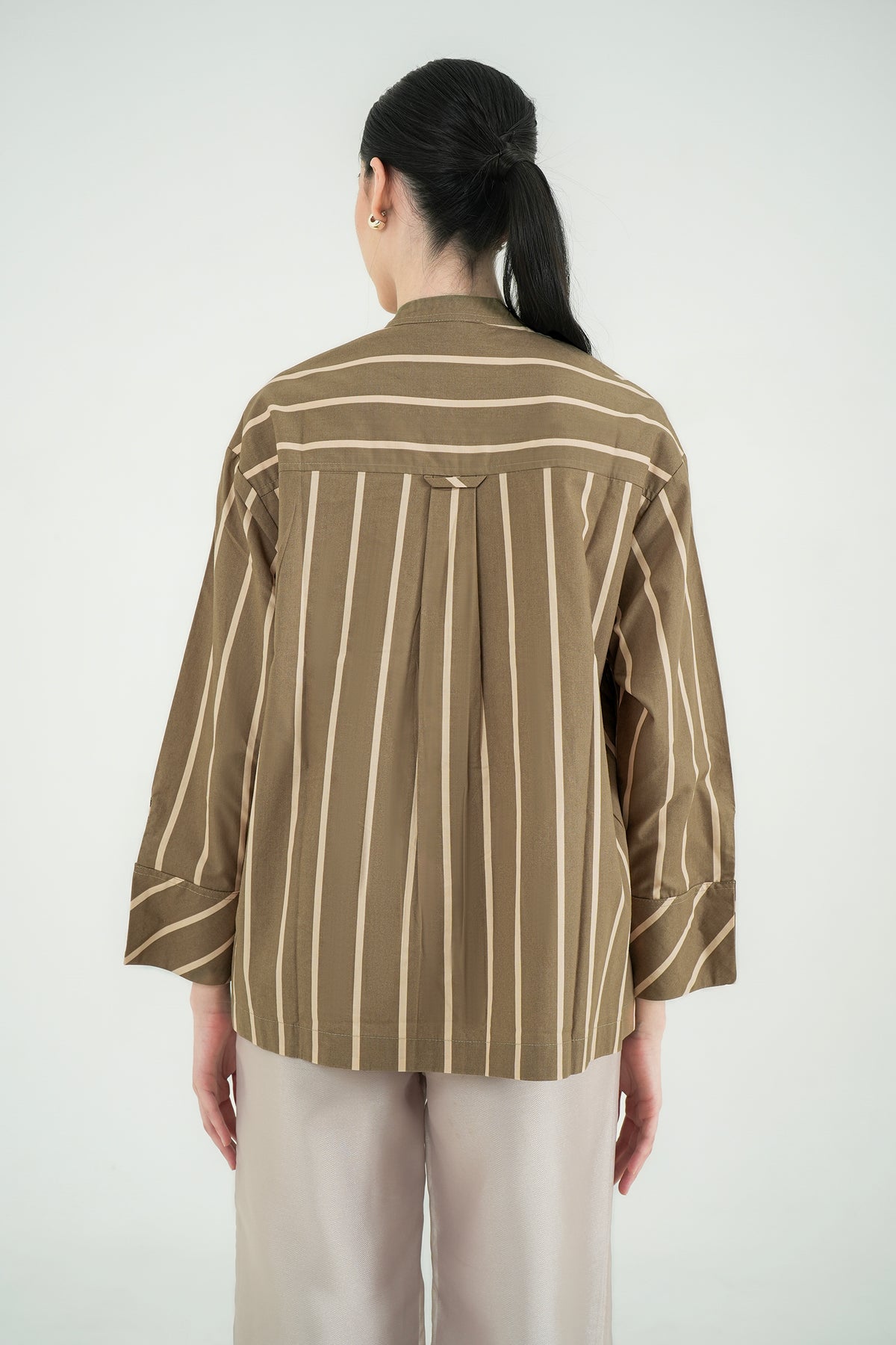 Atasan bergaris dengan cutting relaxed yang nyaman dan clean. Dibuat dari premium cotton yang adem dipakai seharian. Motif stripe vertikal memberi efek tampak lebih jenjang, sementara detail kerah modern dan siluet loose membuatnya effortless namun tetap polished. Cocok untuk office look maupun casual day-out.