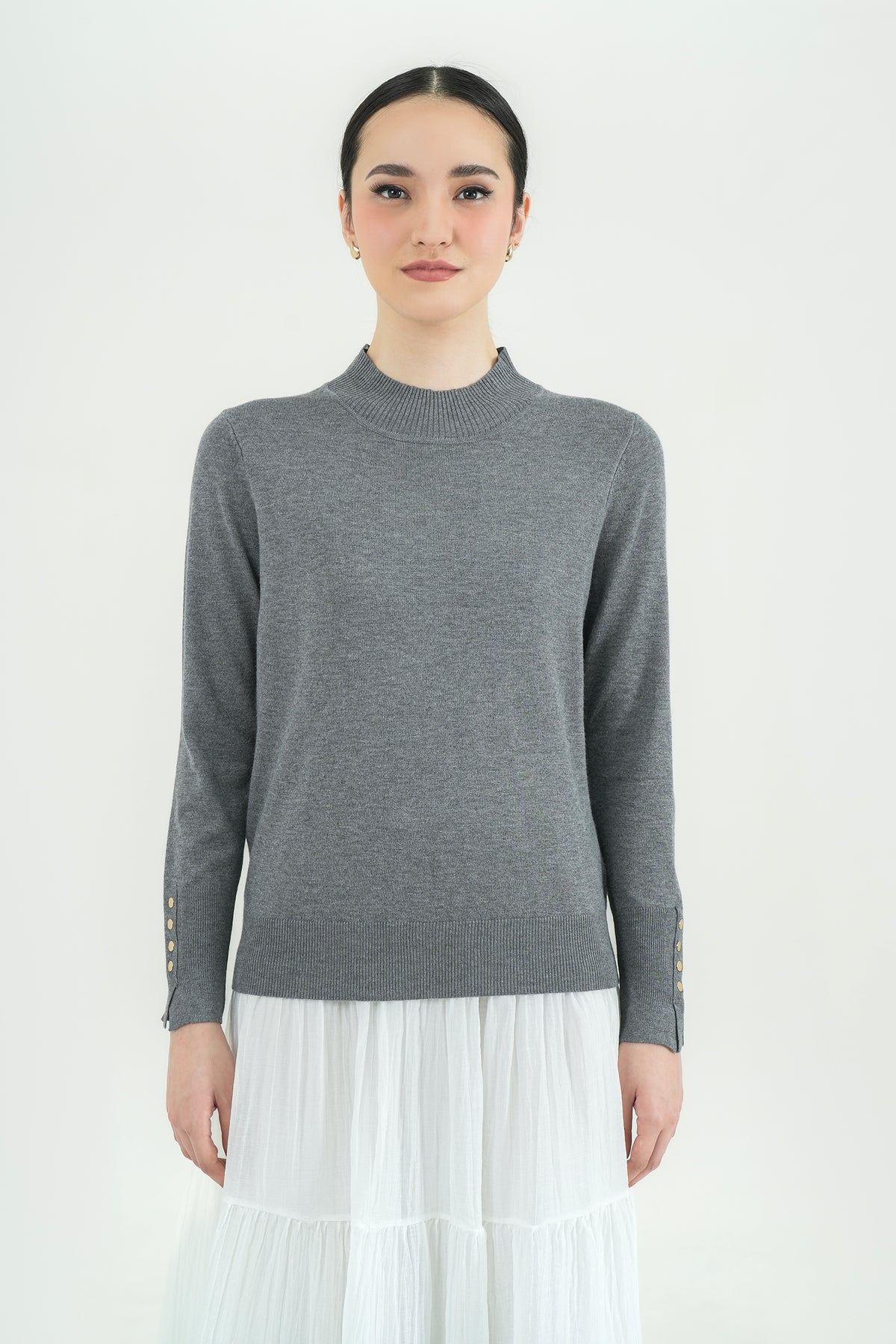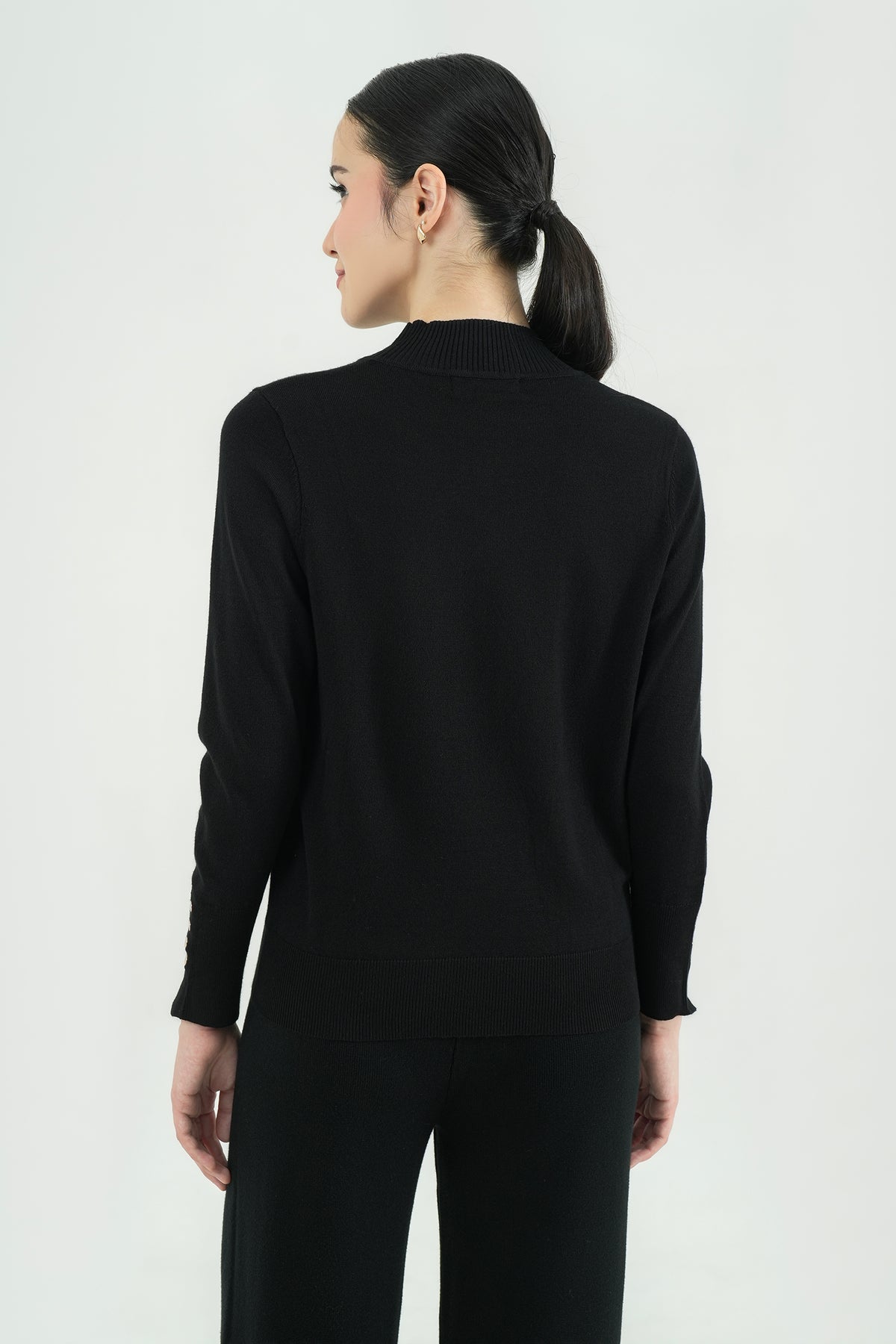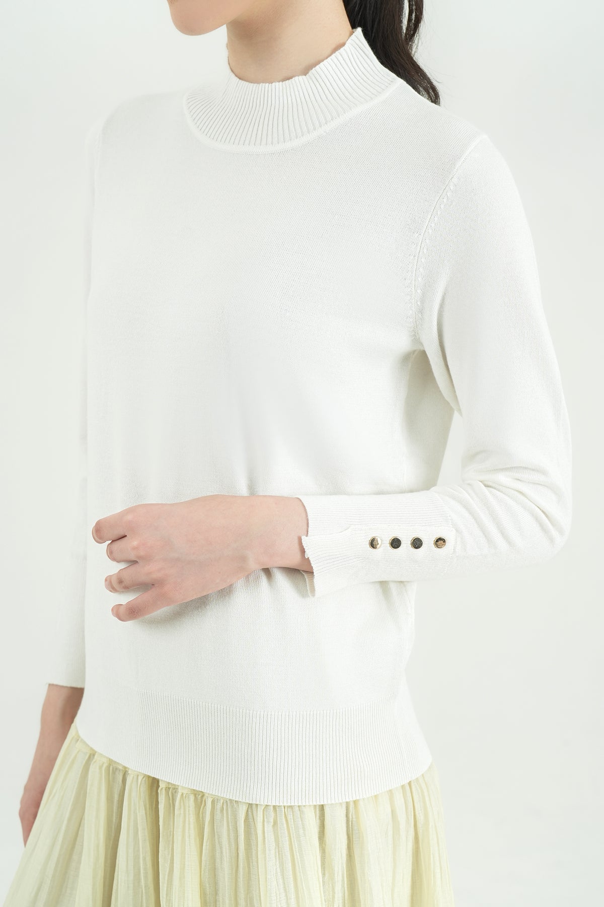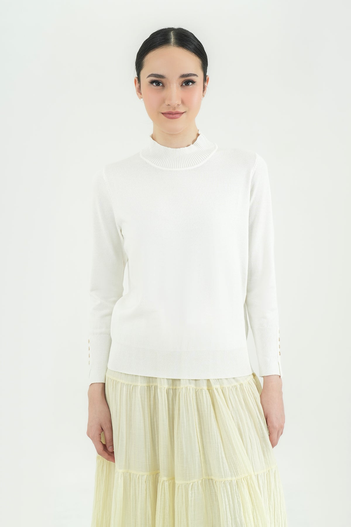 Top rajut berbahan premium cotton knit yang lembut, ringan, dan nyaman di kulit. Hadir dengan desain mock-neck yang clean serta detail kancing gold pada lengan sebagai aksen classy. Cutting-nya fit namun tetap fleksibel dipakai seharian, cocok untuk tampilan kasual maupun kerja. Mudah dipadu-padankan dengan rok ataupun celana favoritmu.