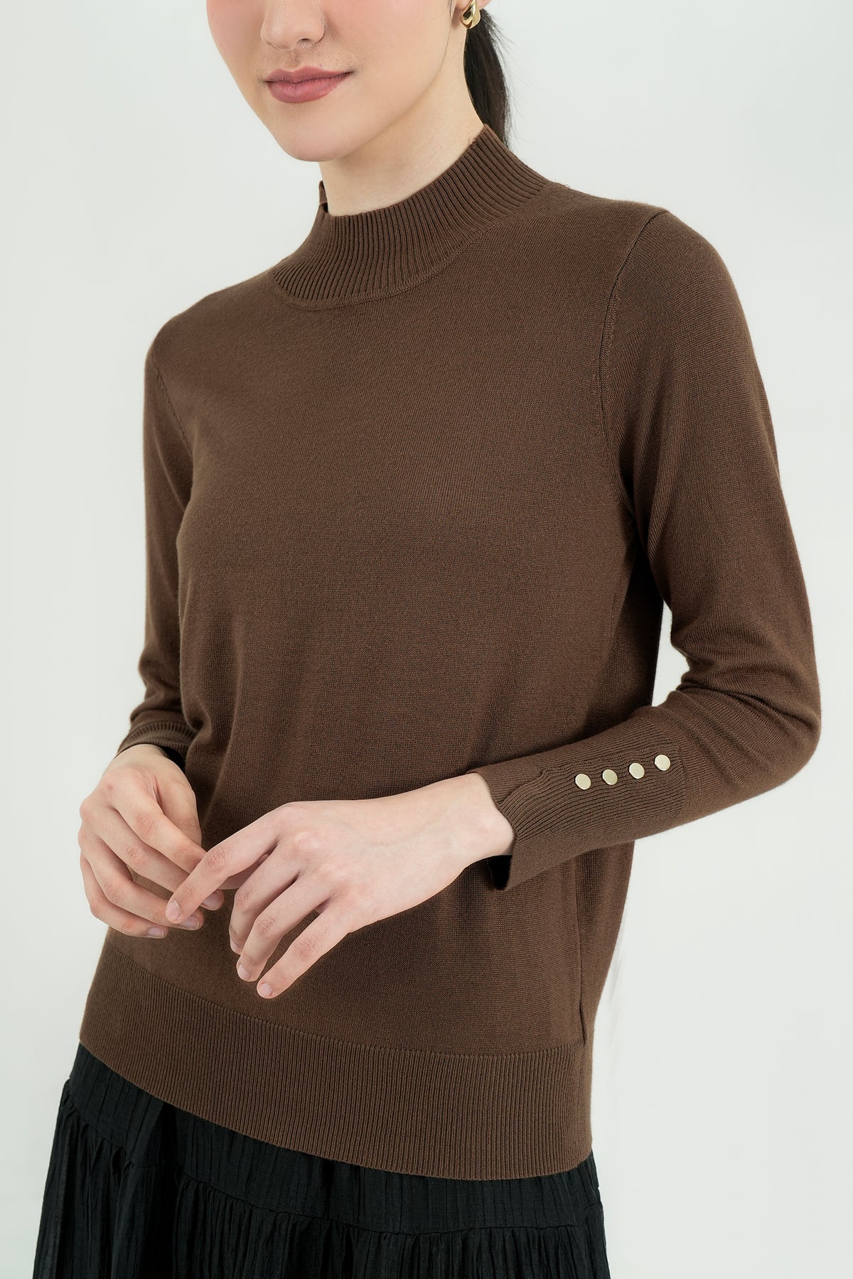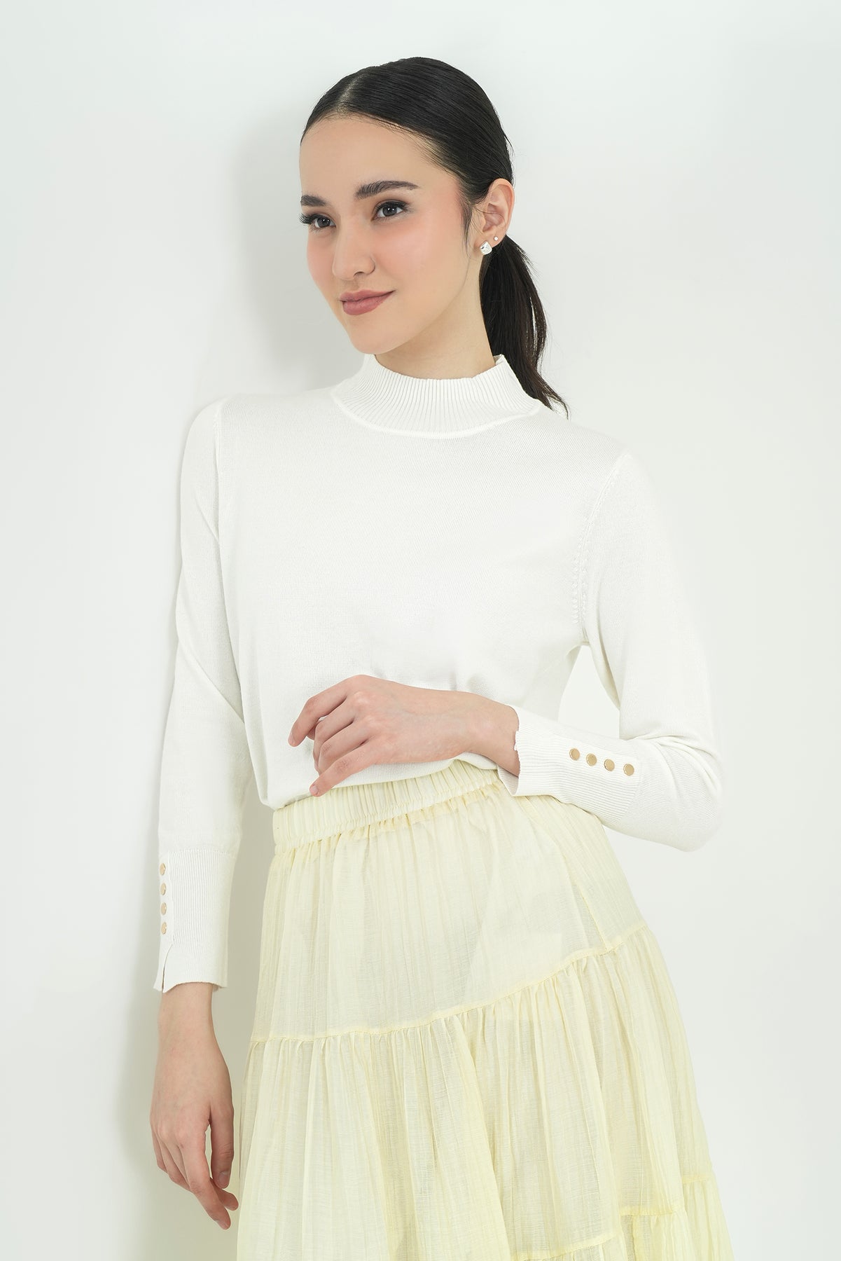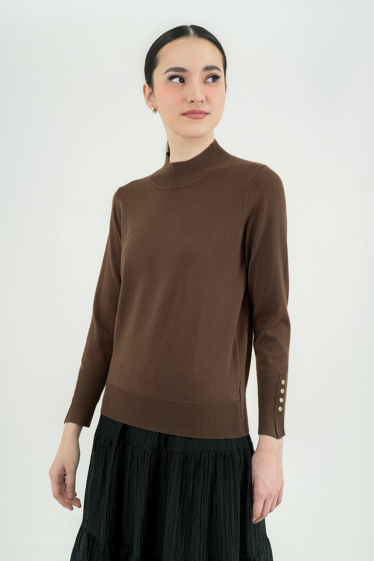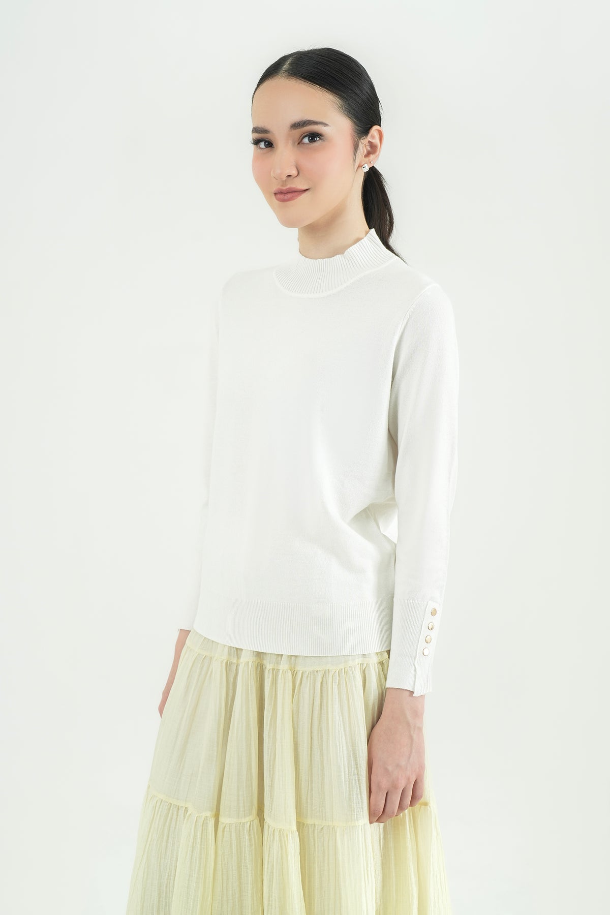 Top rajut berbahan premium cotton knit yang lembut, ringan, dan nyaman di kulit. Hadir dengan desain mock-neck yang clean serta detail kancing gold pada lengan sebagai aksen classy. Cutting-nya fit namun tetap fleksibel dipakai seharian, cocok untuk tampilan kasual maupun kerja. Mudah dipadu-padankan dengan rok ataupun celana favoritmu.