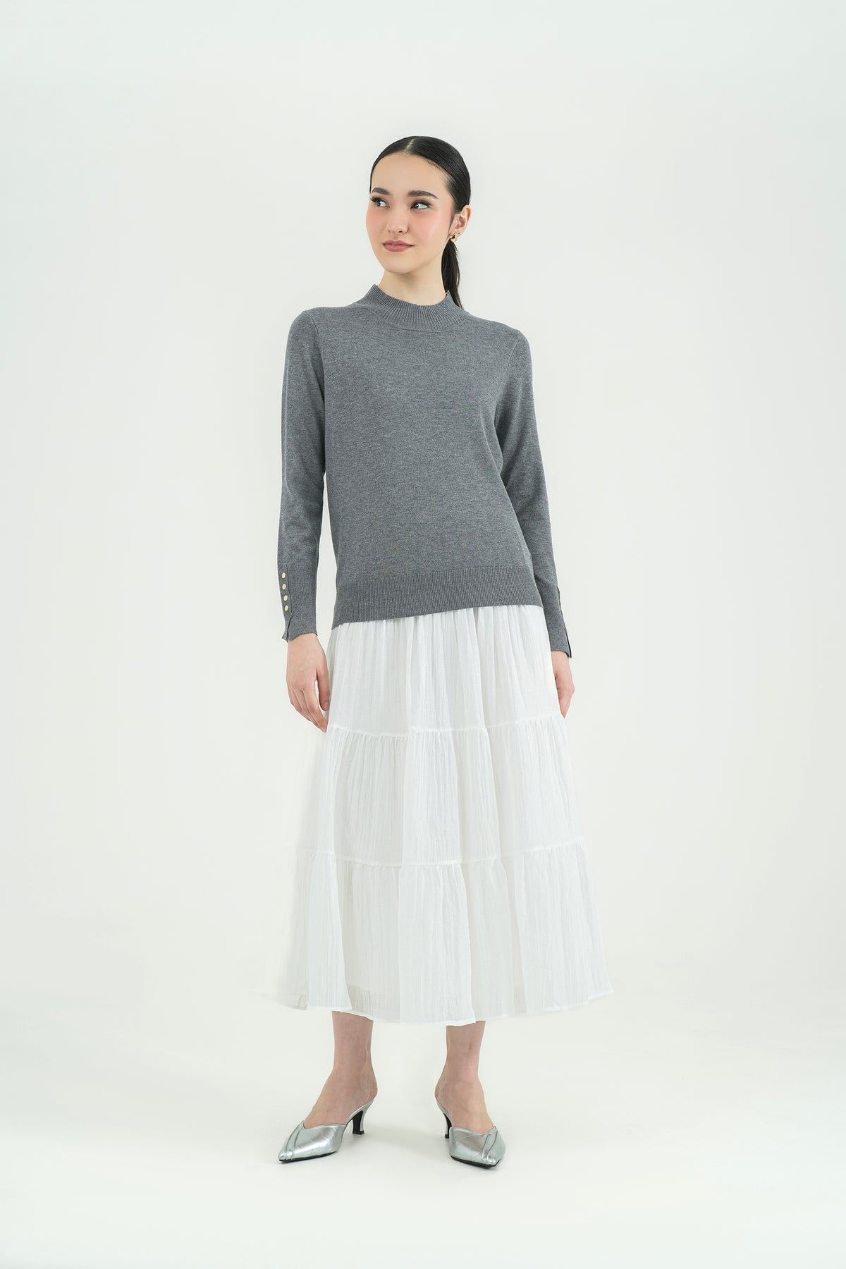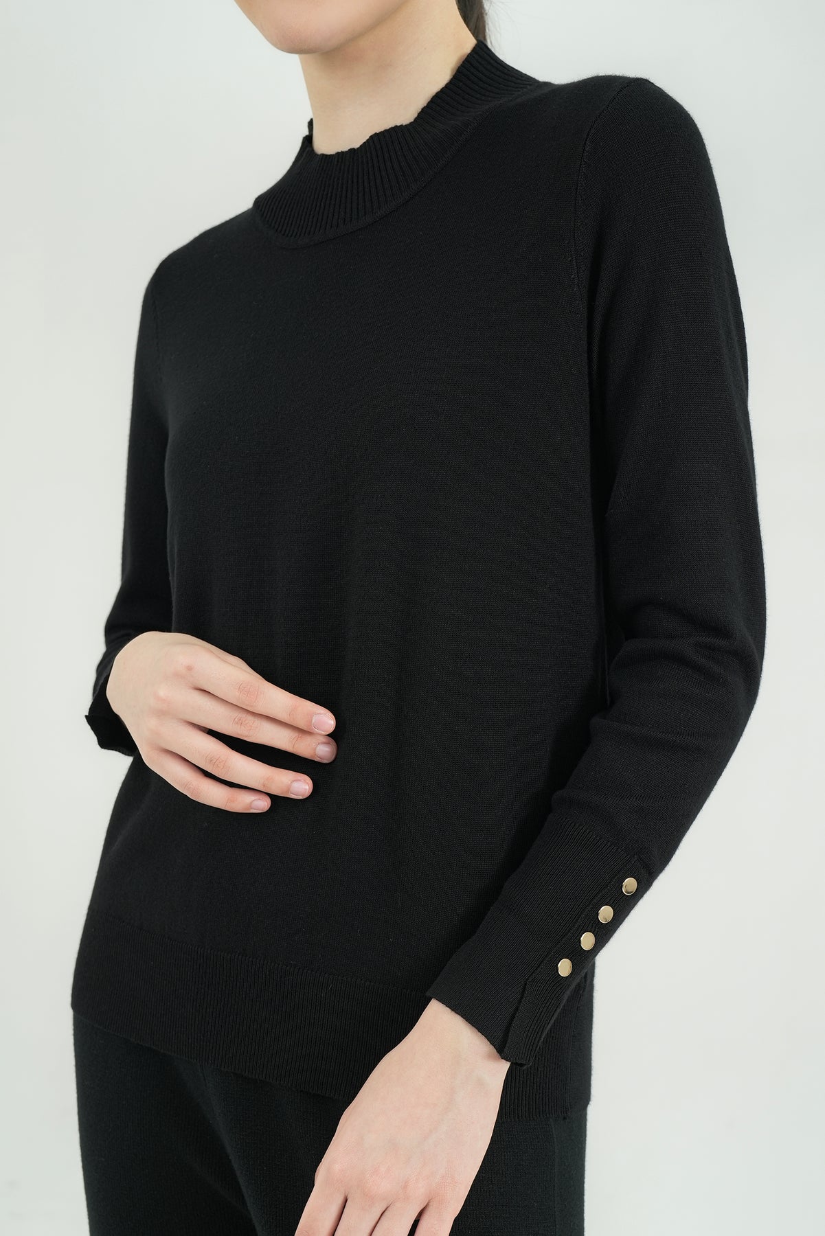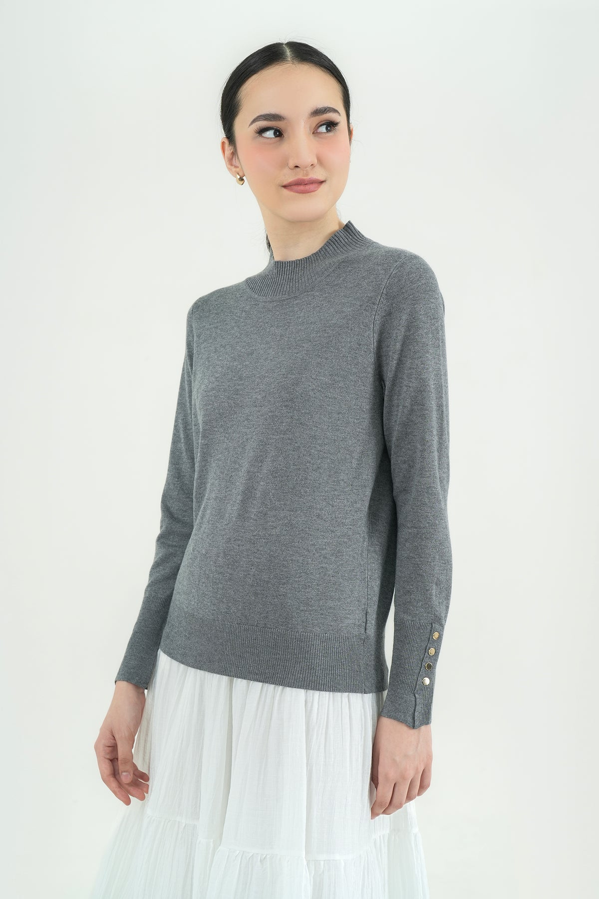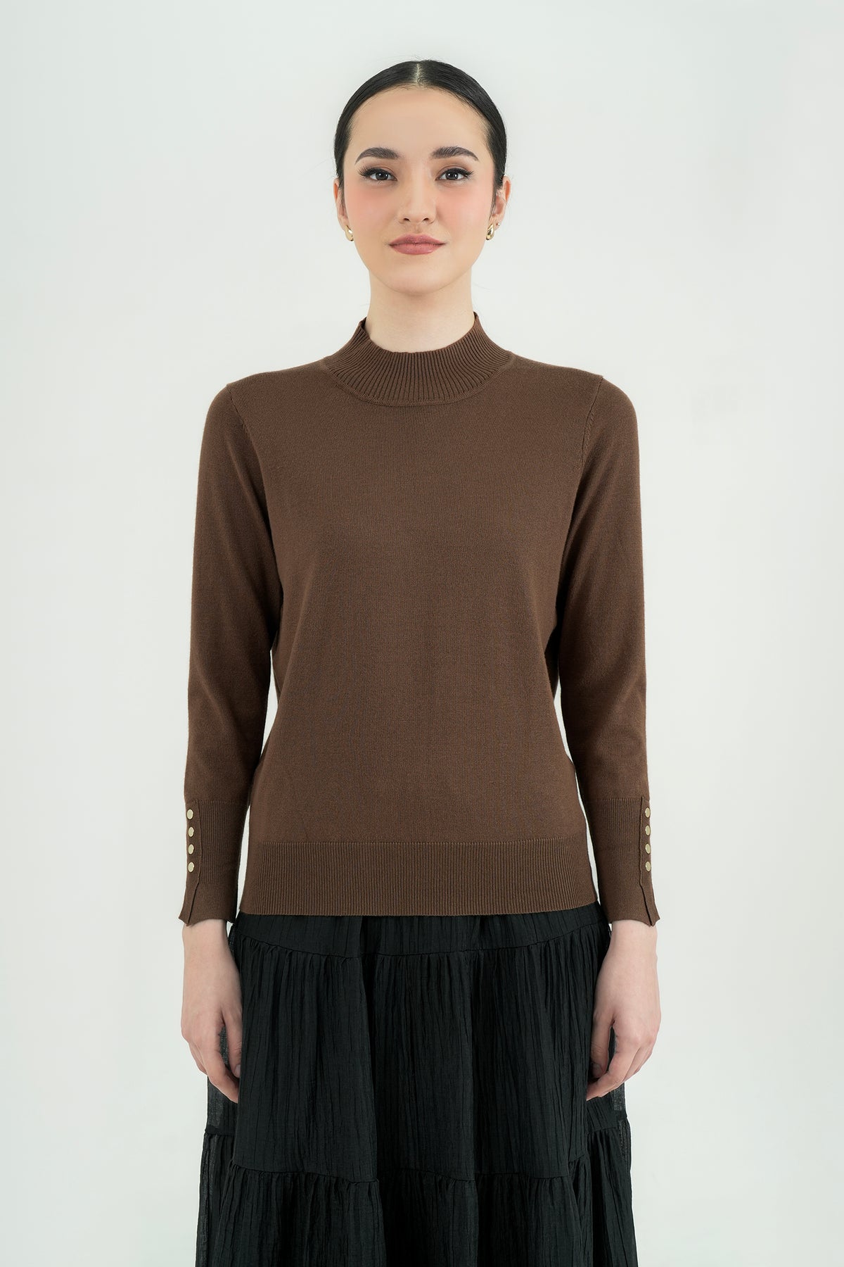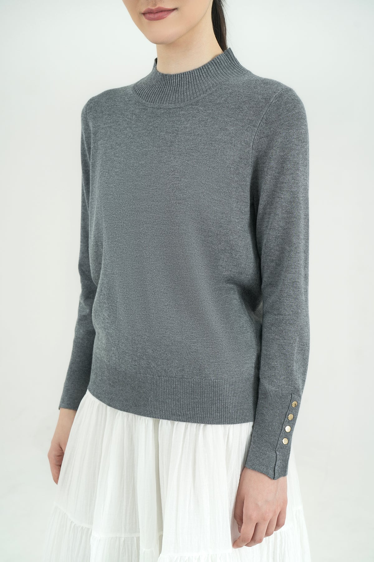 Top rajut berbahan premium cotton knit yang lembut, ringan, dan nyaman di kulit. Hadir dengan desain mock-neck yang clean serta detail kancing gold pada lengan sebagai aksen classy. Cutting-nya fit namun tetap fleksibel dipakai seharian, cocok untuk tampilan kasual maupun kerja. Mudah dipadu-padankan dengan rok ataupun celana favoritmu.