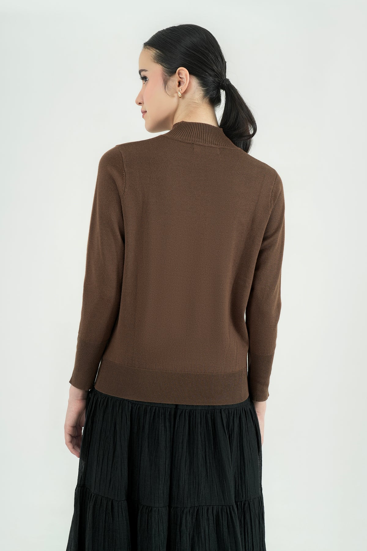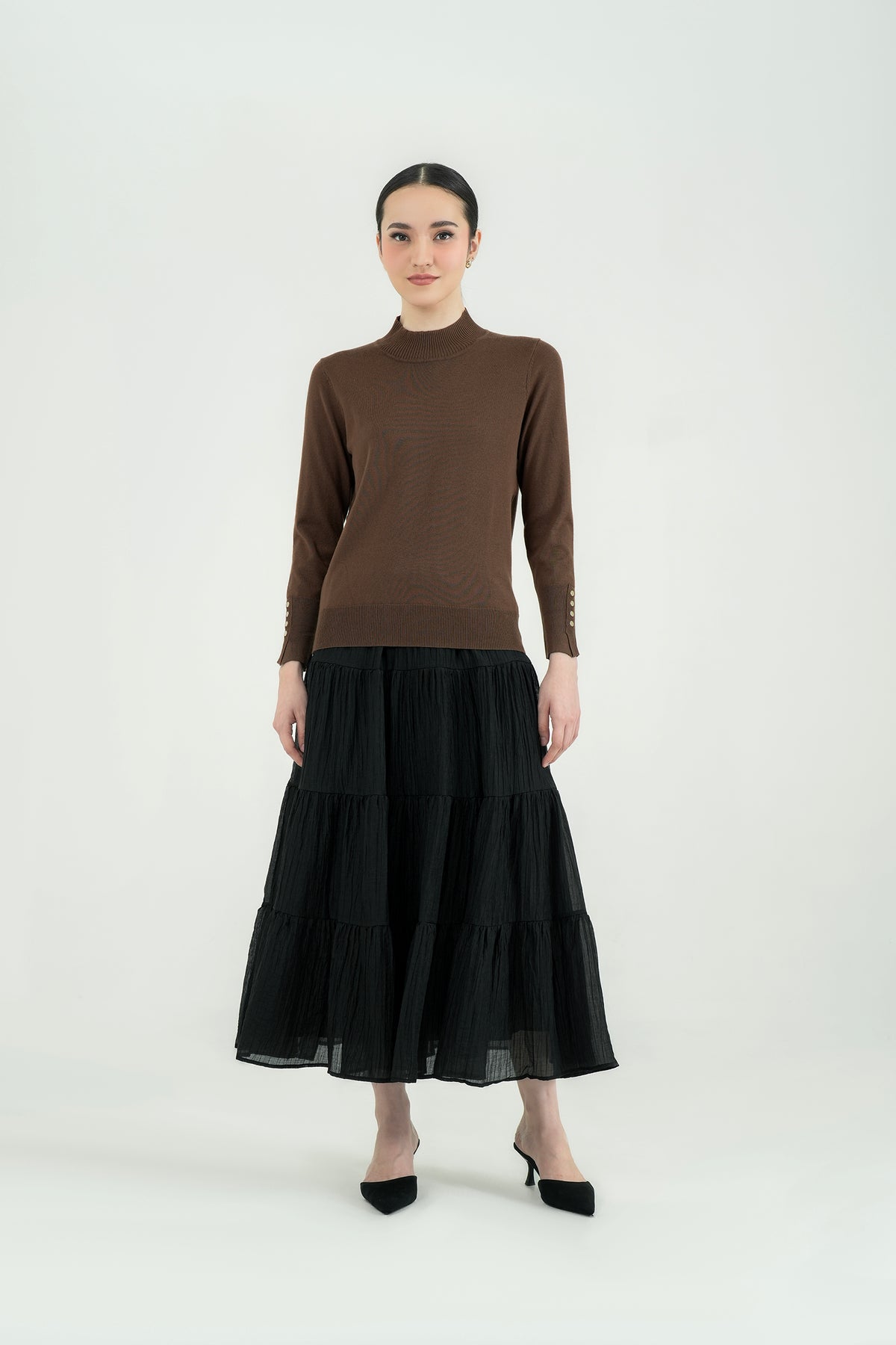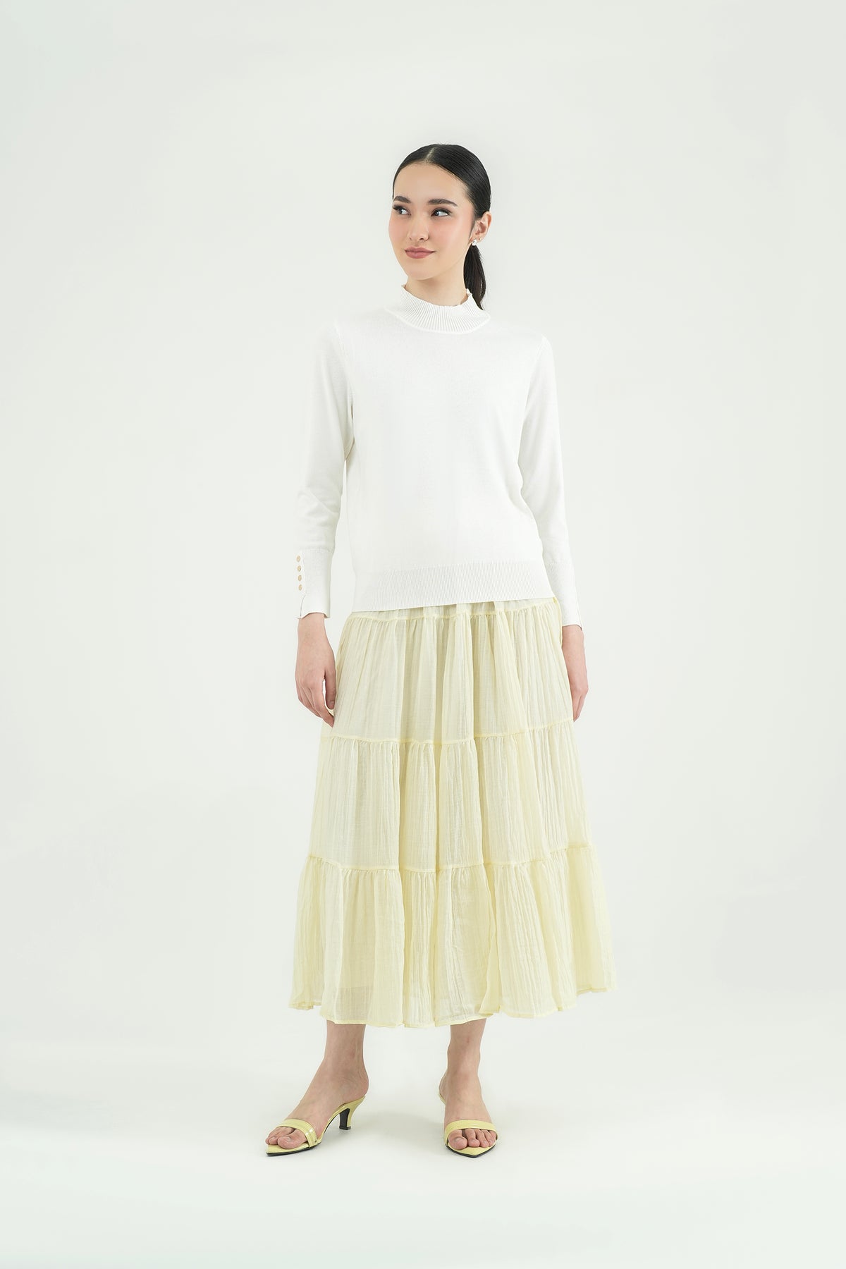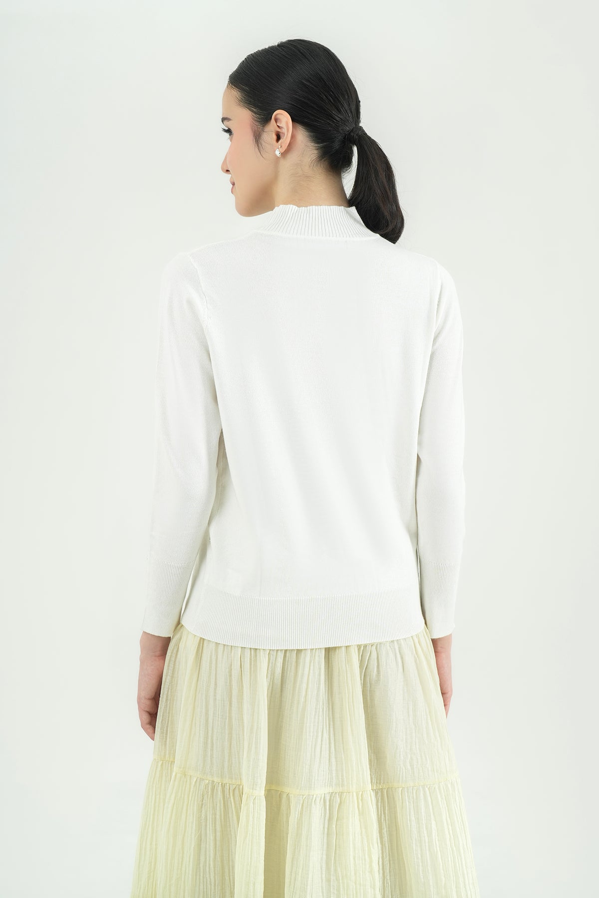 Top rajut berbahan premium cotton knit yang lembut, ringan, dan nyaman di kulit. Hadir dengan desain mock-neck yang clean serta detail kancing gold pada lengan sebagai aksen classy. Cutting-nya fit namun tetap fleksibel dipakai seharian, cocok untuk tampilan kasual maupun kerja. Mudah dipadu-padankan dengan rok ataupun celana favoritmu.