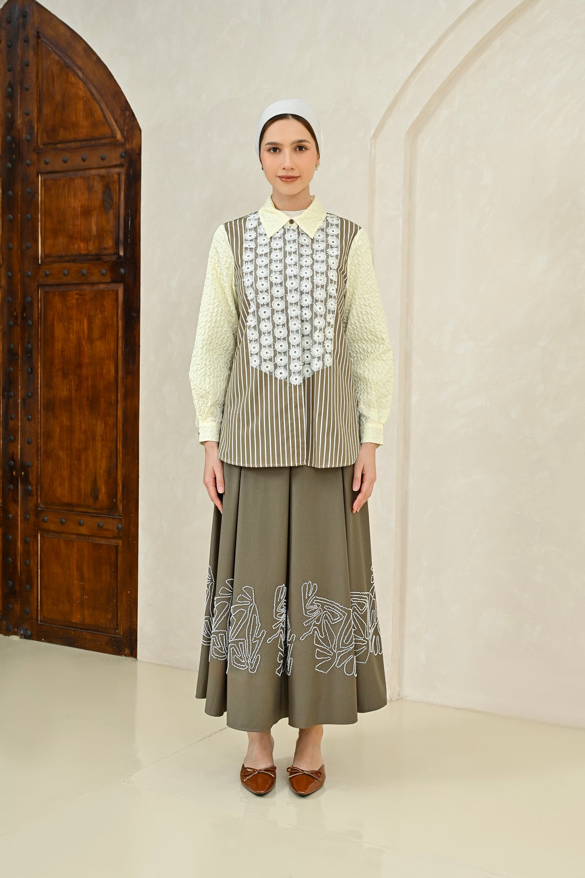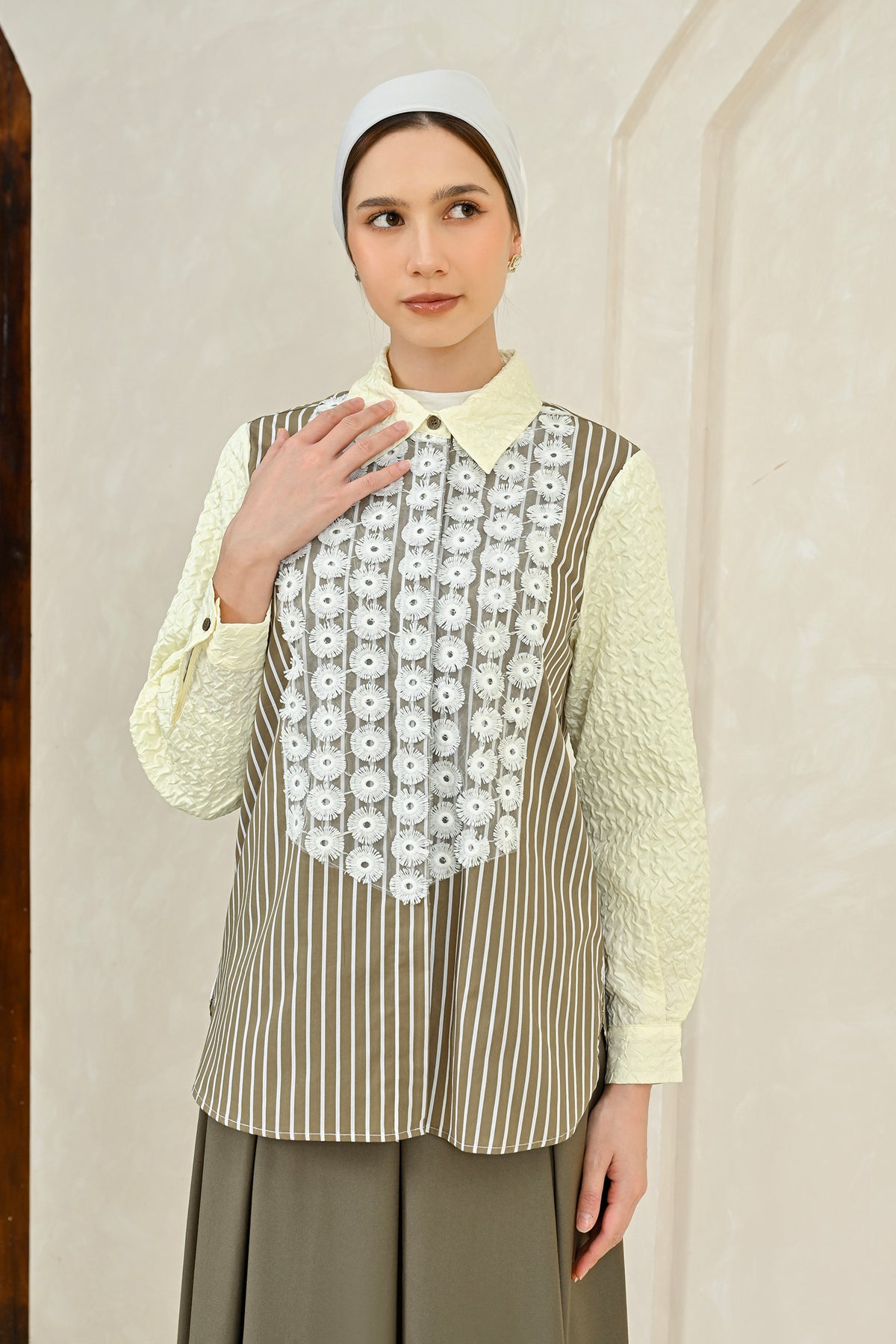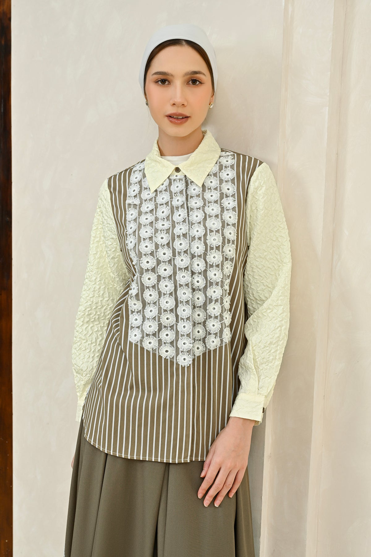 Atasan dengan siluet rapi dan detail embroidery geometris yang halus, dipadukan dengan permainan motif yang lembut. Menghadirkan kesan berkelas dan modern, sempurna untuk momen special.