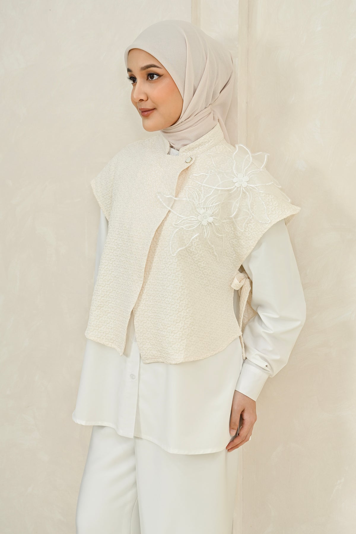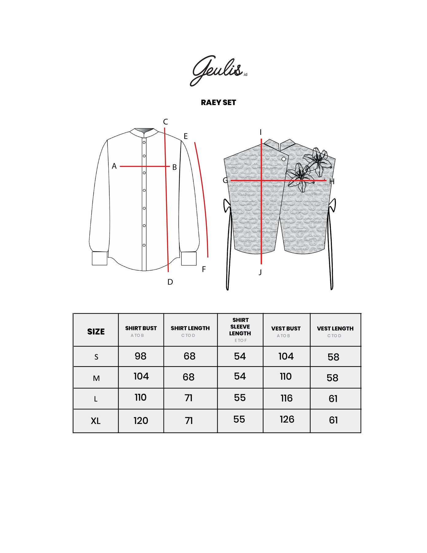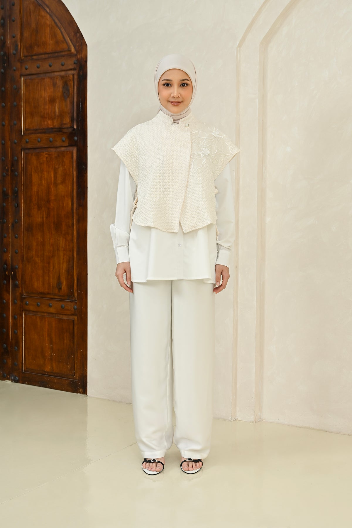 Set dua potong bernuansa putih gading yang memadukan atasan bertekstur dengan detail embroidery floral halus dan inner yang clean. Dirancang dengan siluet rapi dan jatuh lembut, menghadirkan tampilan tenang, elegan, dan effortless untuk momen Raya.