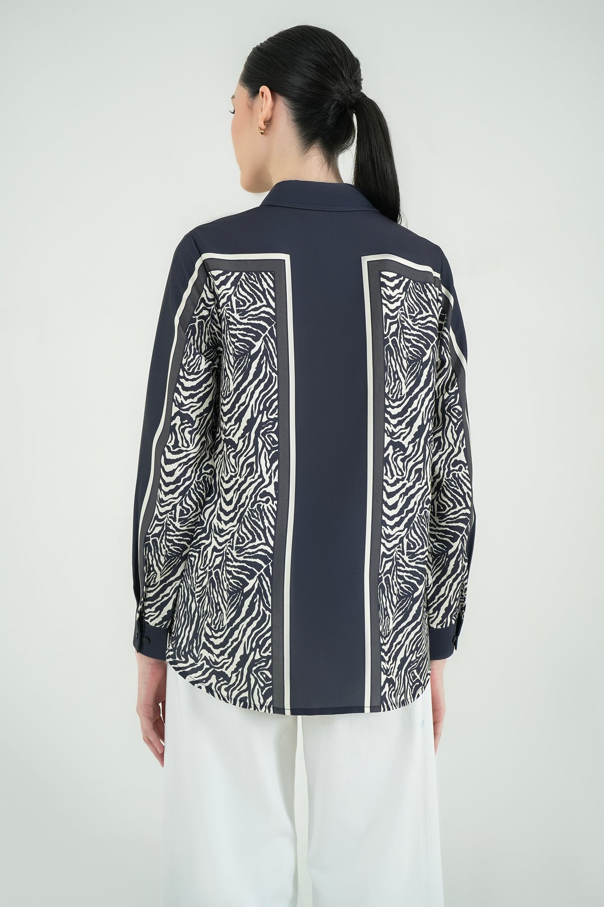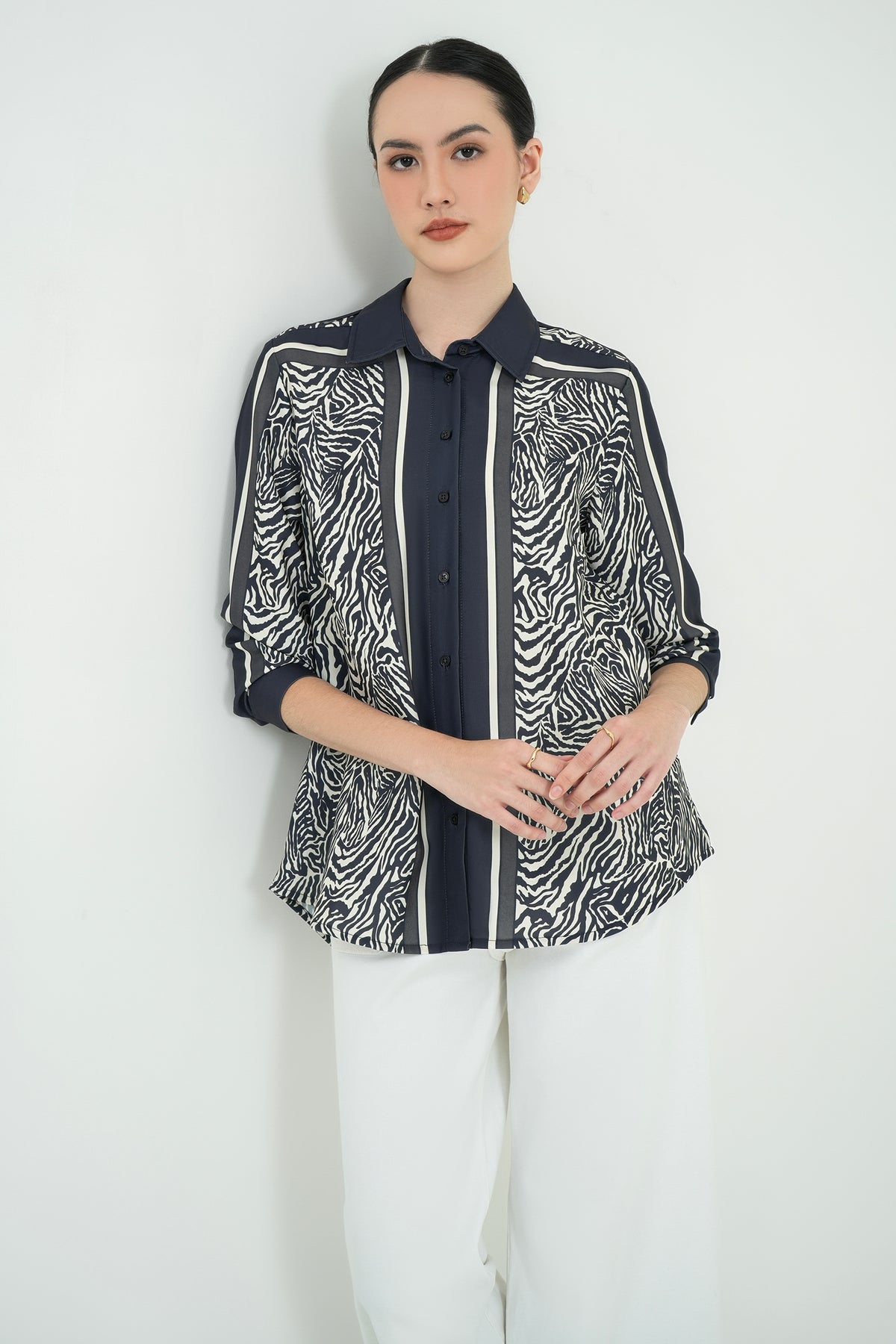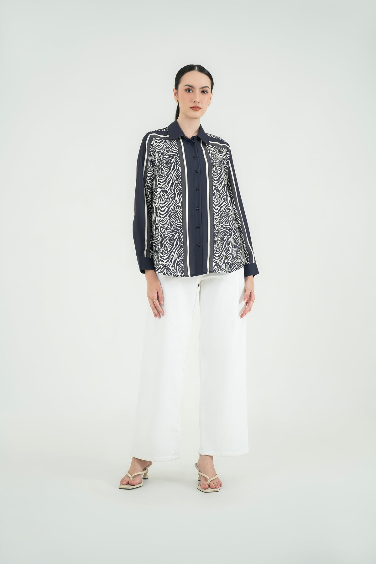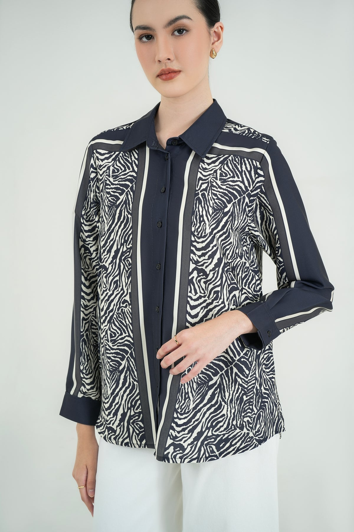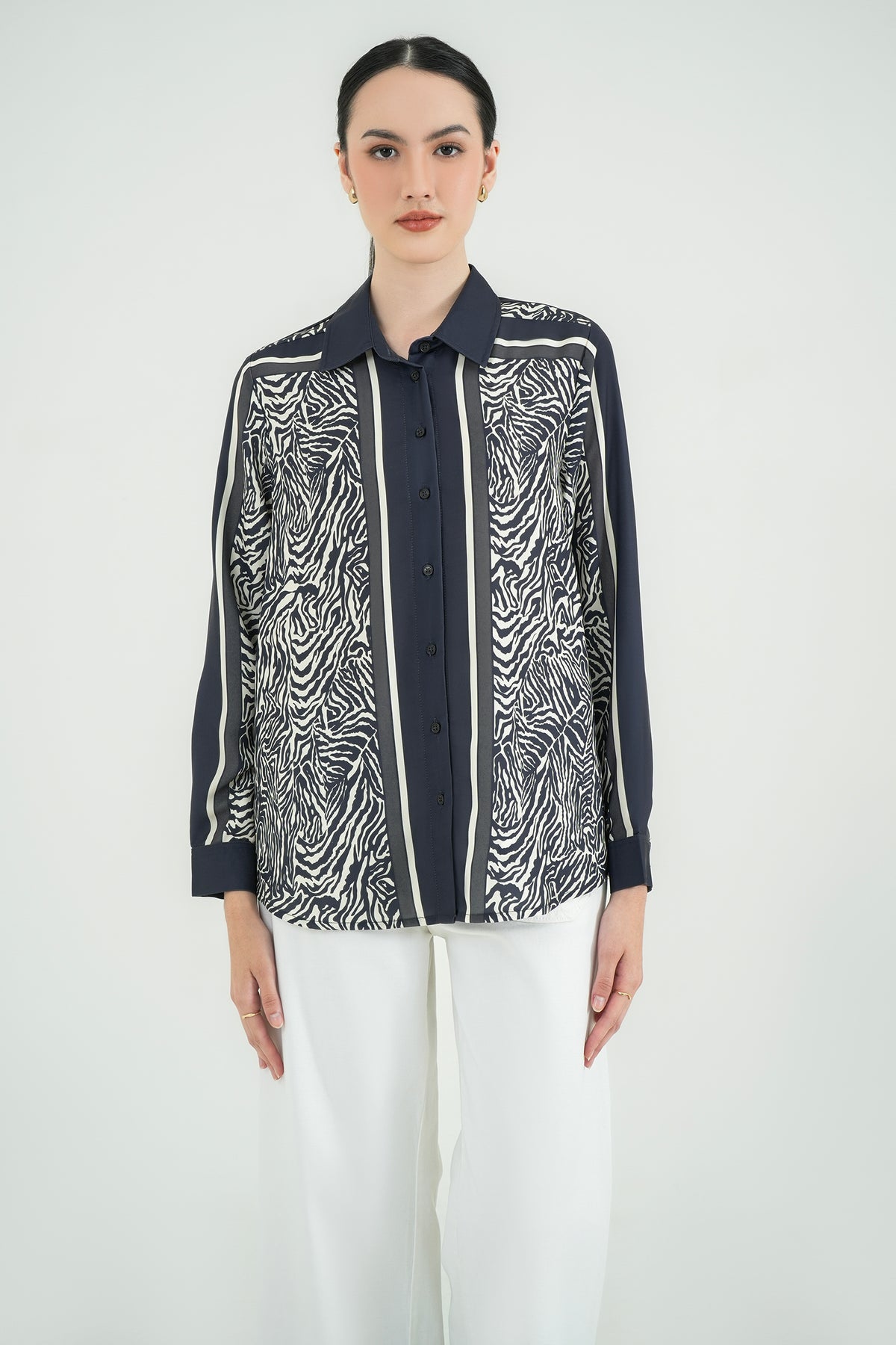 Kemeja motif dengan kombinasi garis dan animal print yang bold namun tetap elegan. Terbuat dari fine poly twill, bahan premium yang halus, ringan, dan jatuhnya rapi tanpa mudah kusut. Teksturnya sedikit glossy, memberi kesan polished dan modern. Cutting relaxed sehingga nyaman dipakai seharian, cocok untuk office look maupun acara semi-formal.